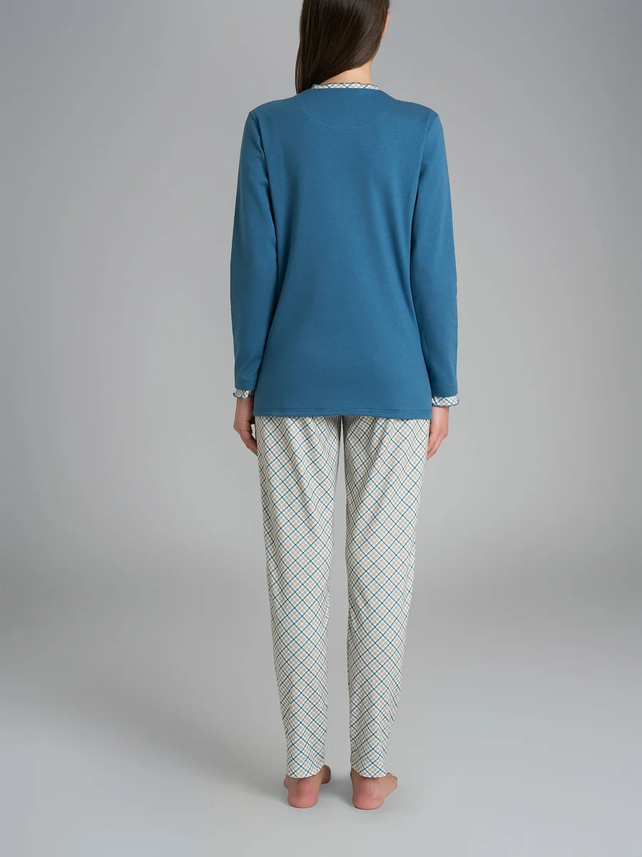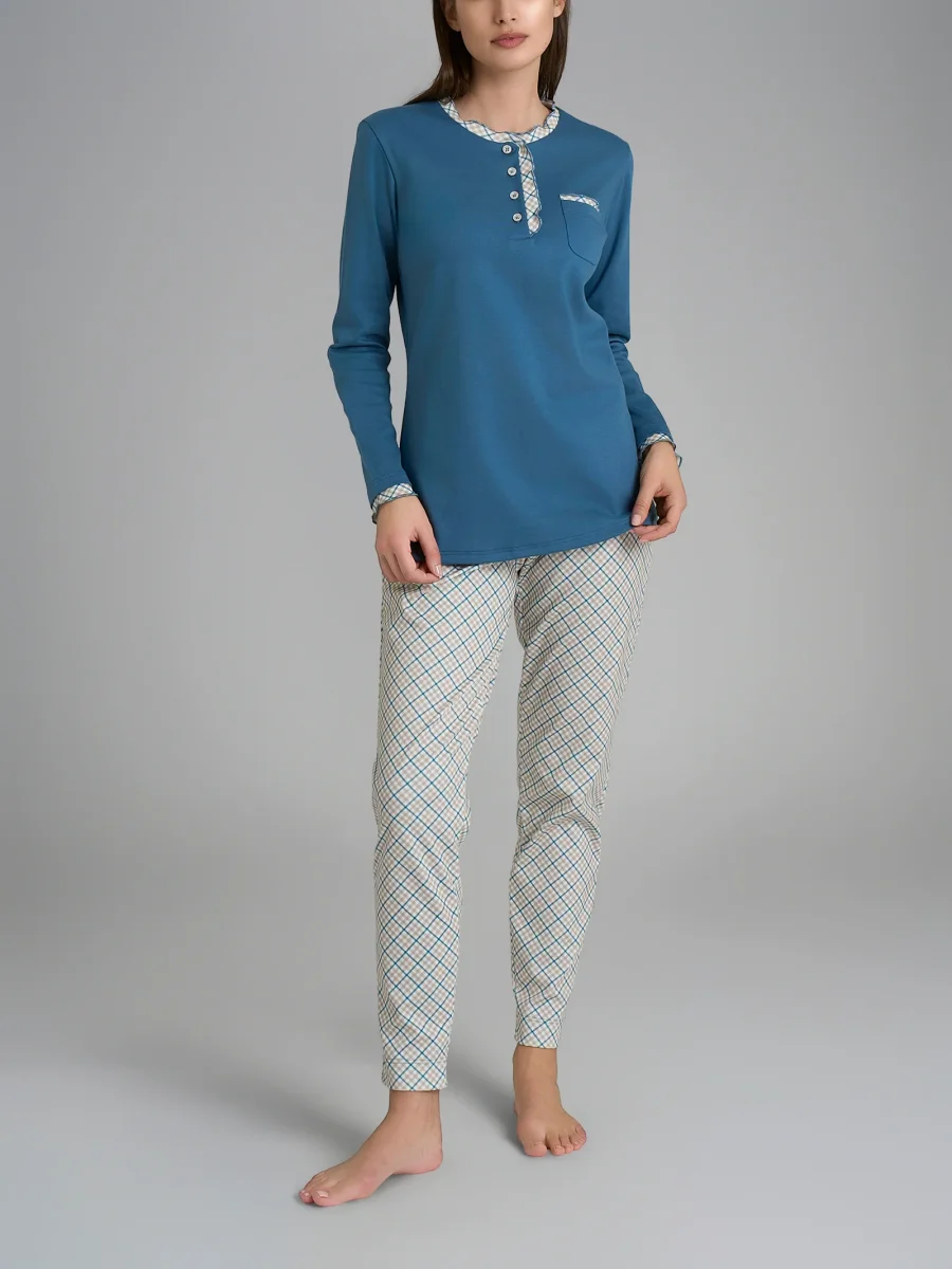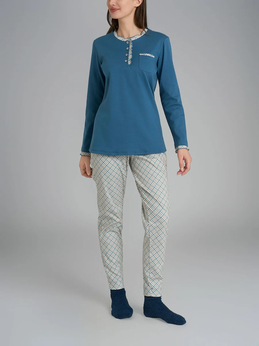 Realizzato in caldo cotone interlock, questo pigiama garantisce una piacevole sensazione di morbidezza e calore. Questo capo è il compagno ideale per accompagnarti con grazia e stile in ogni momento, che sia una tranquilla notte invernale o un’intera giornata a casa all’insegna del relax questo capo fa al caso tuo.