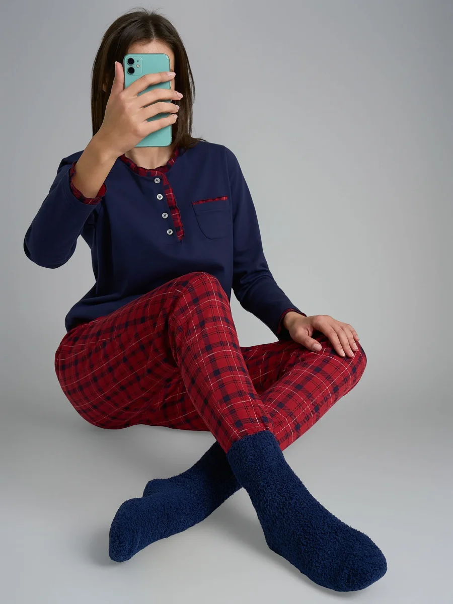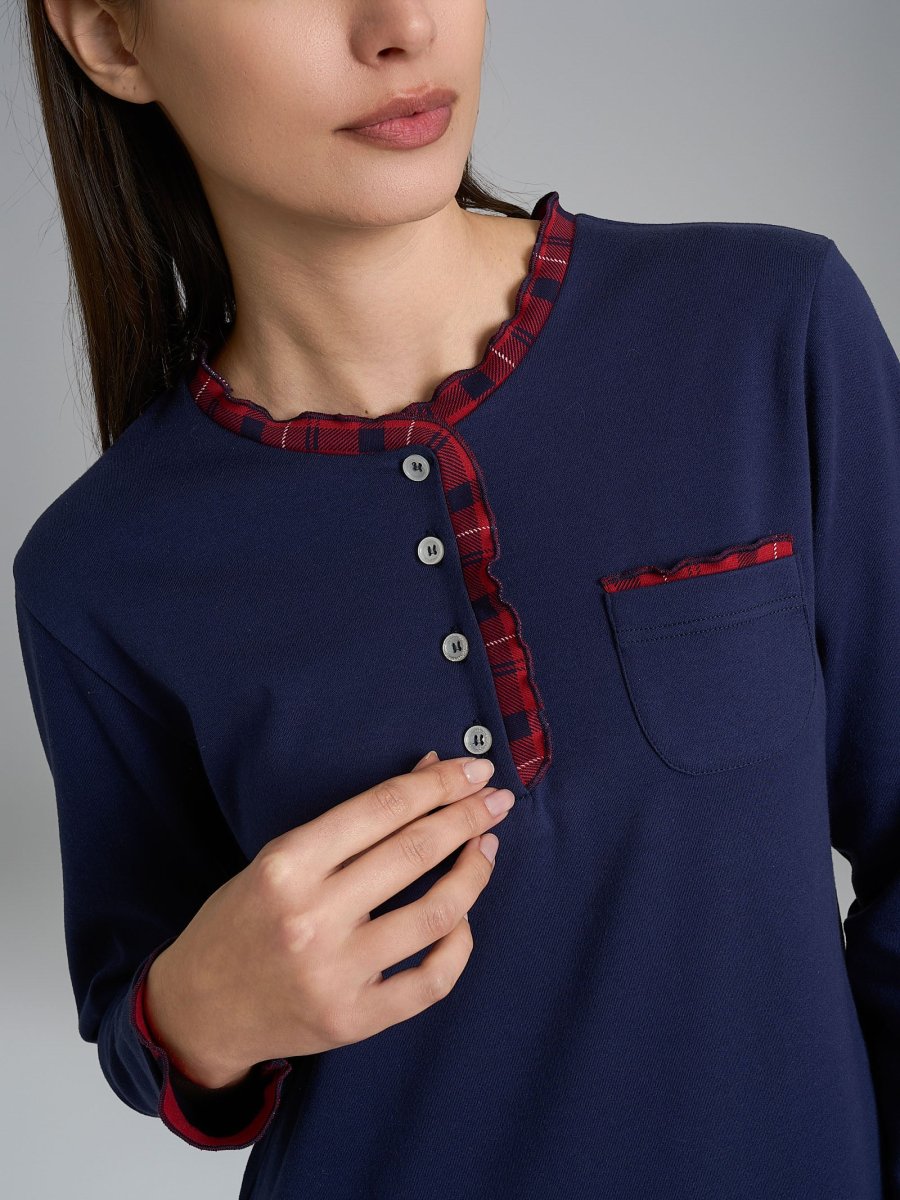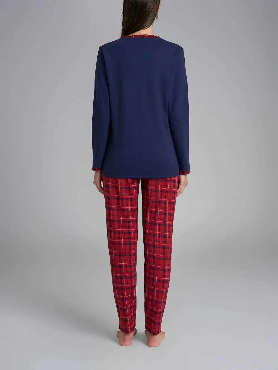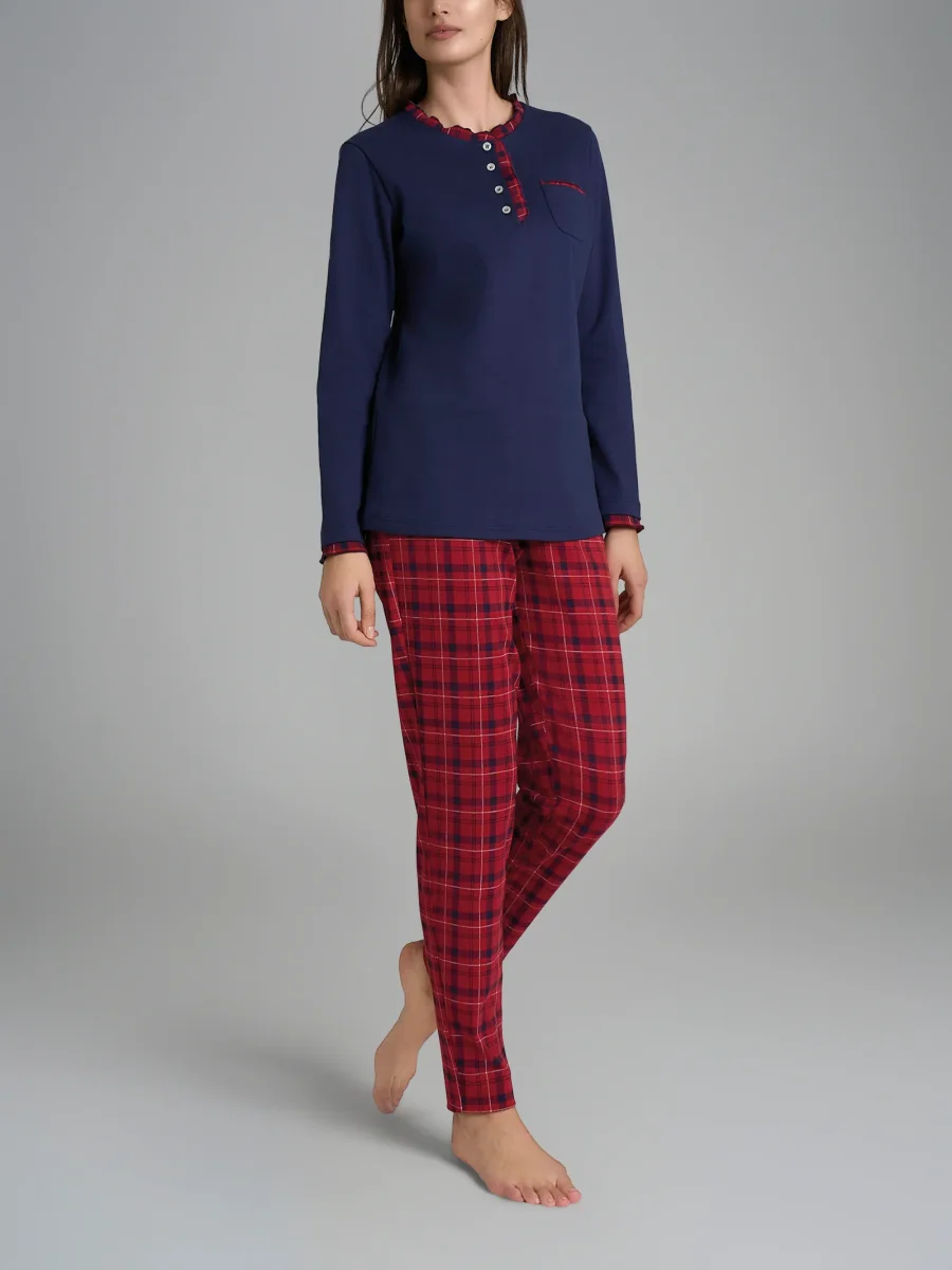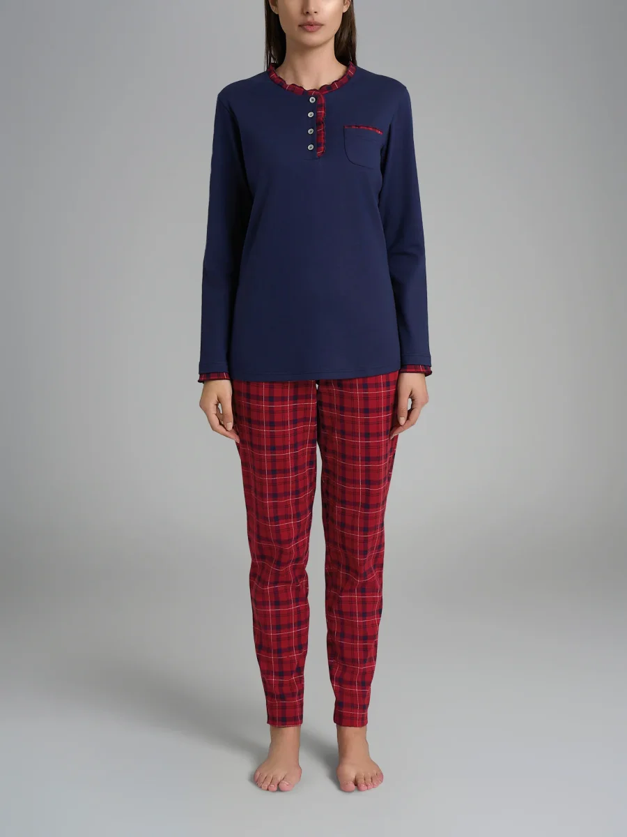 Realizzato in caldo cotone interlock, questo pigiama garantisce una piacevole sensazione di morbidezza e calore. Questo capo è il compagno ideale per accompagnarti con grazia e stile in ogni momento, che sia una tranquilla notte invernale o un’intera giornata a casa all’insegna del relax questo capo fa al caso tuo.