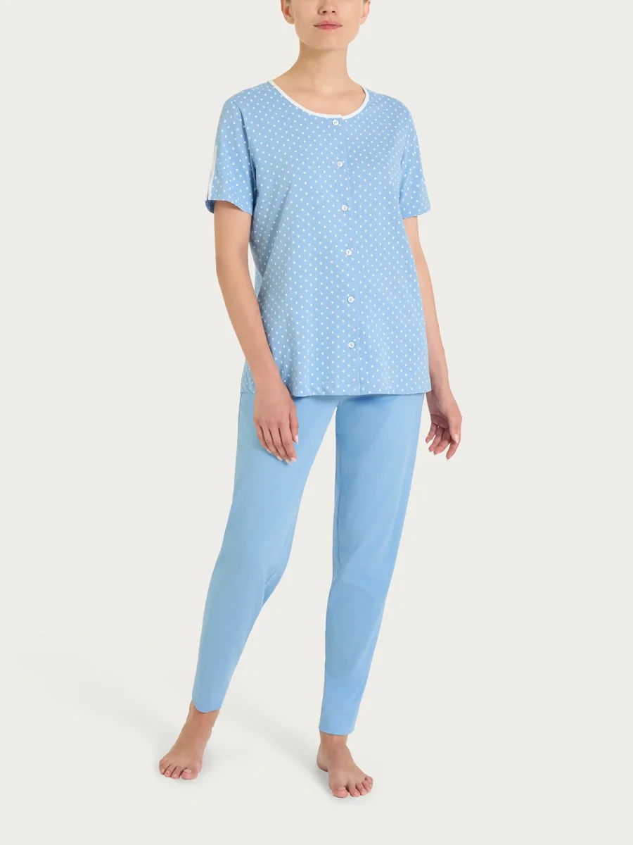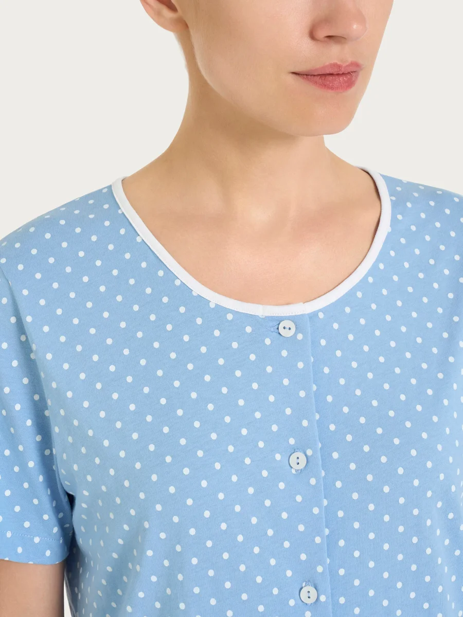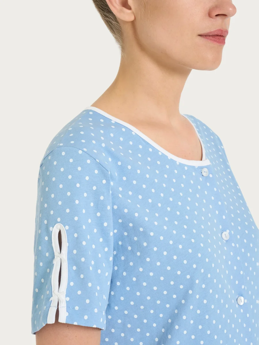 La casacca a pois è rifinita da un girocollo con bordino tinta unita, che illumina il design e lo rende subito più curato. L’apertura frontale con bottoni aggiunge funzionalità e rende l’indosso semplice e veloce, perfetto per il relax quotidiano.