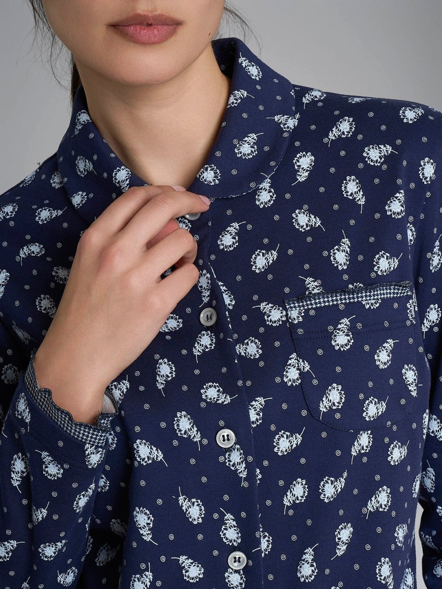Questo pigiama lungo da donna a manica lunga si distingue per la casacca aperta con colletto, arricchita da pratici bottoni che rendono semplice indossarlo e toglierlo, garantendo libertà di movimento.