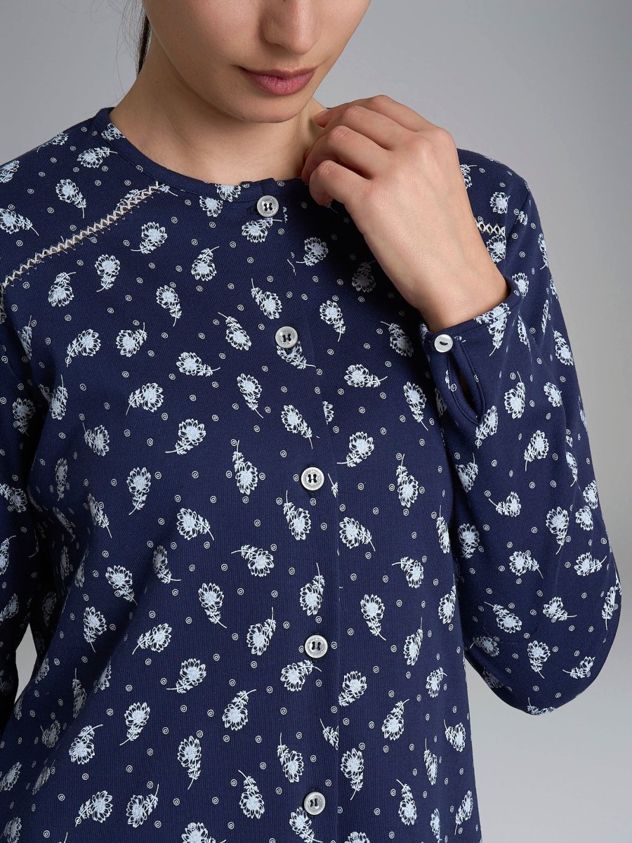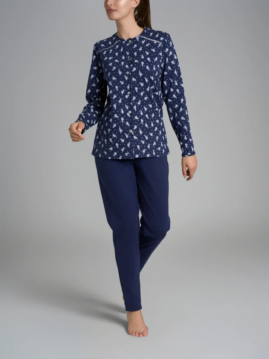 Questo pigiama lungo da donna a manica lunga si caratterizza per la sua casacca aperta con una raffinata cucitura con punto croquette che seguendo la forma delle spalle scende delicatamente definendone la forma. I bottoni consentono una facile apertura e chiusura, facilitando l’indosso e la rimozione donando una libertà di movimento.