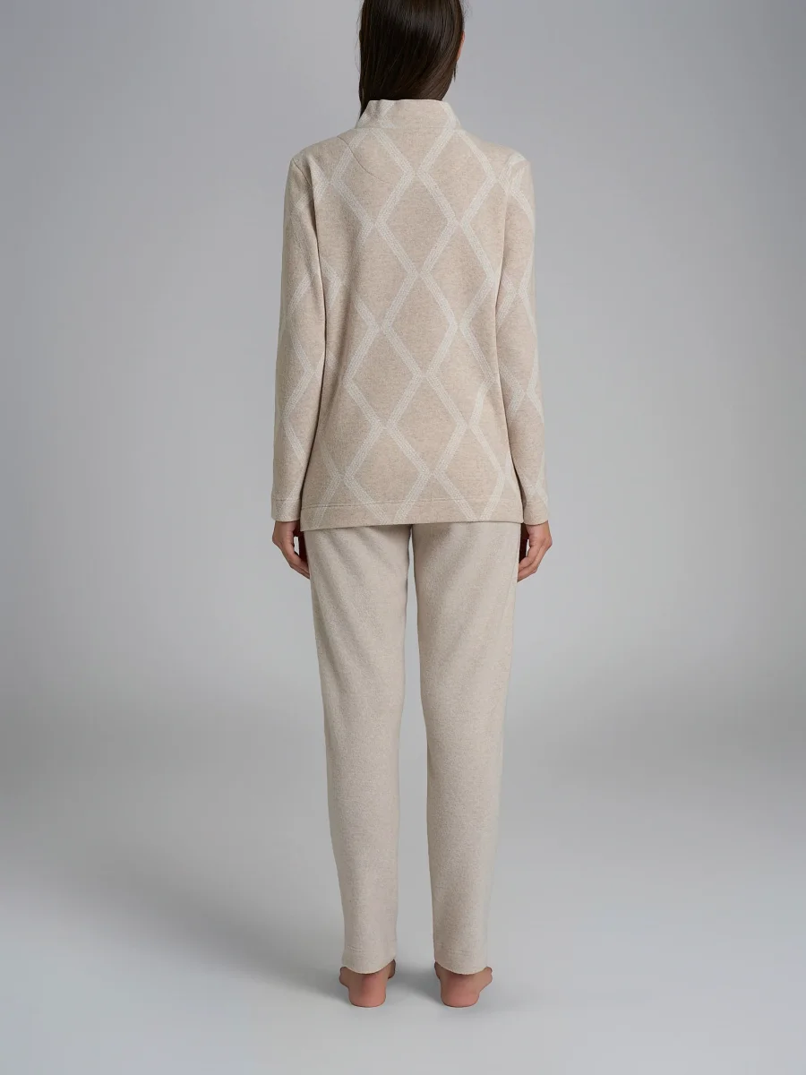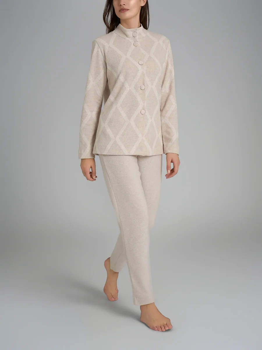 La combinazione di colori delicati dei pantaloni ai design geometrici presenti sulle casacche rende questo pigiama elegante e alla moda, perfetto per una serata rilassante a casa senza rinunciare allo stile.