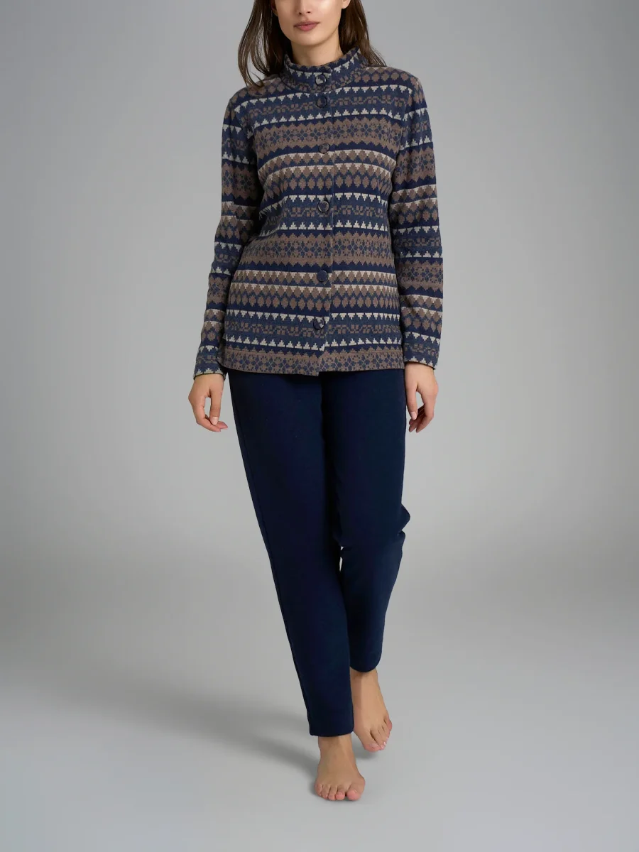 La combinazione di colori delicati dei pantaloni ai design geometrici presenti sulle casacche rende questo pigiama elegante e alla moda, perfetto per una serata rilassante a casa senza rinunciare allo stile.