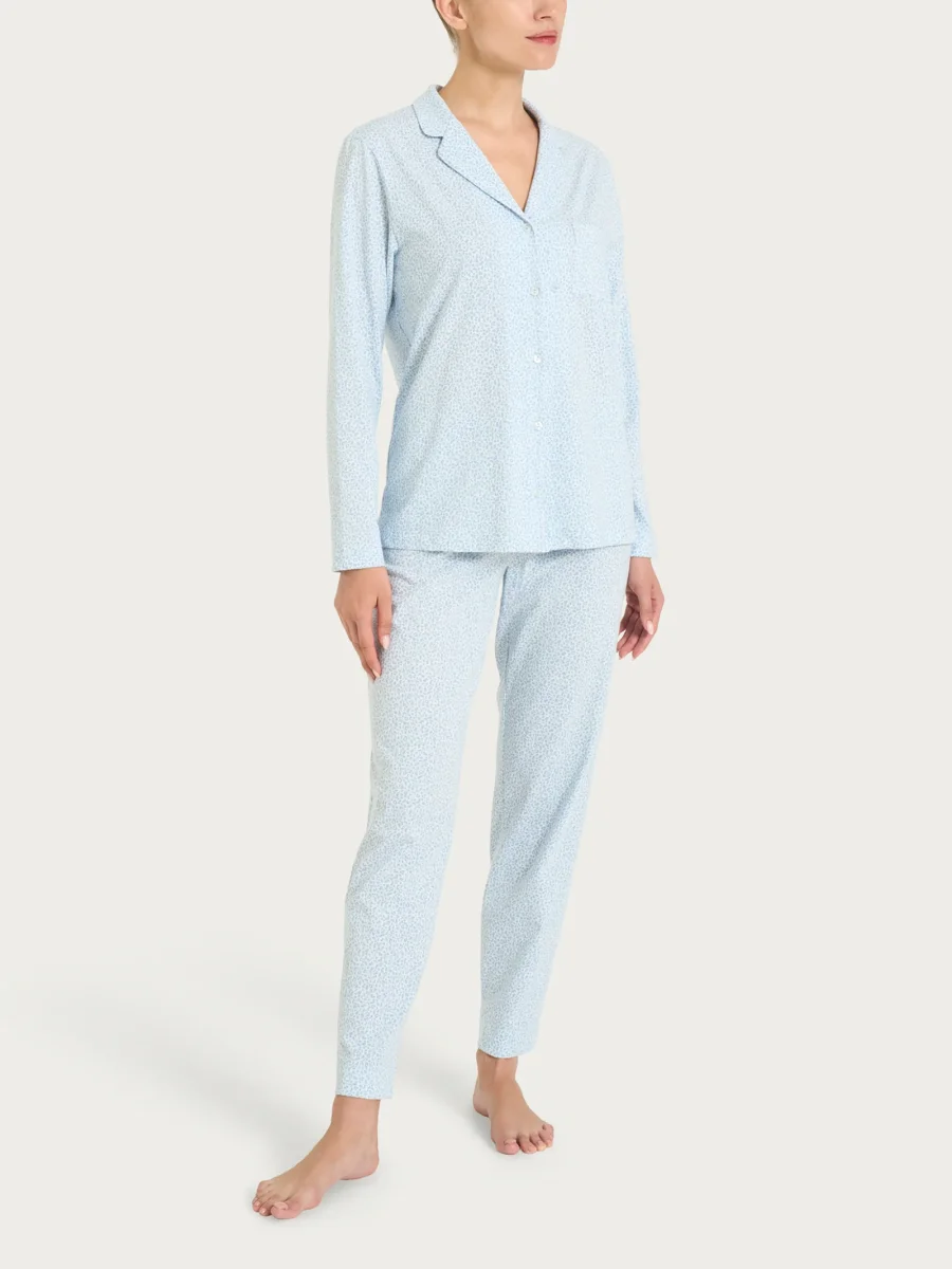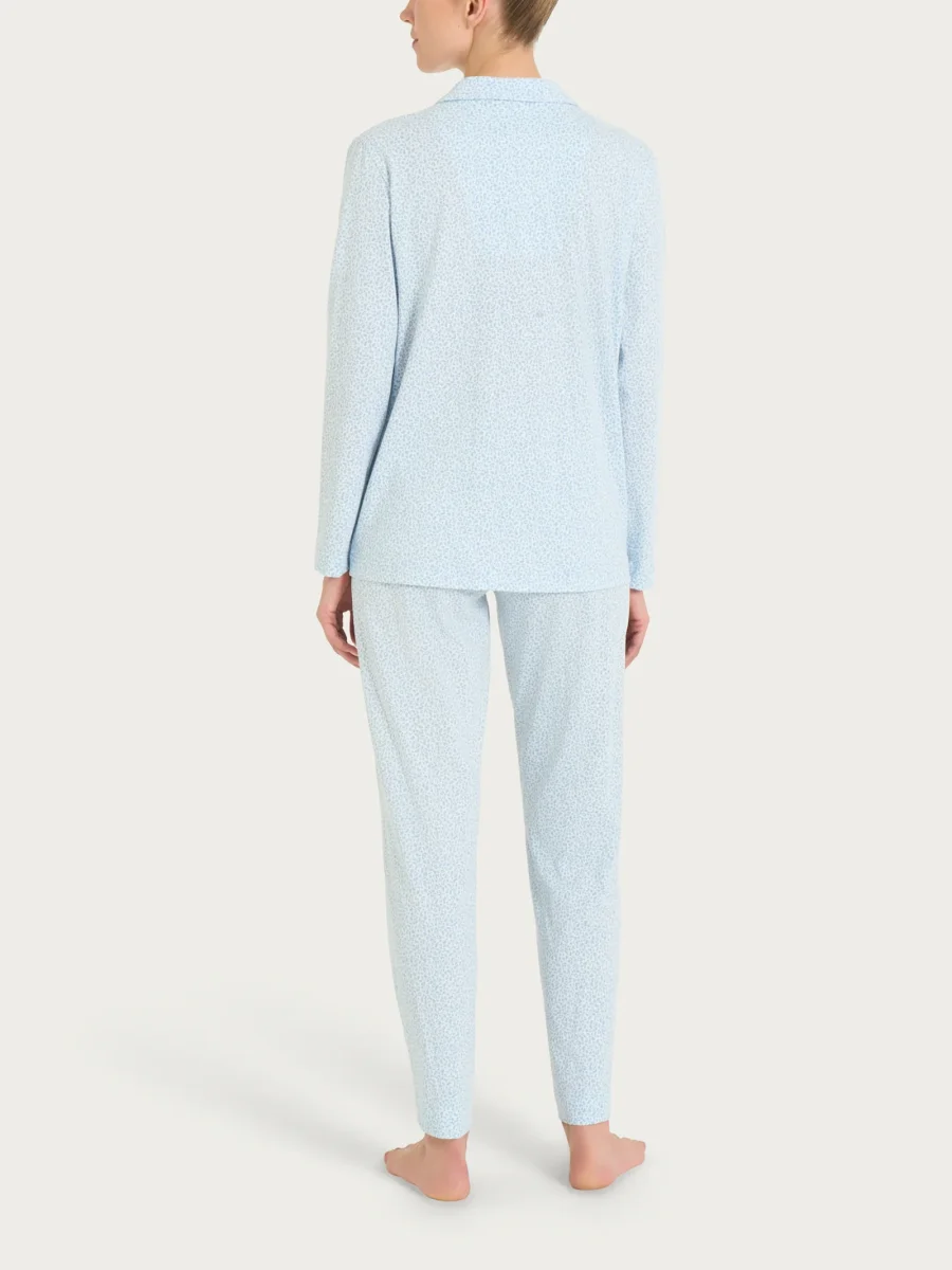 Anche il pantalone riprende la stessa fantasia creando un total look coordinato e armonioso. La vestibilità regular garantisce comfort e libertà di movimento, ideale per riposare e sentirsi a proprio agio per tutta la notte.