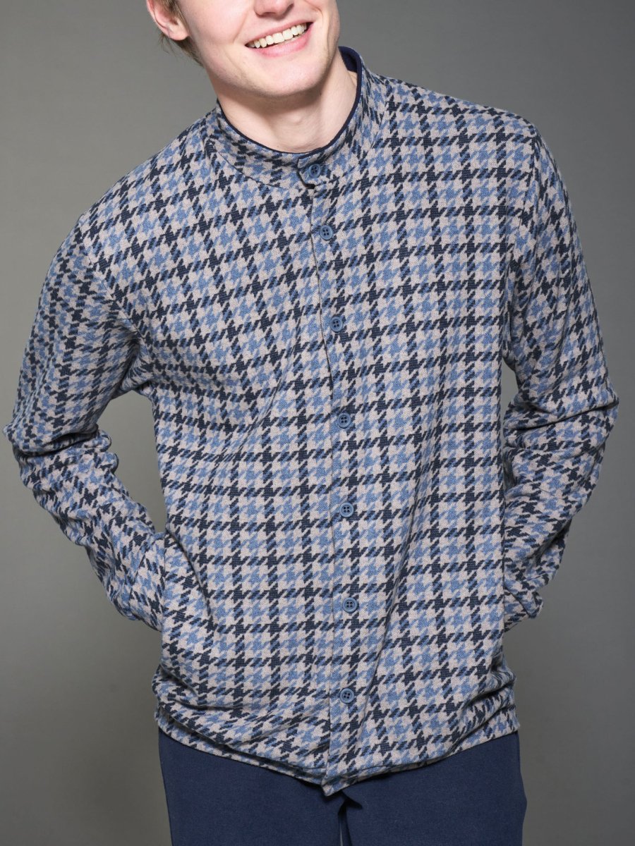 La casacca aperta, con chiusura a bottoni, presenta una delicata fantasia pied de poule, che aggiunge un tocco di stile classico e sofisticato grazie al contrasto che crea l’alternanza dei colori chiari e scuri all’interno della fantasia.