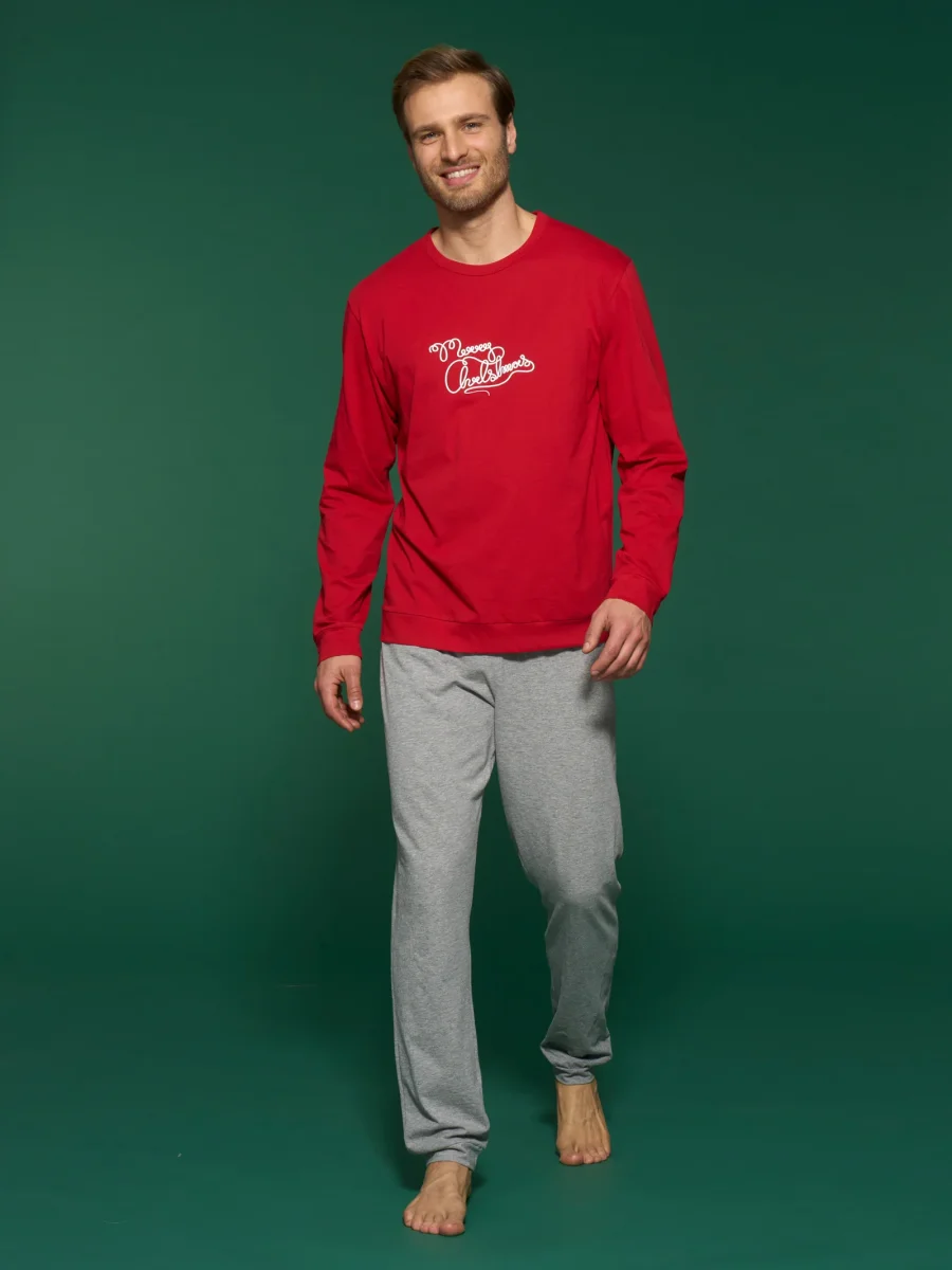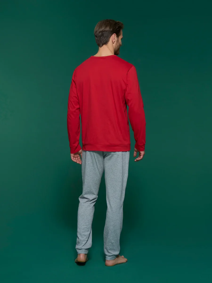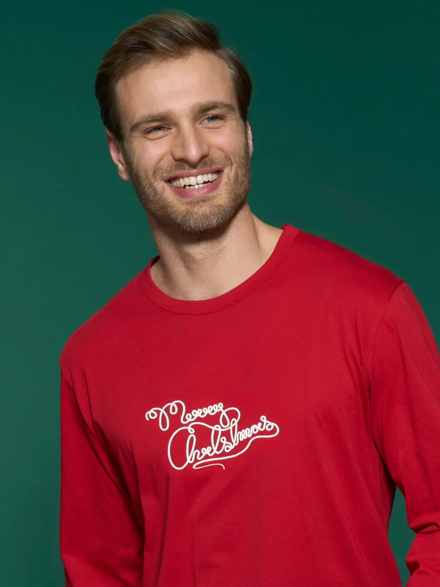 Il pigiama girocollo da uomo con scritta “Buon Natale” è un capo di abbigliamento confortevole e festivo, perfetto per celebrare la stagione natalizia con stile e allegria.