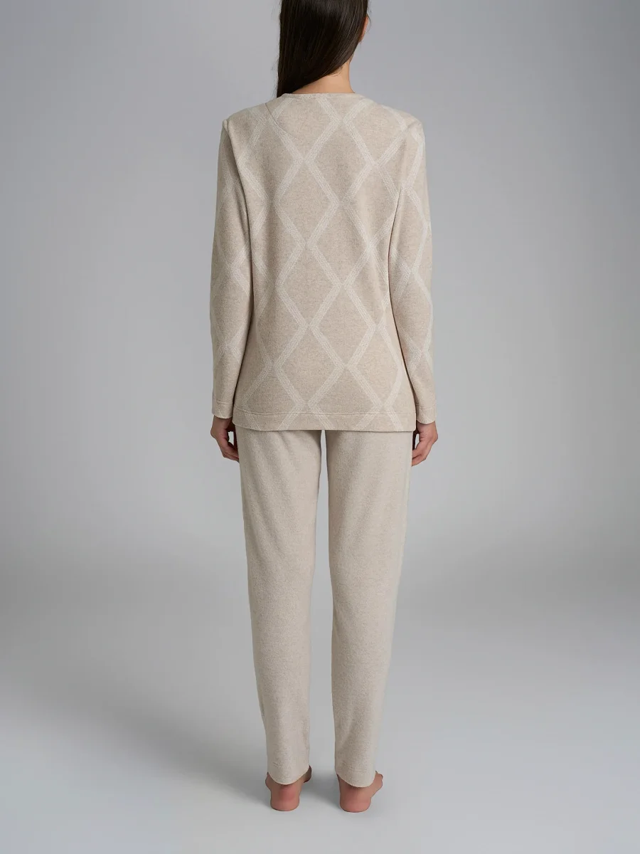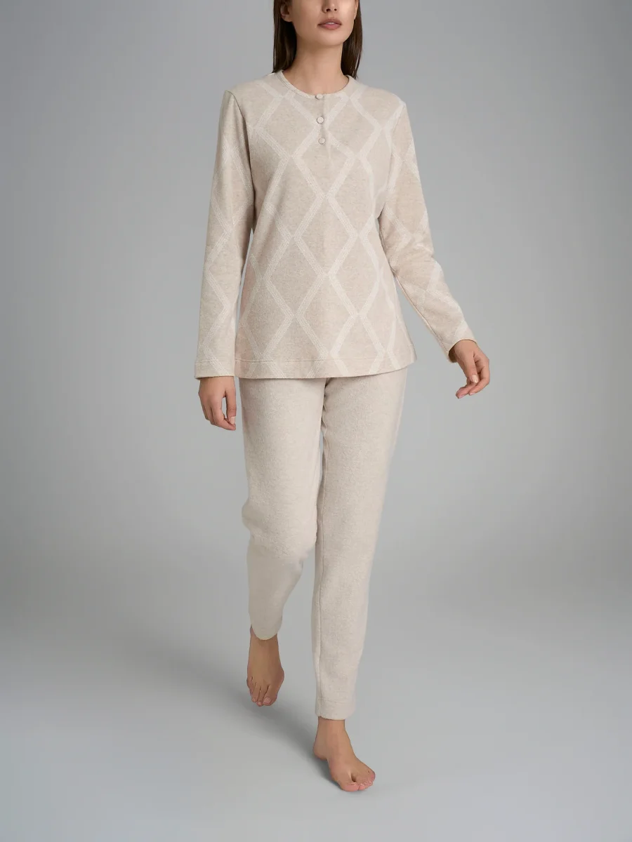 La combinazione di colori delicati dei pantaloni ai design geometrici presenti sulle casacche rende questo pigiama elegante e alla moda, perfetto per una serata rilassante a casa senza rinunciare allo stile.