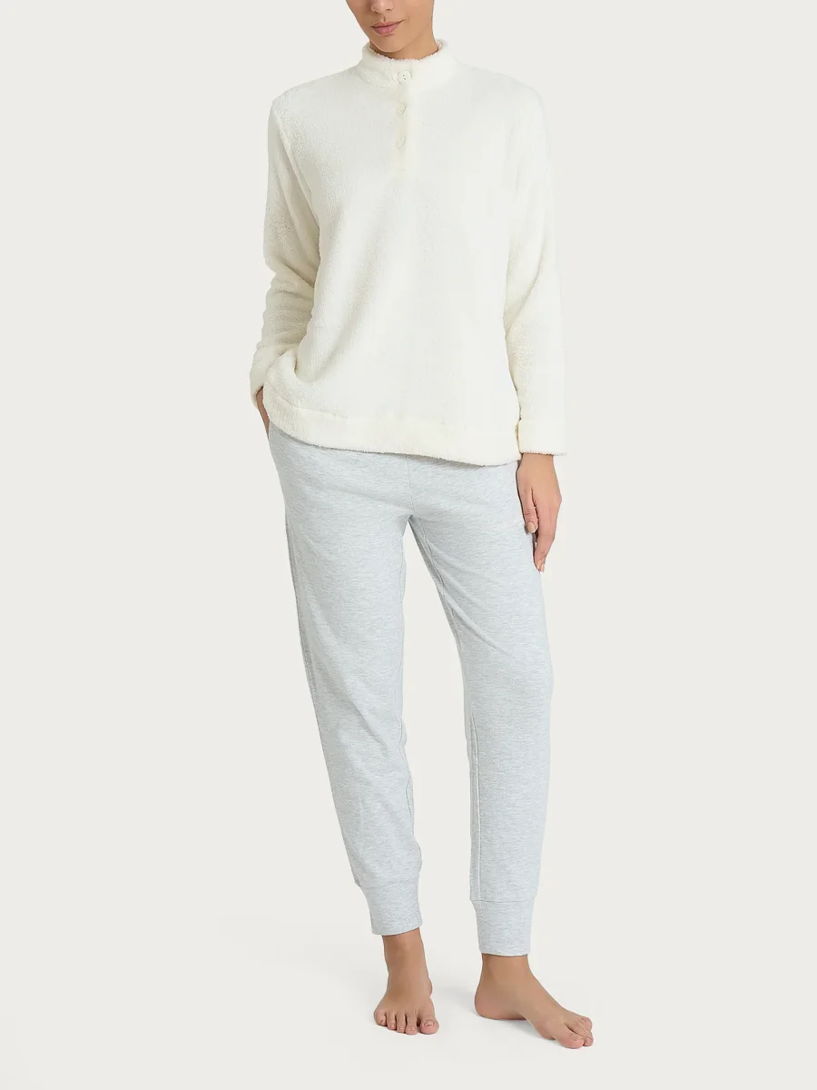 Il pantalone in morbido interlock di cotone ha una pratica tasca sul fianco per rendere il pigiama ancora più pratico pure mantenendo una linea classica. Dotato di un polsino alla caviglia di 8 cm.