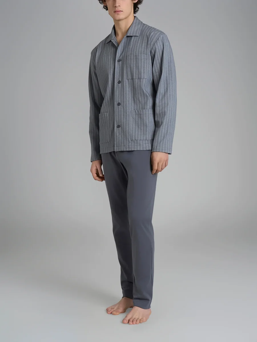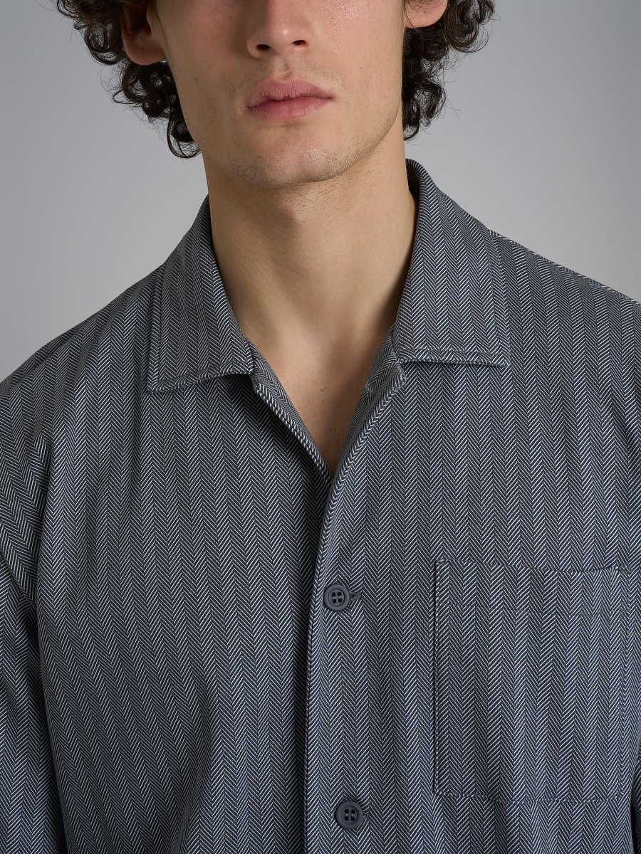 Perfetto per l’uomo che cerca stile anche nei momenti di relax, la casacca con fantasia spigata unisce classe e praticità. Il design moderno e dinamico, combinato con il comfort dei tessuti morbidi, rende questo pigiama ideale per chi desidera sentirsi a proprio agio senza rinunciare a un look curato, anche tra le mura di casa.