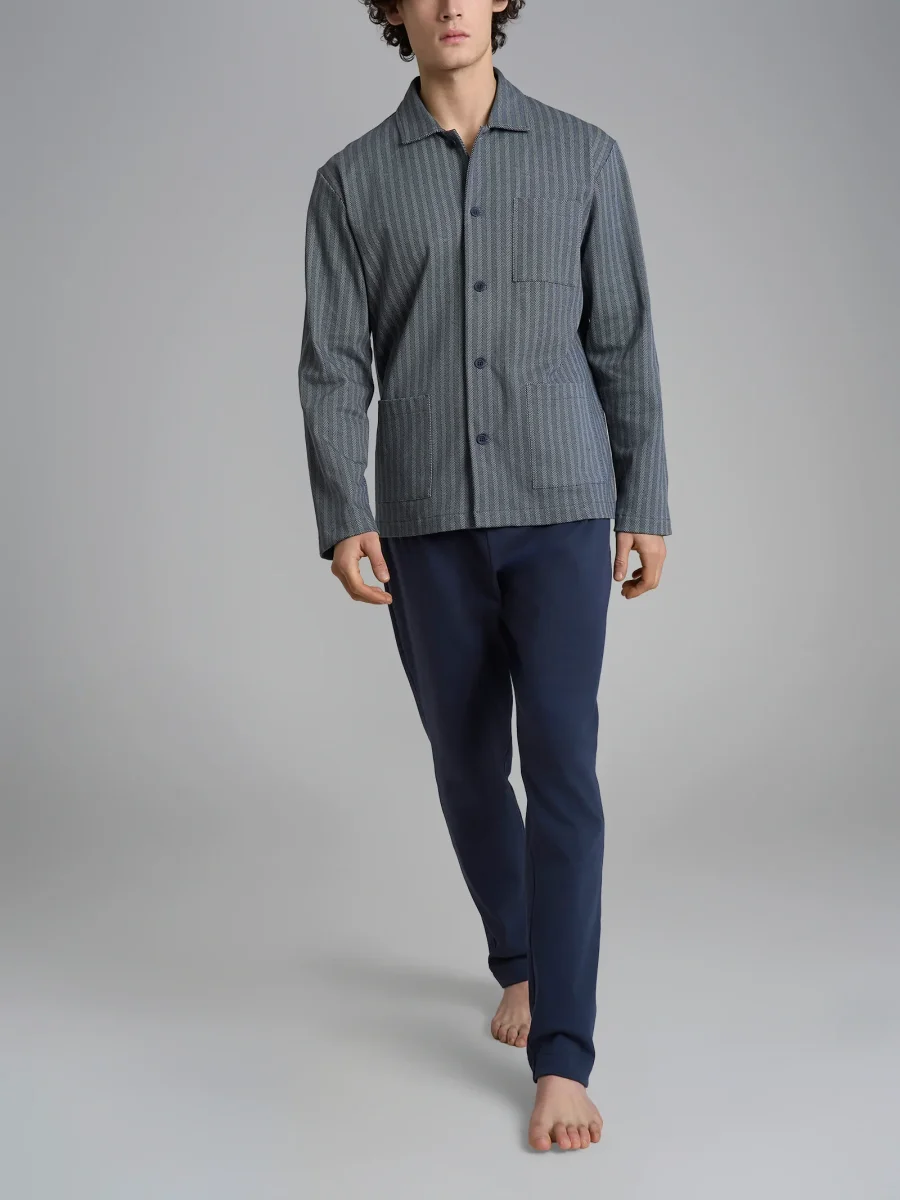 Perfetto per l’uomo che cerca stile anche nei momenti di relax, la casacca con fantasia spigata unisce classe e praticità. Il design moderno e dinamico, combinato con il comfort dei tessuti morbidi, rende questo pigiama ideale per chi desidera sentirsi a proprio agio senza rinunciare a un look curato, anche tra le mura di casa.