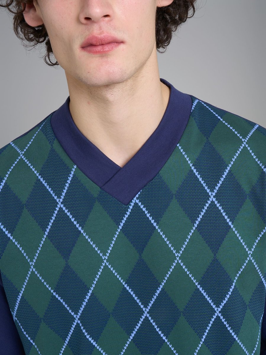 Questo capo è composto da un pantalone tinta unita con pratica tasca posteriore e polsini alla caviglia di 4 cm e da una casacca, che presenta una fantasia tartan con rombi lungo il corpo che che aggiunge personalità e catturano lo sguardo.