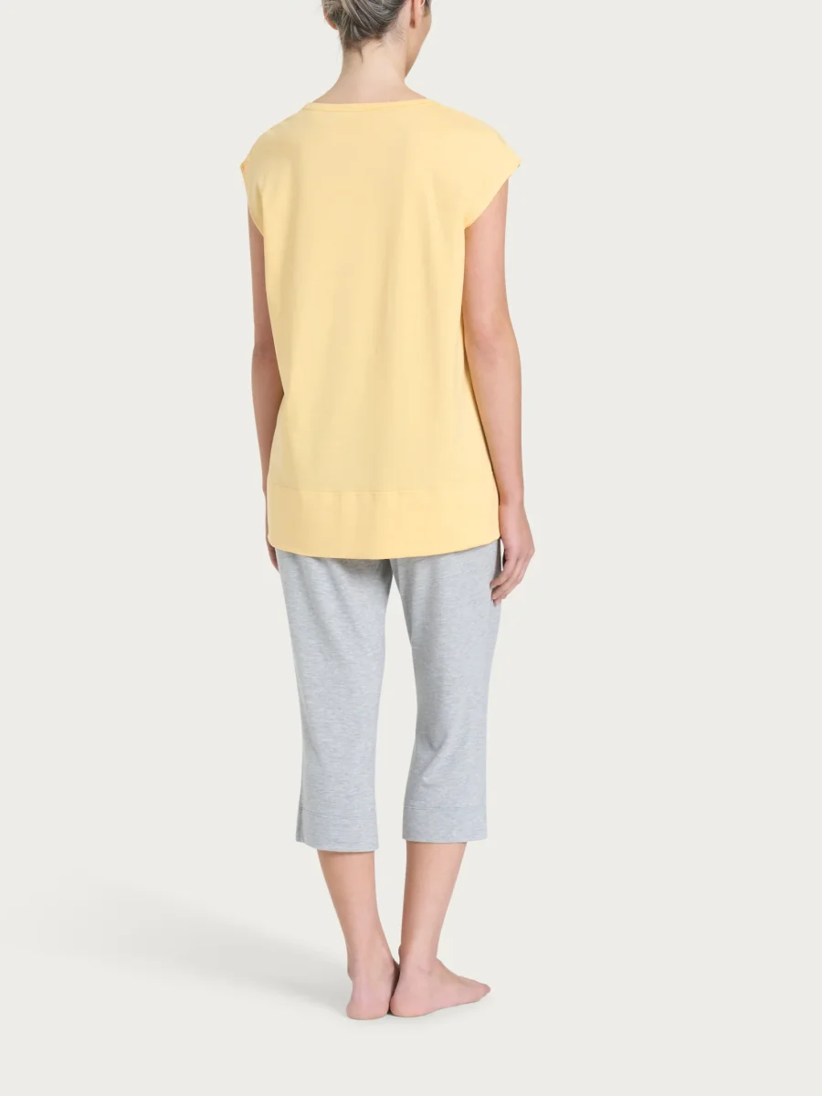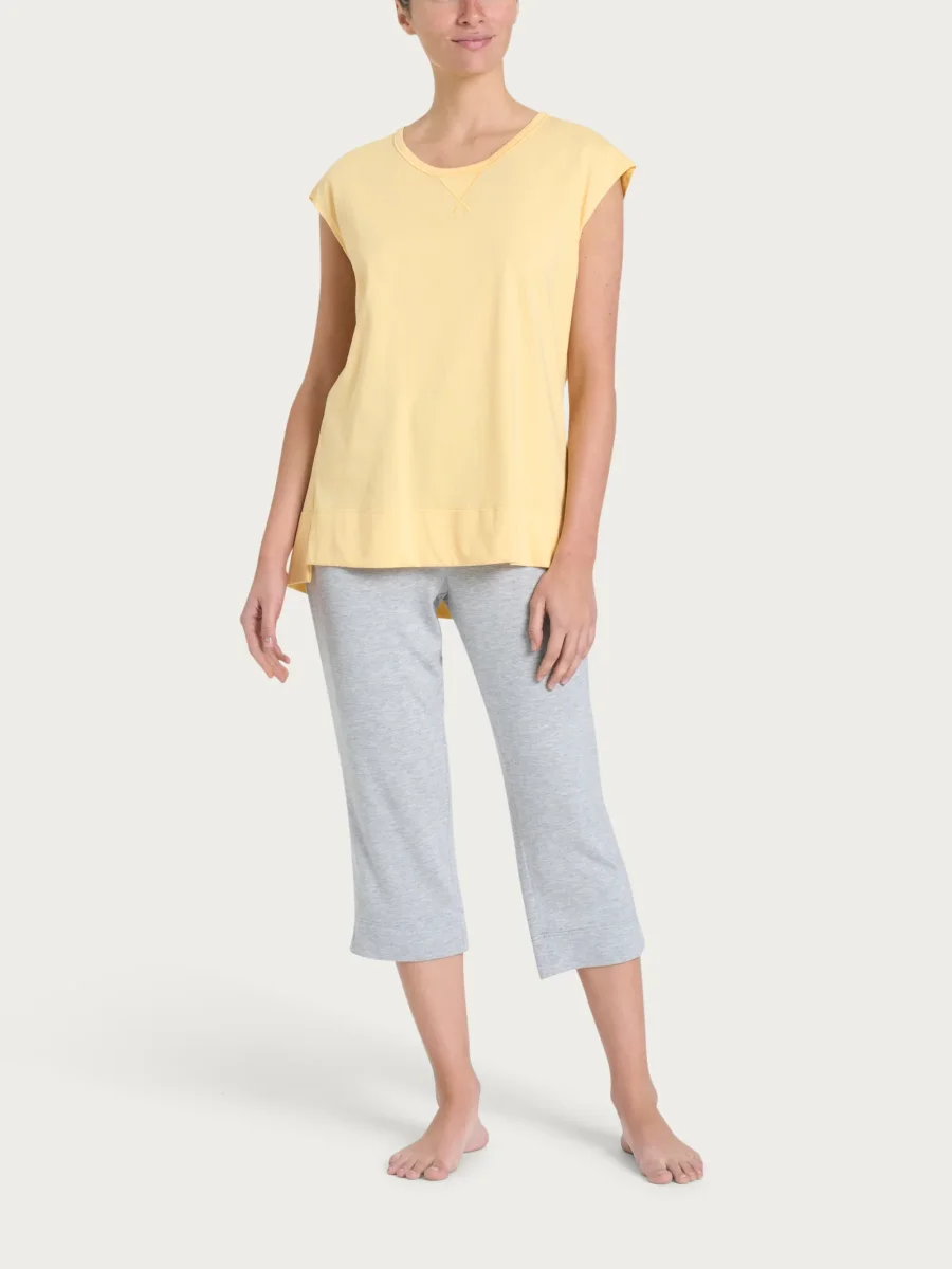 Immergiti in un abbraccio di freschezza e classe con questo pigiama a pinocchietto, perfetto per trasformare le calde serate in momenti di puro comfort, ovunque tu sia, sia a casa che in viaggio lontano da comfort casalingo.