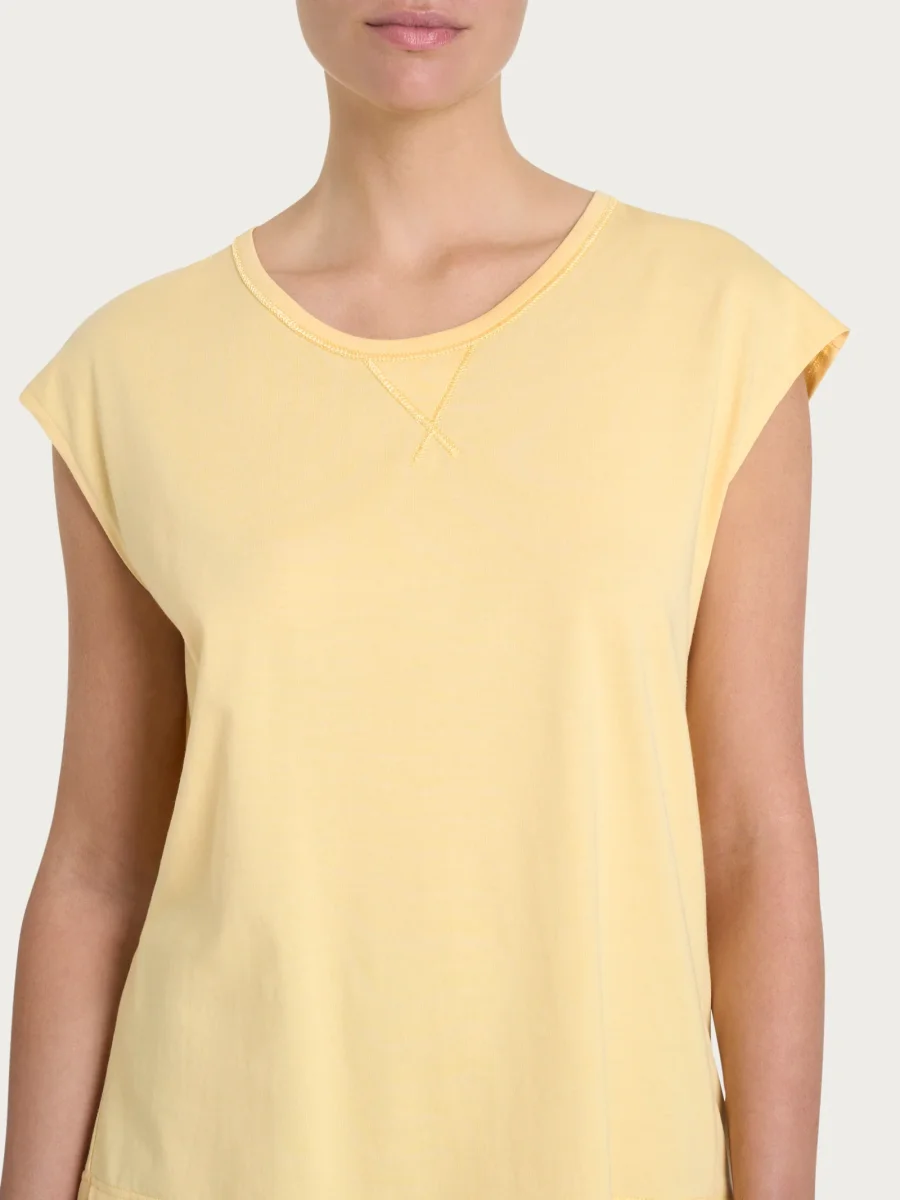 Il collo a girocollo è arricchito da una cucitura a contrasto lungo tutto il girocollo e da un piccolo triangolo che si origina dalla cucitura stessa nella parte frontale del capo, aggiungendo un elemento decorativo distintivo e raffinato.