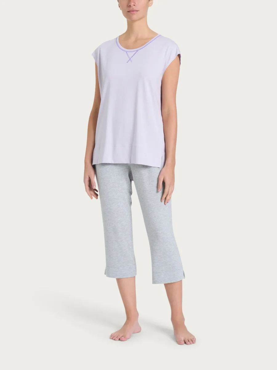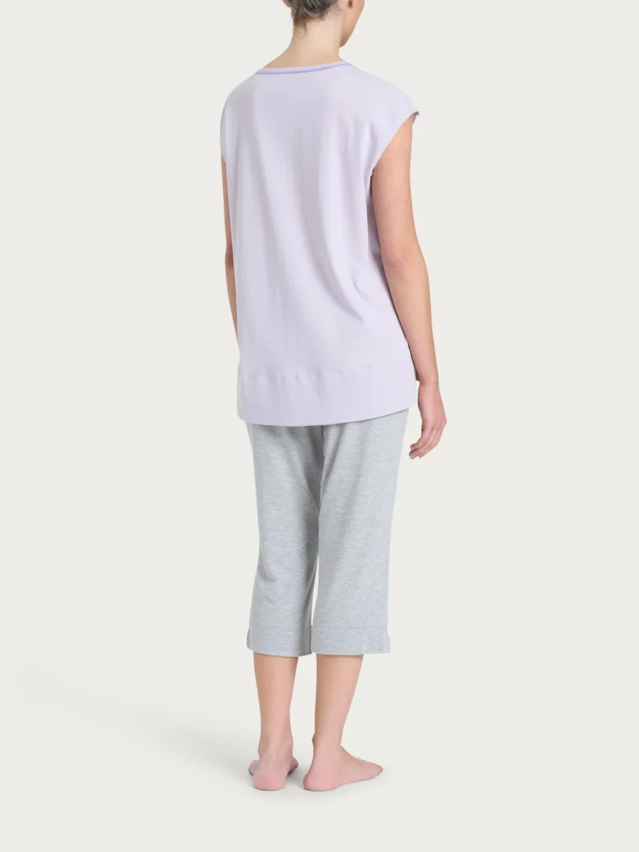 Immergiti in un abbraccio di freschezza e classe con questo pigiama a pinocchietto, perfetto per trasformare le calde serate in momenti di puro comfort, ovunque tu sia, sia a casa che in viaggio lontano da comfort casalingo.