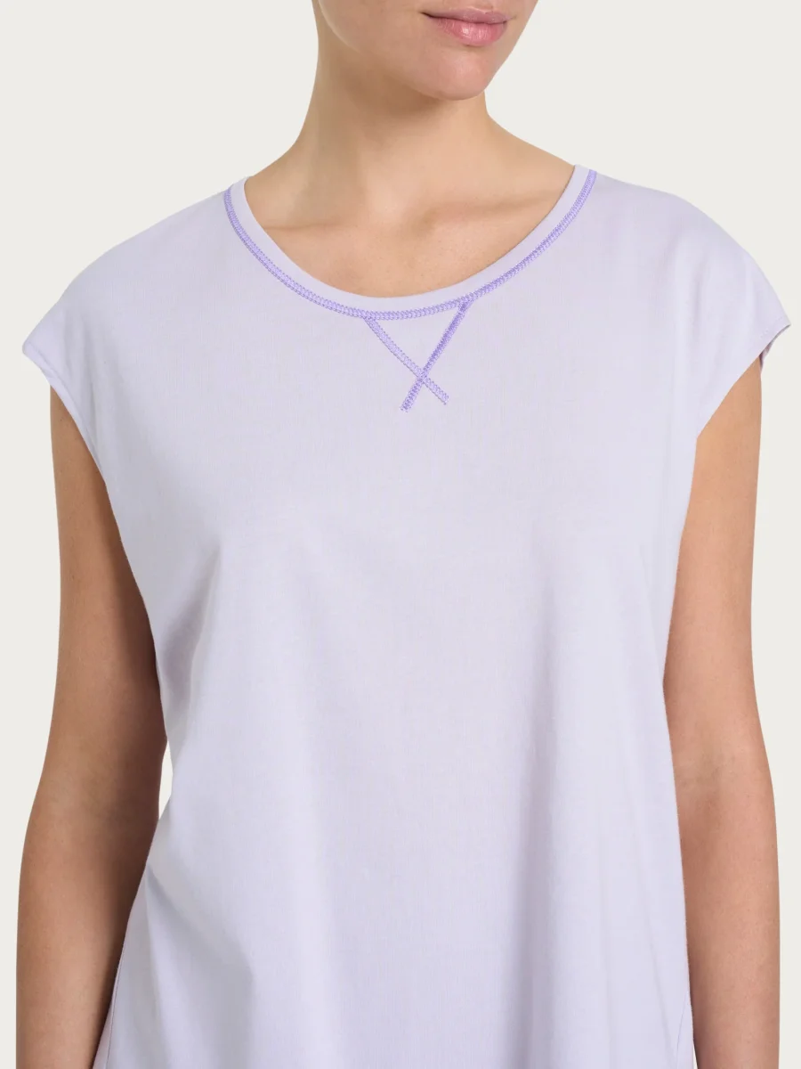 Il collo a girocollo è arricchito da una cucitura a contrasto lungo tutto il girocollo e da un piccolo triangolo che si origina dalla cucitura stessa nella parte frontale del capo, aggiungendo un elemento decorativo distintivo e raffinato.