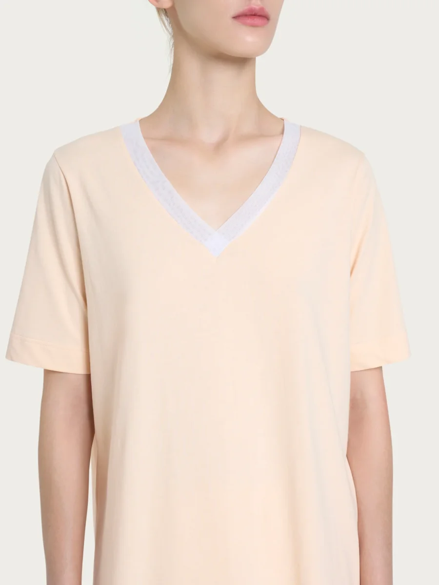 Caratterizzato dalla casacca con scollo a V con le maniche corte e un delicato bordo sul collo in tulle a contrasto per delineare al meglio il collo senza appesantirne il design complessivo.