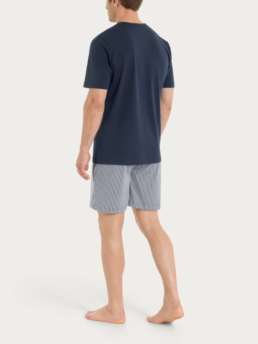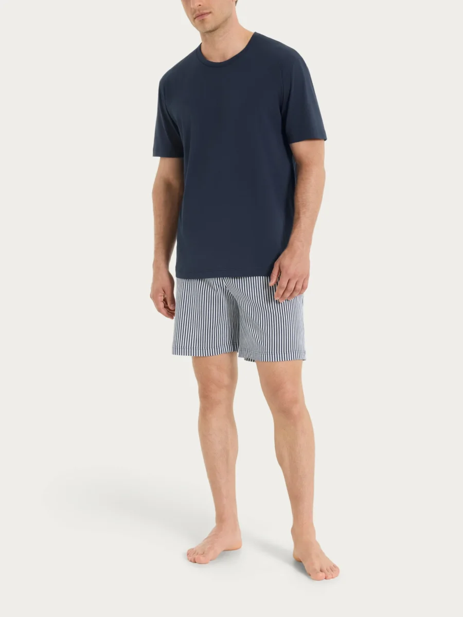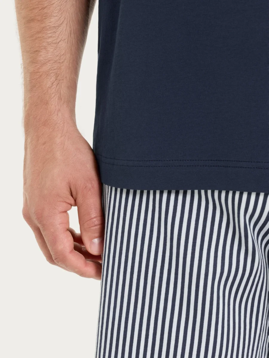 Sia il pantalone lungo che il pantaloncino corto sono caratterizzati da una fantasia a righe verticali, disposte con regolarità per un effetto visivo classico ma attuale. Il contrasto tra tinta unita e motivo a righe rende l’insieme armonioso e curato nei dettagli.