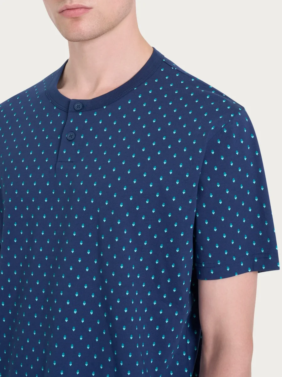 La casacca è caratterizzata da una fantasia a doppio rombo distribuito regolarmente sull’intero capo, dalle maniche corte, da un collo a serafino e da una delicata bordatura a contrasto in tinta unita che avvolge il collo.