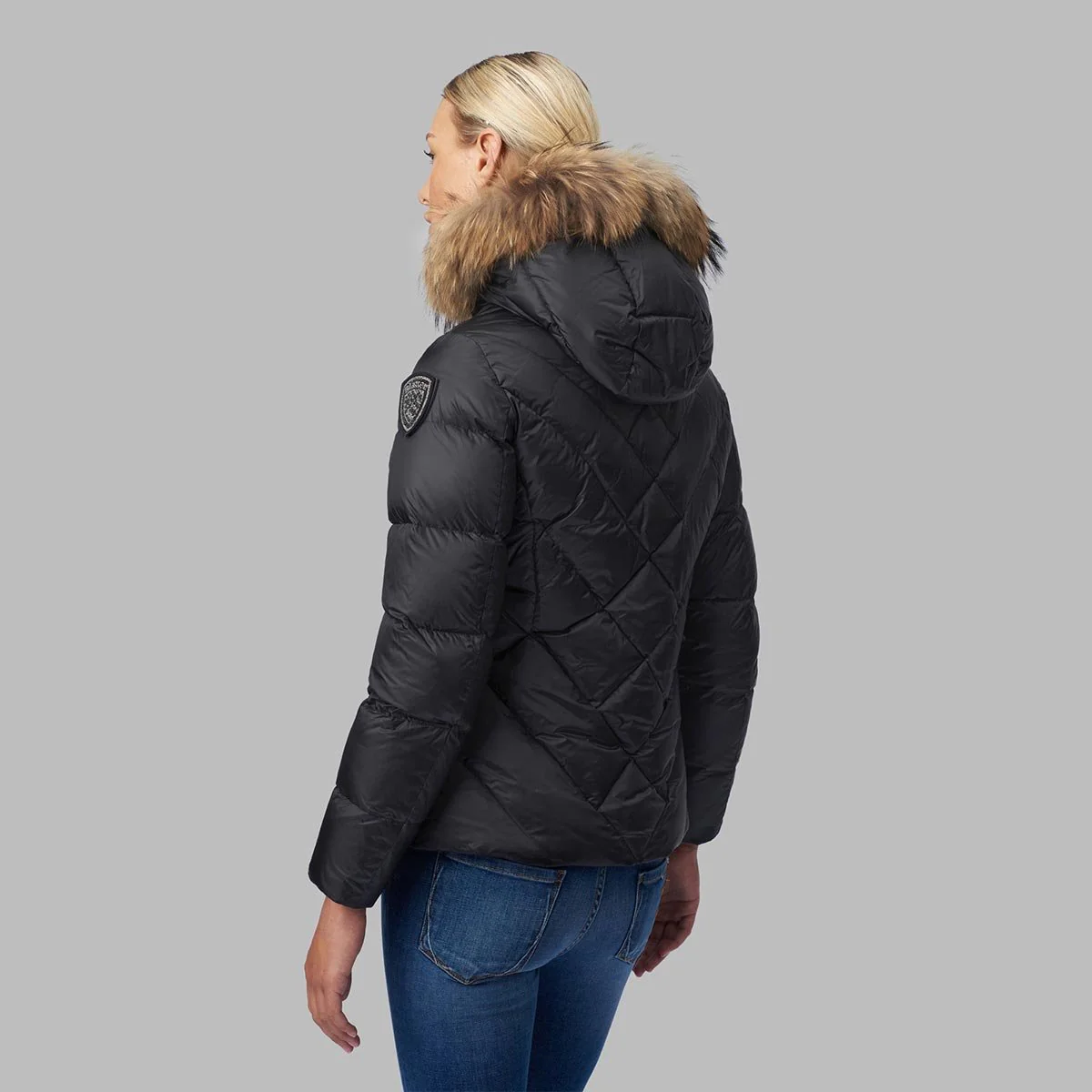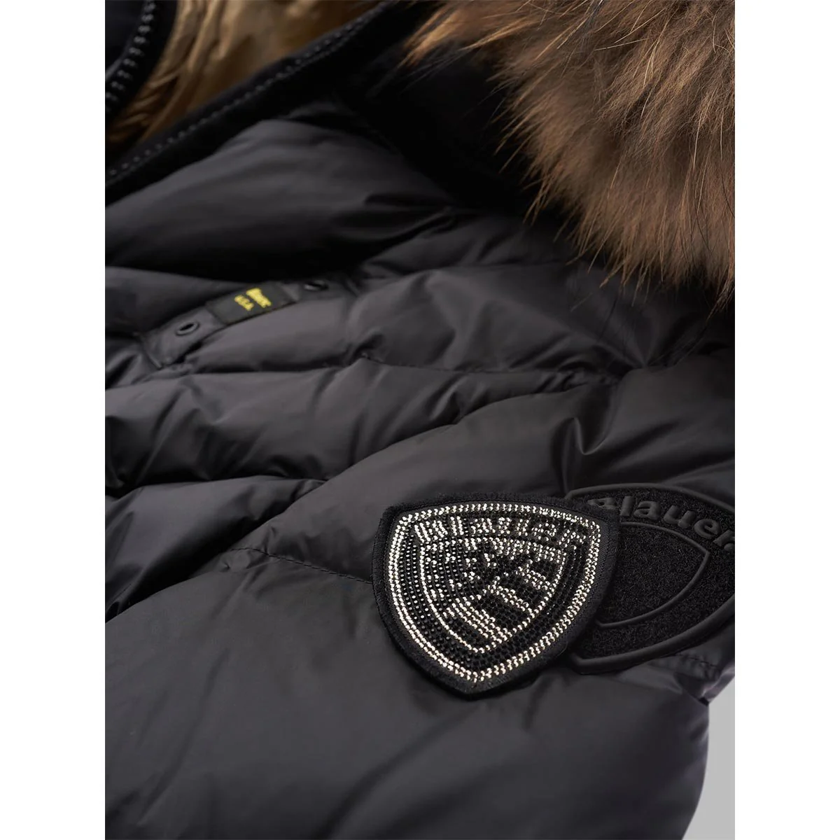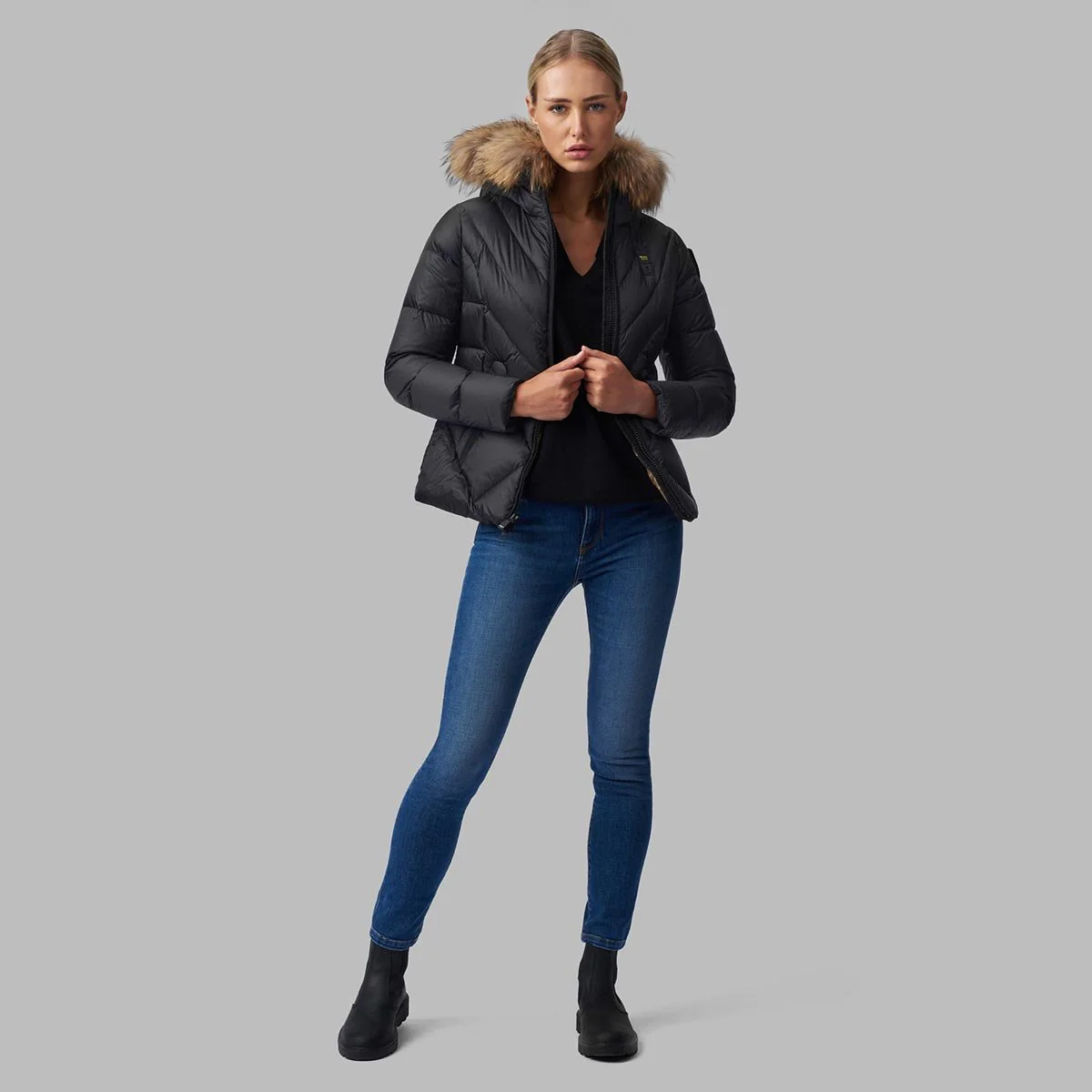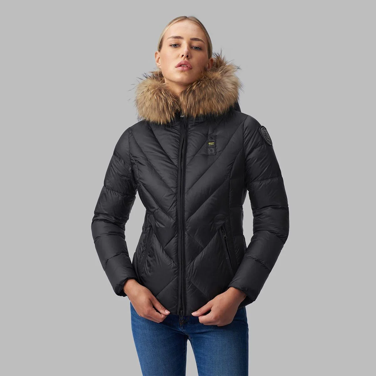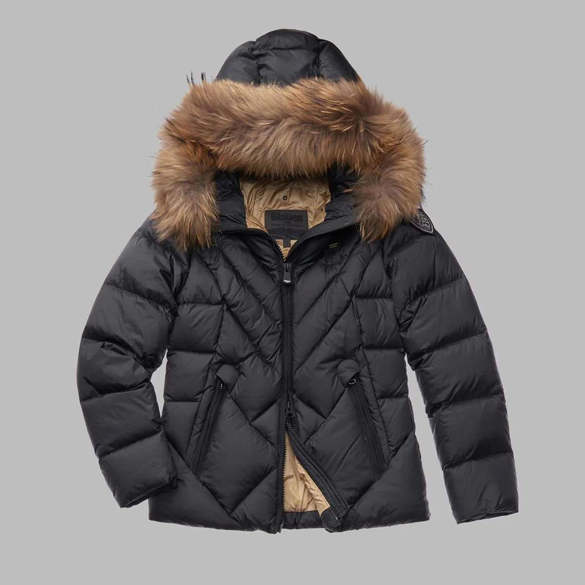 Piumino imbottito piuma e trapuntato a linee oblique che si intersecano formando figure geometriche. Imbottitura classica calda ma non ingombrante.Cappuccio fisso e bordo con vera pelliccia removibile tramite zip.Chiusura centrale con cerniera a doppio cursore e para zip interna a protezione.Due tasche davanti con zip obliqua e copri cursore superiore.Fettuccia a spina di pesce in tono per nascondere le zip.Fodera liscia interna in contrasto colore e due tasche interne una con zip e l’altra con velcro.Coulisse sul fondo del capo.Caratteristico passante Blauer cucito sul petto a sinistra e patch Blauer staccabile con decoro in Swarovski sulla manica sinistra.