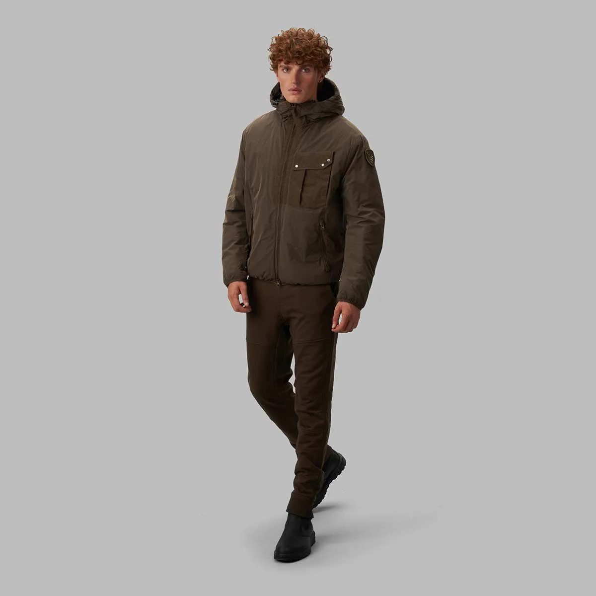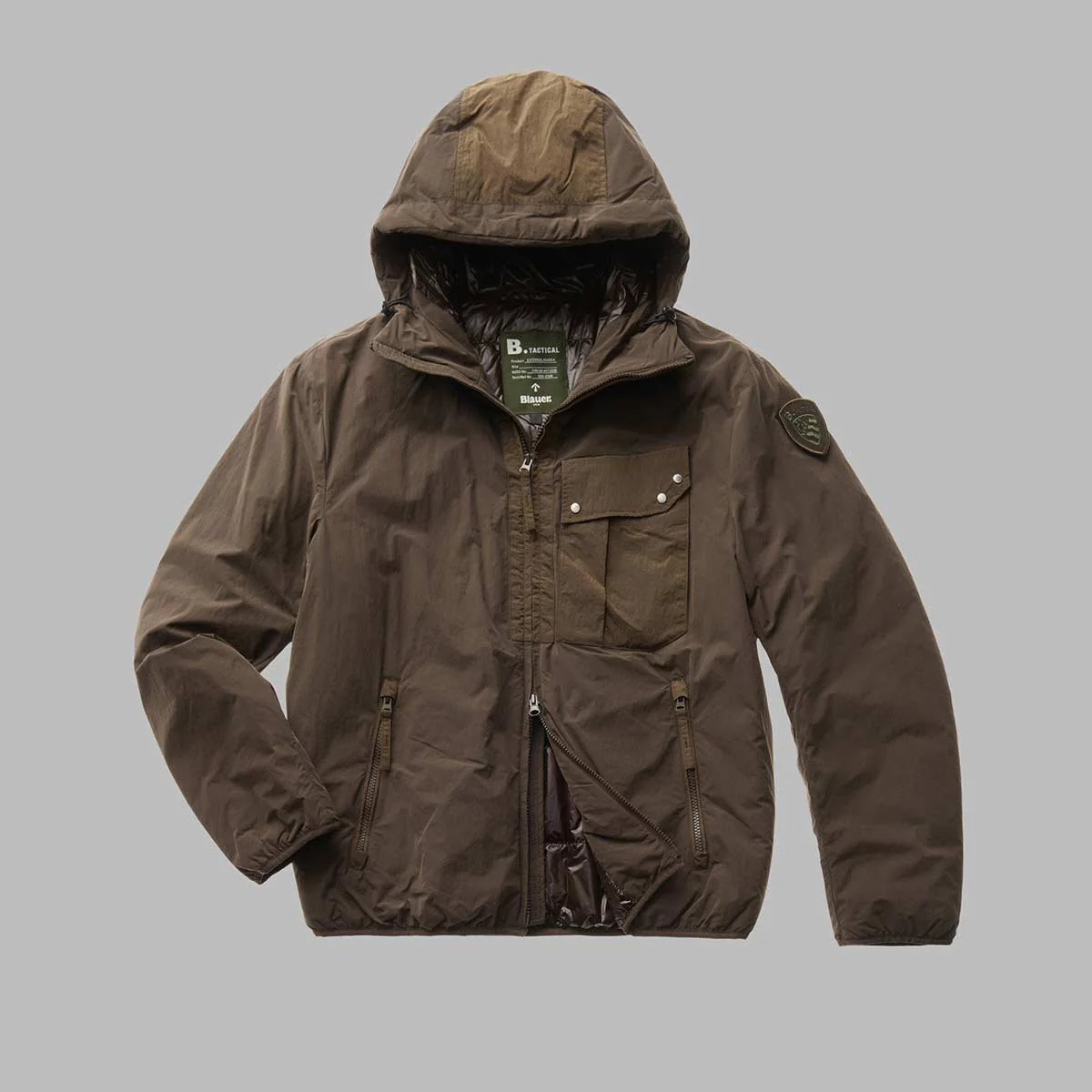 Giacca in microfibra di nylon leggermente imbottita con cappuccio.Inserti in nylon crease nel centro del cappuccio, nella tasca sul petto e nella parte alta della chiusura centrale.Imbottitura Sorona® Aura by Dupont® parzialmente a base vegetale, lavabile e inodore, confortevole, calda e che mantiene la forma nel tempo.Cappuccio fisso con coulisse in tubolare elastico sul bordo e sul retro.Chiusura centrale con zip doppio cursore nascosta.Due tasche sul davanti con zip e copri cursore; ulteriore taschina sul petto, a sinistra, con soffietto verticale e pattina con tre automatici di chiusura.Fodera interna in nylon lucido in tono impunturata a righe e taschina interna a sinistra con zip.Fettuccia elastica in lycra in tono sul bordo del fondo e dei polsini.Patch con velcro sulla manica sinistra con logo Blauer Tactical.Capo della linea capsule Blauer Tactical ad ispirazione militare rivisitato in tono più urban e arricchito di dettagli tecnici.