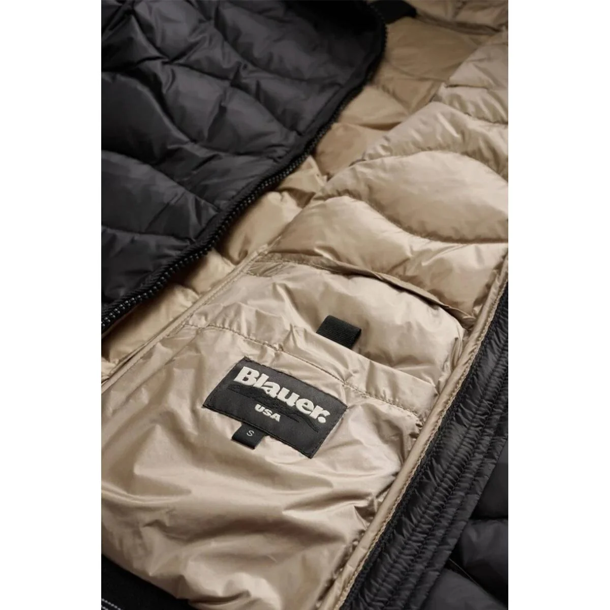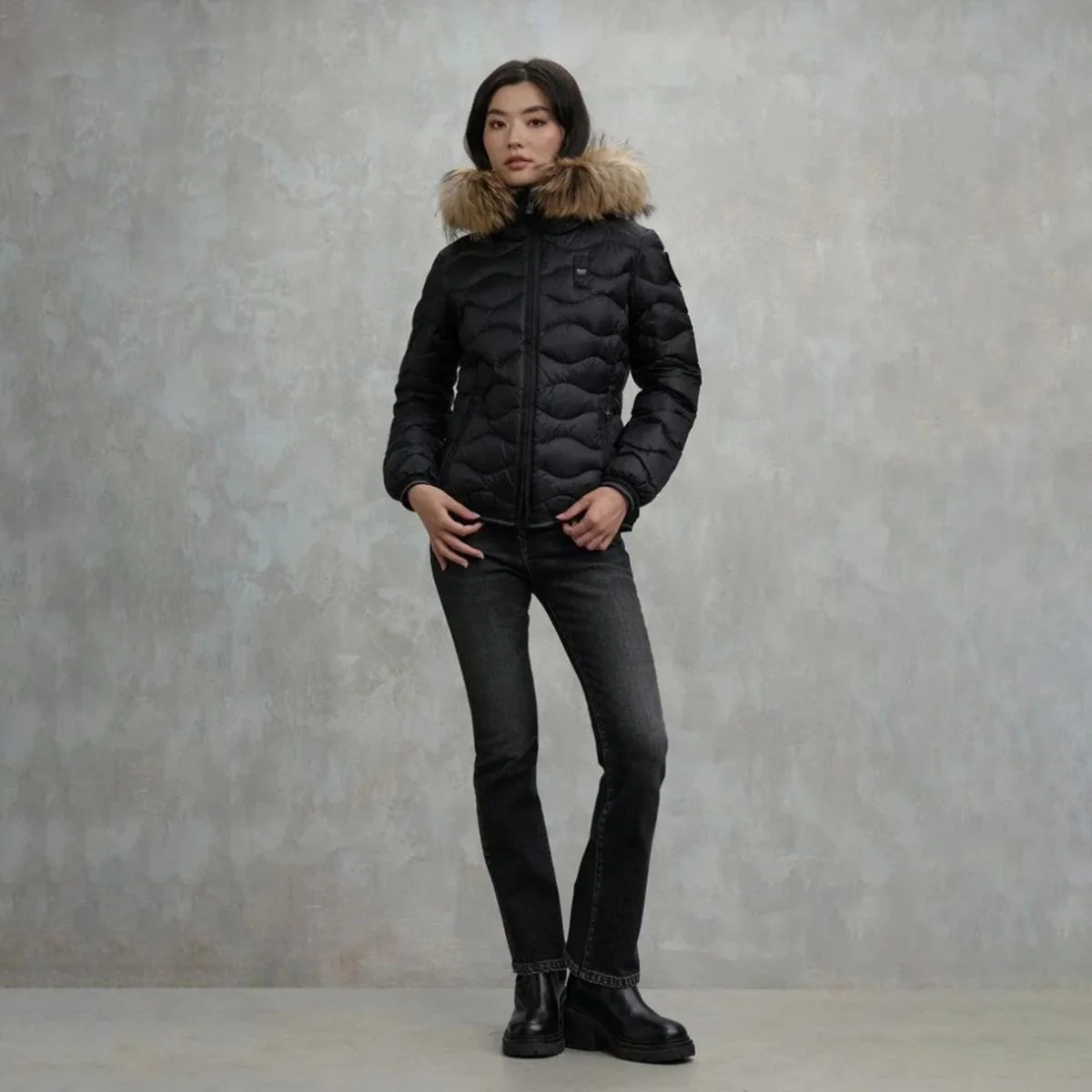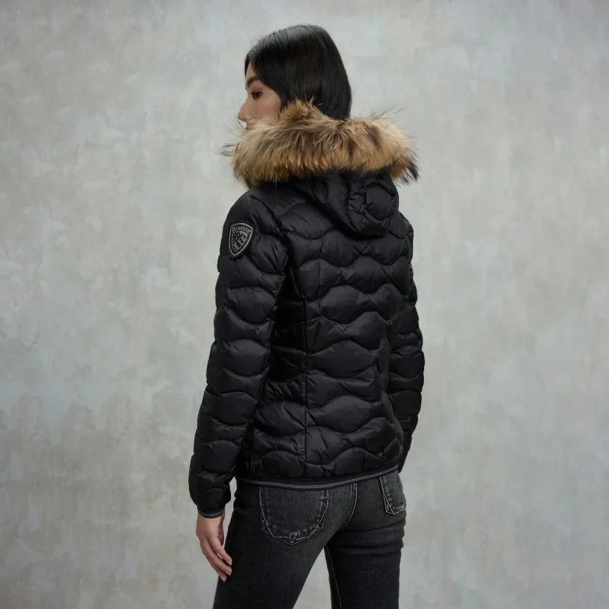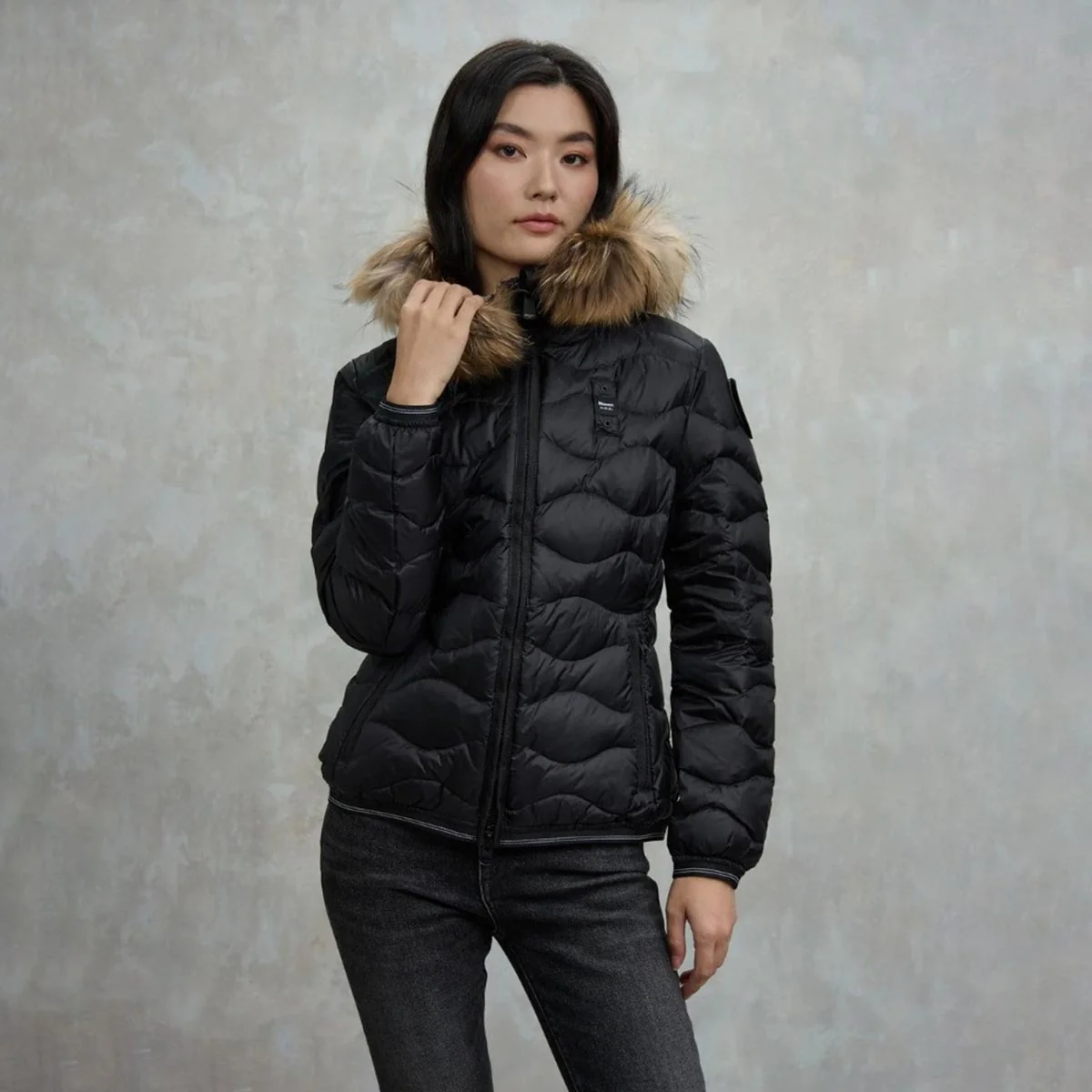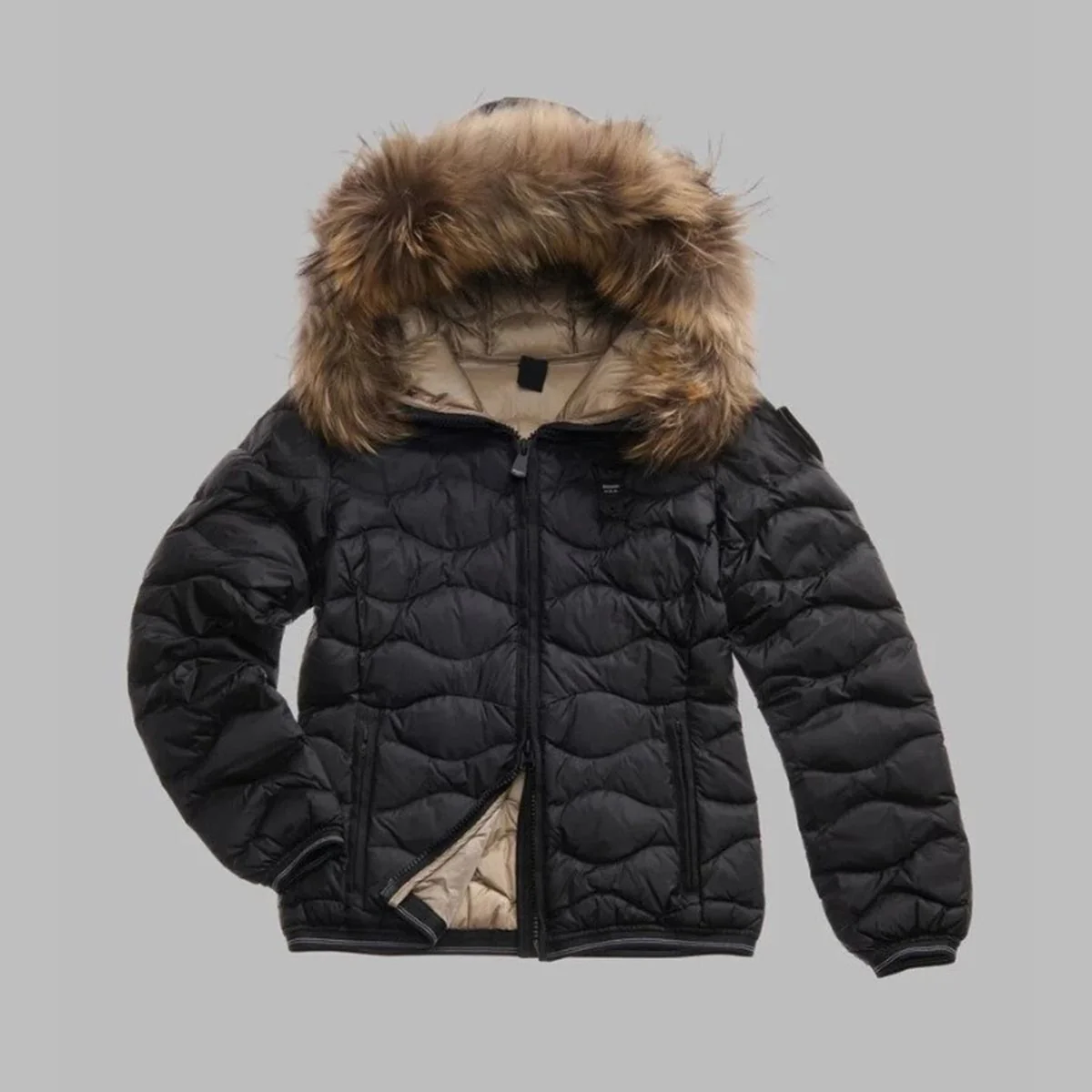 Piumino idrorepellente trapuntato ad onde orizzontali e con profilo del cappuccio in vera piuma. Capo iconico Blauer con imbottitura naturale, calda e non ingombrante.