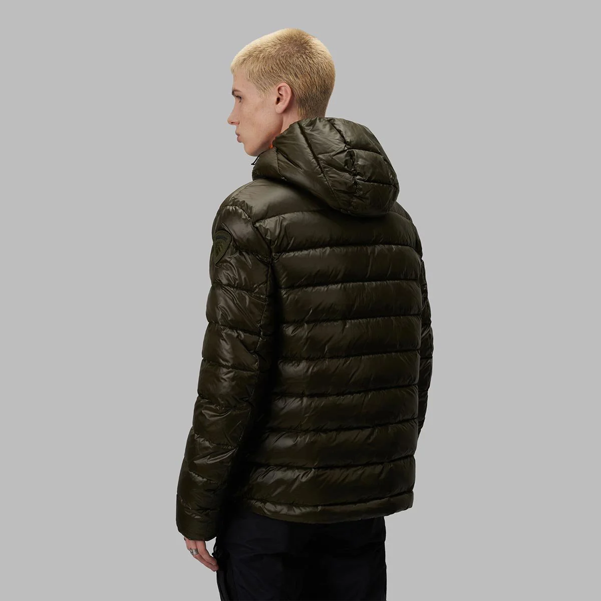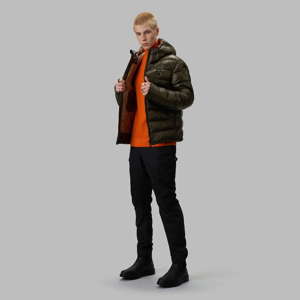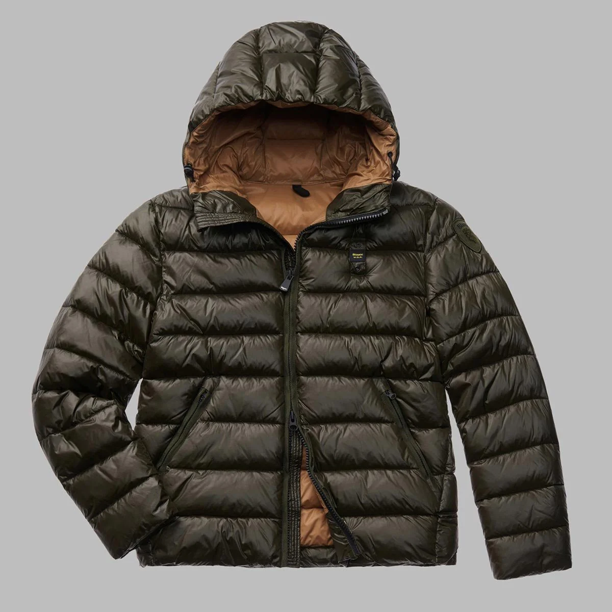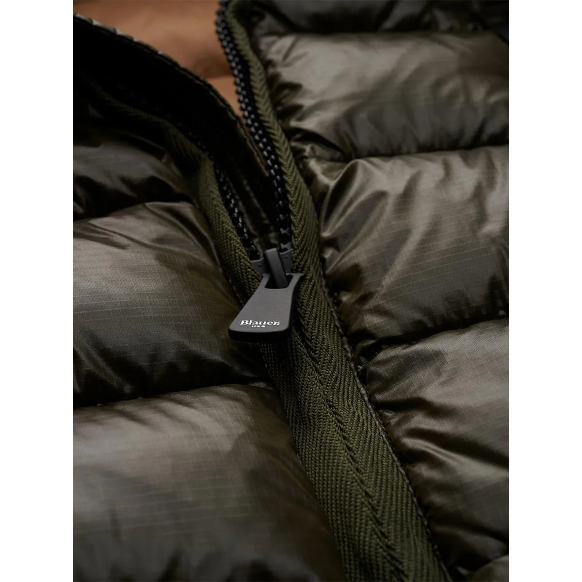 Piumino in nylon micro-rip con leggero motivo check e cappuccio fisso.Imbottitura Sorona® Aura by Dupont® parzialmente a base vegetale, con impuntura a righe orizzontali, lavabile e inodore, confortevole, calda e che mantiene la forma nel tempo.Fodera interna del cappuccio e del capo in contrasto colore.Chiusura centrale con zip doppio cursore nascosta da fettuccia a spina di pesce in tono, copri cursore sul collo e para zip interna.Due tasche sul davanti con zip obliqua nascoste da fettuccia a spina di pesce nel profilo e copri cursore.Due tasche interne, una con zip e l’altra con velcro.Coulisse con tubolare elastico sul cappuccio e sul fondo del capo.Caratteristico passante Blauer in tono cucito sul petto a sinistra e patch in tono sulla manica sinistra.