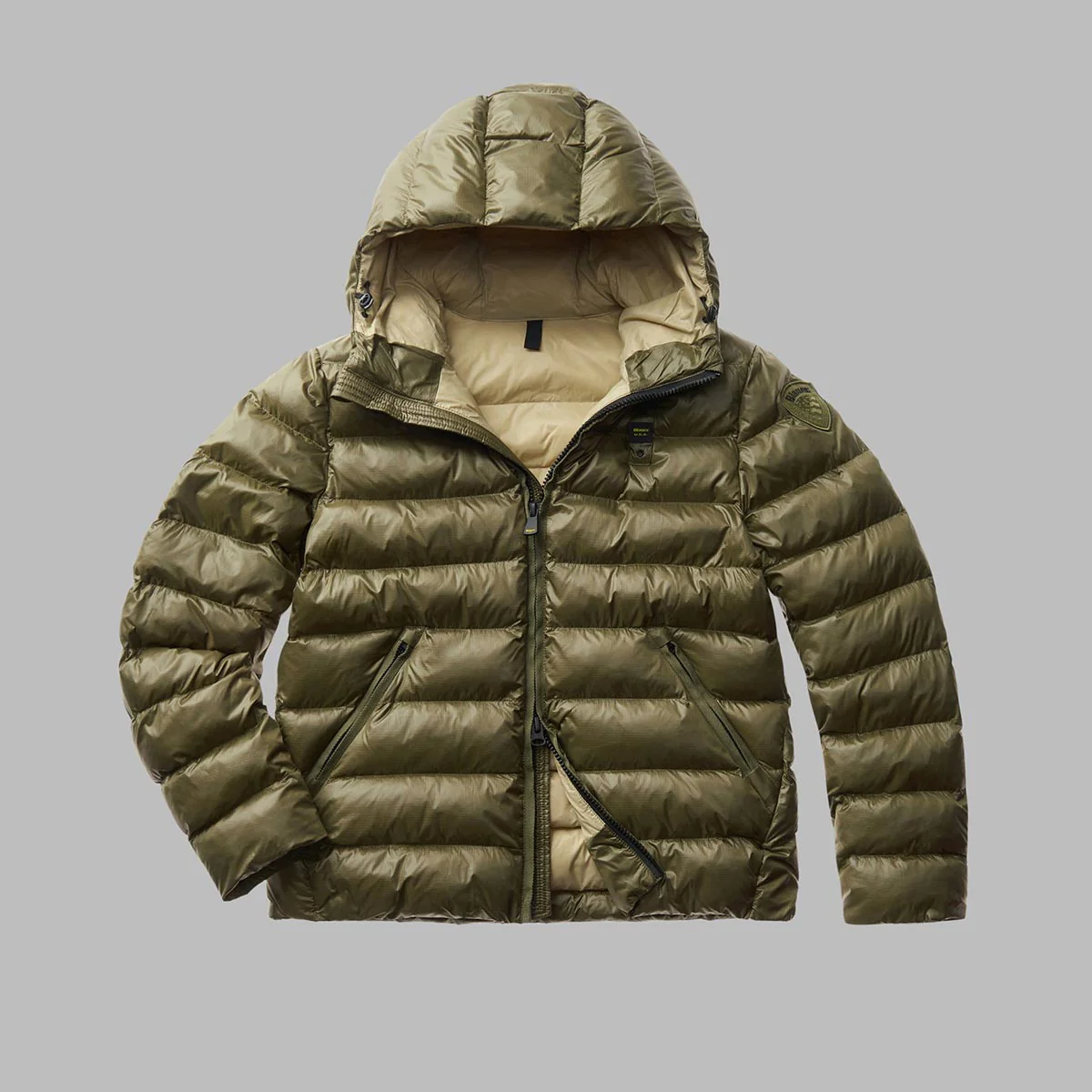 Piumino in nylon micro-rip con leggero motivo check e cappuccio fisso.
