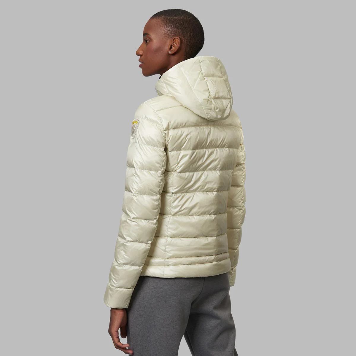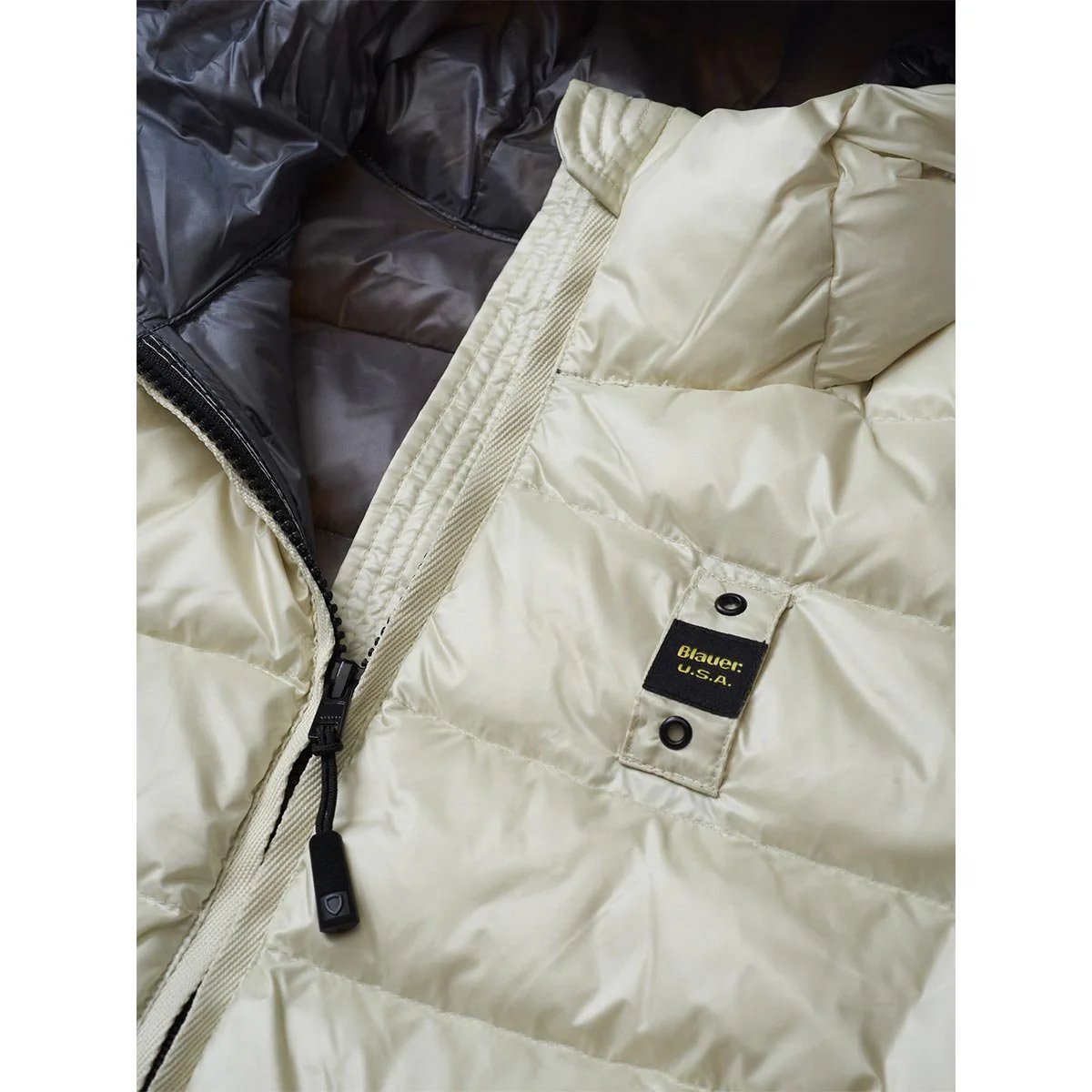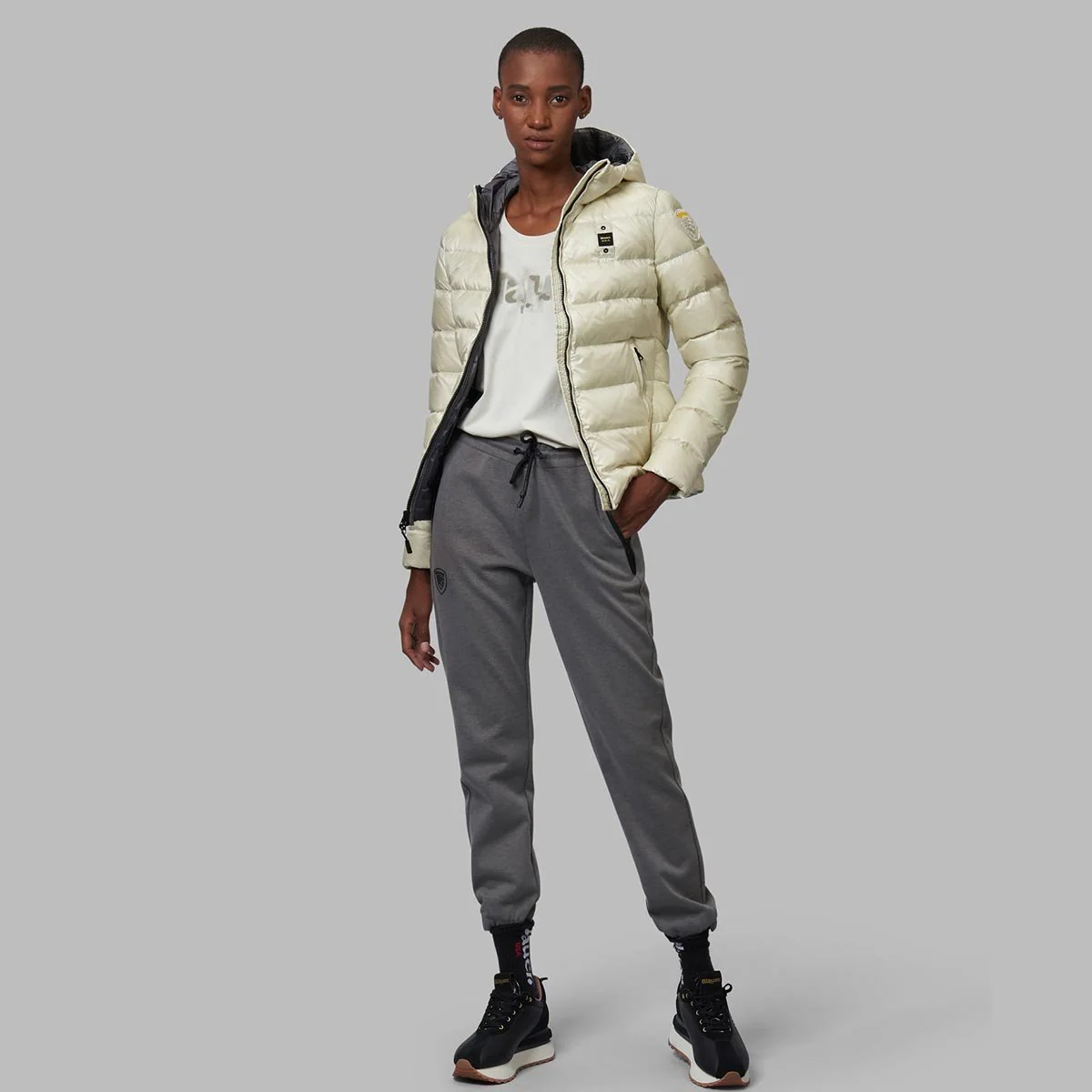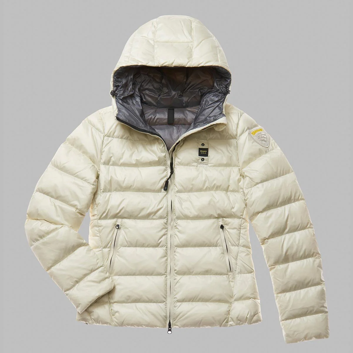 Piumino imbottito di calda piuma leggera con cappuccio fisso. Trapuntatura orizzontale con cuciture singole. Chiusura centrale con cerniera doppio cursore, profilo delle zip in fettuccia a spina di pesce in tono, para zip interna e e copri cursore sul collo. Due tasche davanti con zip obliqua e copri cursore. Coulisse con tubolare elastico sul cappuccio e sul fondo. Doppia cucitura laterale per risaltare il punto vita. Due tasche interne una con velcro e una con zip. Caratteristico passante Blauer cucito sul petto a sinistra e patch sulla manica sinistra entrambi con logo in contrasto colore.