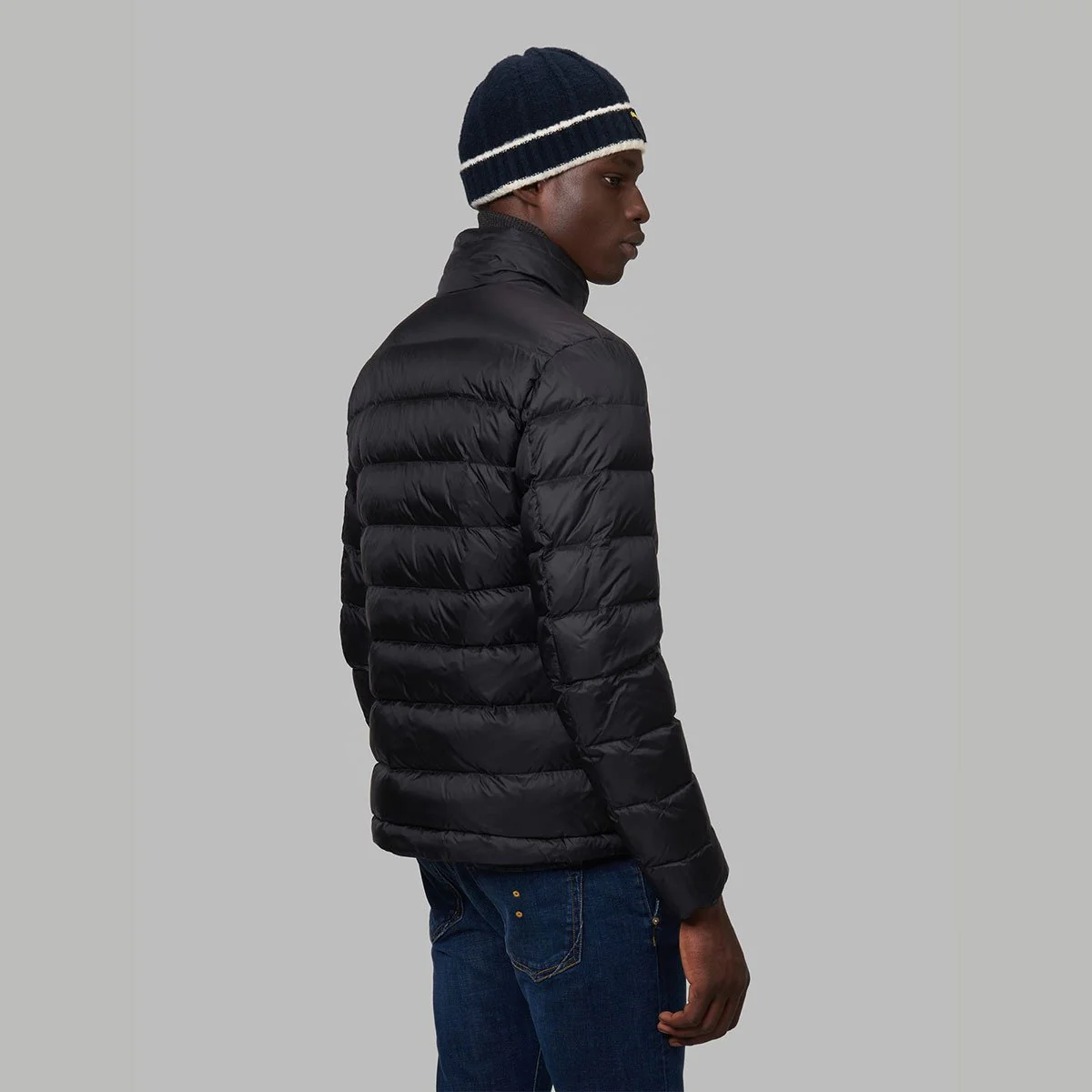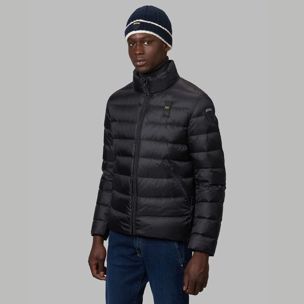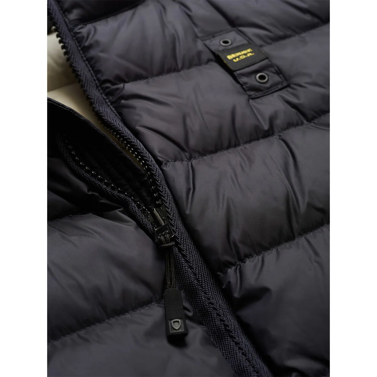 Piumino blu imbottito di calda piuma trapuntato in orizzontale con colletto alla coreana. Chiusura centrale con cerniera a doppio cursore su tutta la lunghezza con para zip interna a protezione e copri cursore sul collo. Fettuccia a spina di pesce in tono a nascondere la zip centrale e delle tasche. Fodera interna del capo in contrasto colore trapuntata in orizzontale. Due tasche davanti con zip obliqua e copri cursore. Coulisse con tubolare elastico sul fondo del capo. Due tasche interne a destra con velcro e a sinistra con zip. Caratteristico passante Blauer in tono cucito sul petto a sinistra e patch Blauer sulla manica sinistra entrambi con logo in contrasto colore.