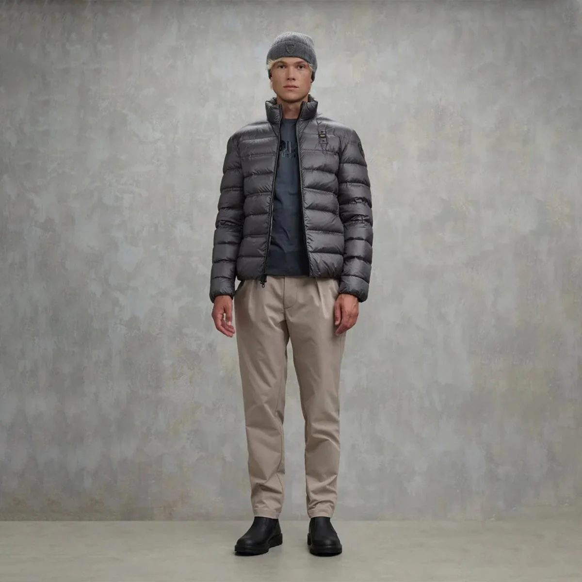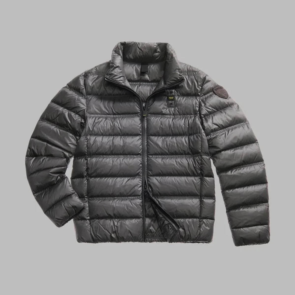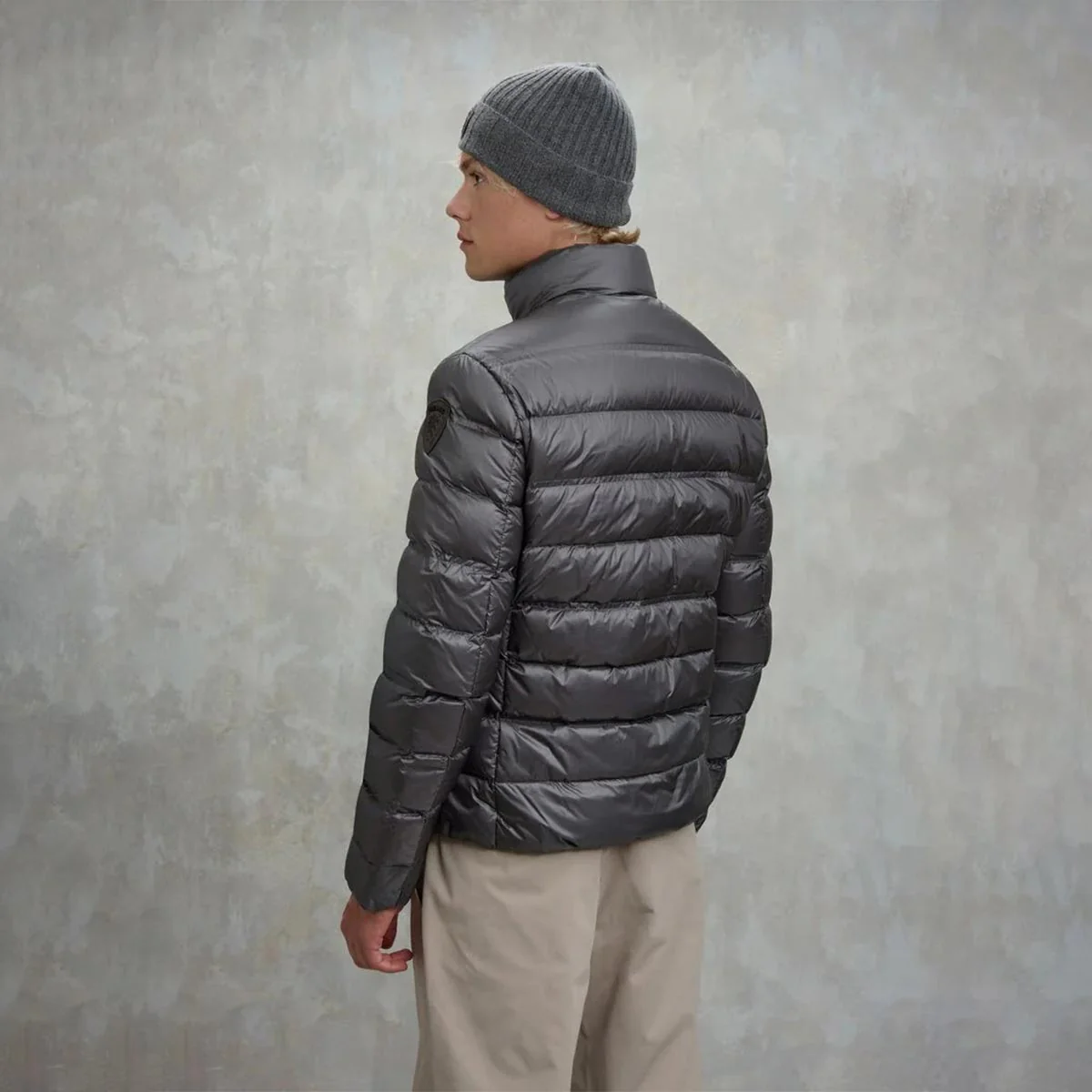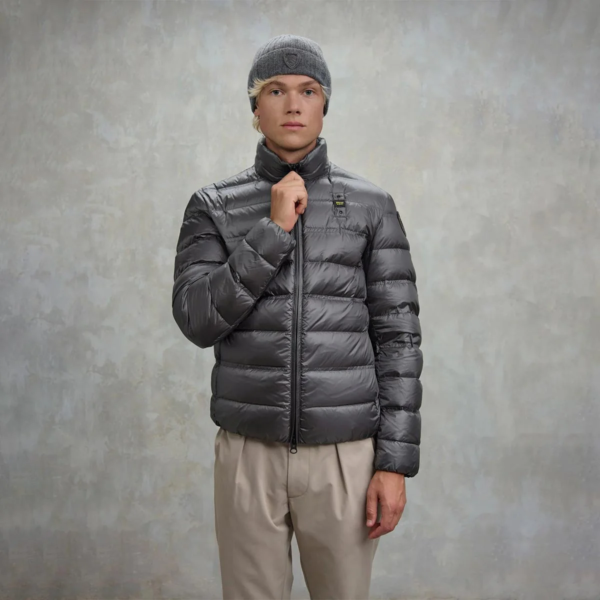 Piumino lucido trapuntato a righe orizzontali singole e doppie intervallate con imbottitura naturale in piuma, calda e non ingombrante.