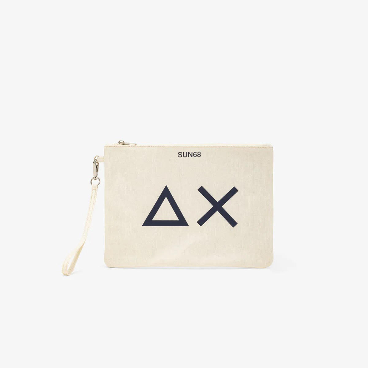 Pochette foderata in cotone con manico, chiusura con zip e logo stampato sul davanti in contrasto colore.