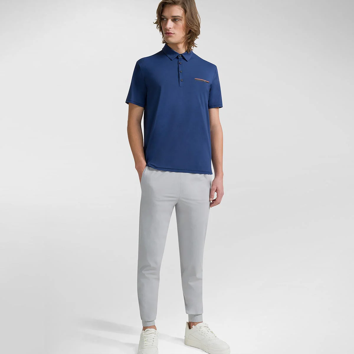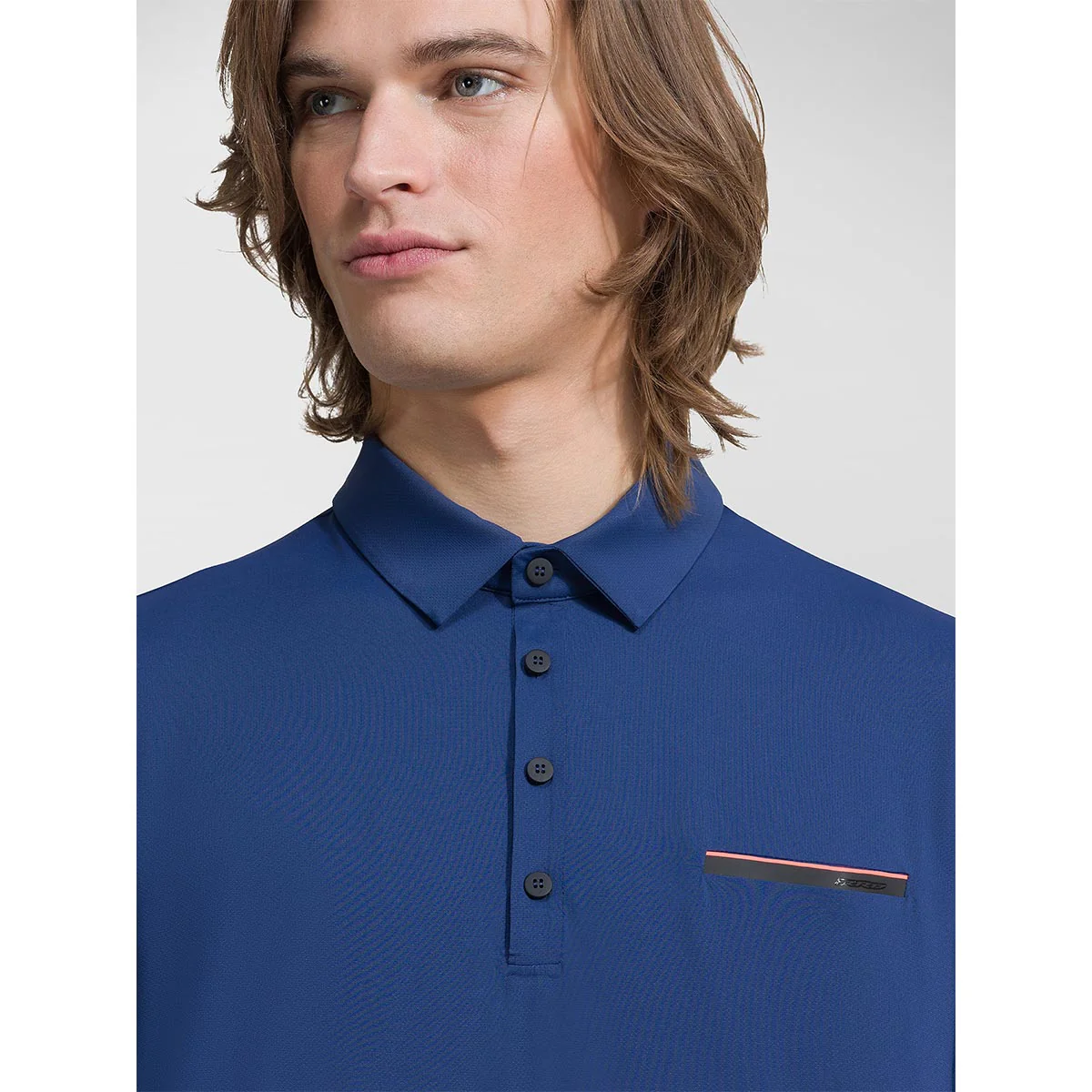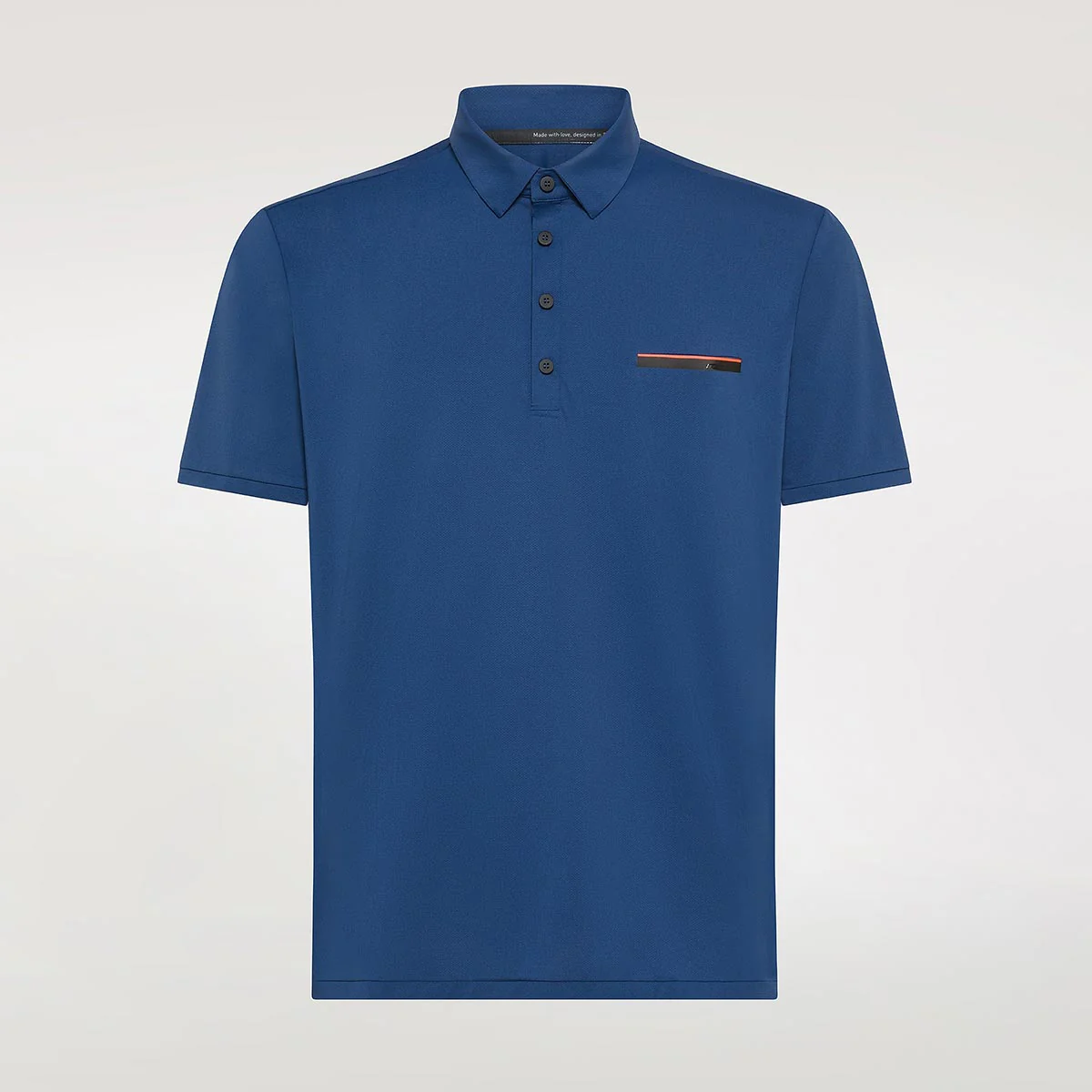 Dettagli di stile come il colletto a camicia chiuso da quattro bottoni soft touch neri e il taschino invisibile, rivelato dalla linea arancio fluo a contrasto sul sottile tape nero con logo. Taglio classico e asciutto è enfatizzato dal pregiato tessuto stretch Oxford, fresco e traspirante, antipiega ed easy care, particolarmente liscio e morbido al tatto.