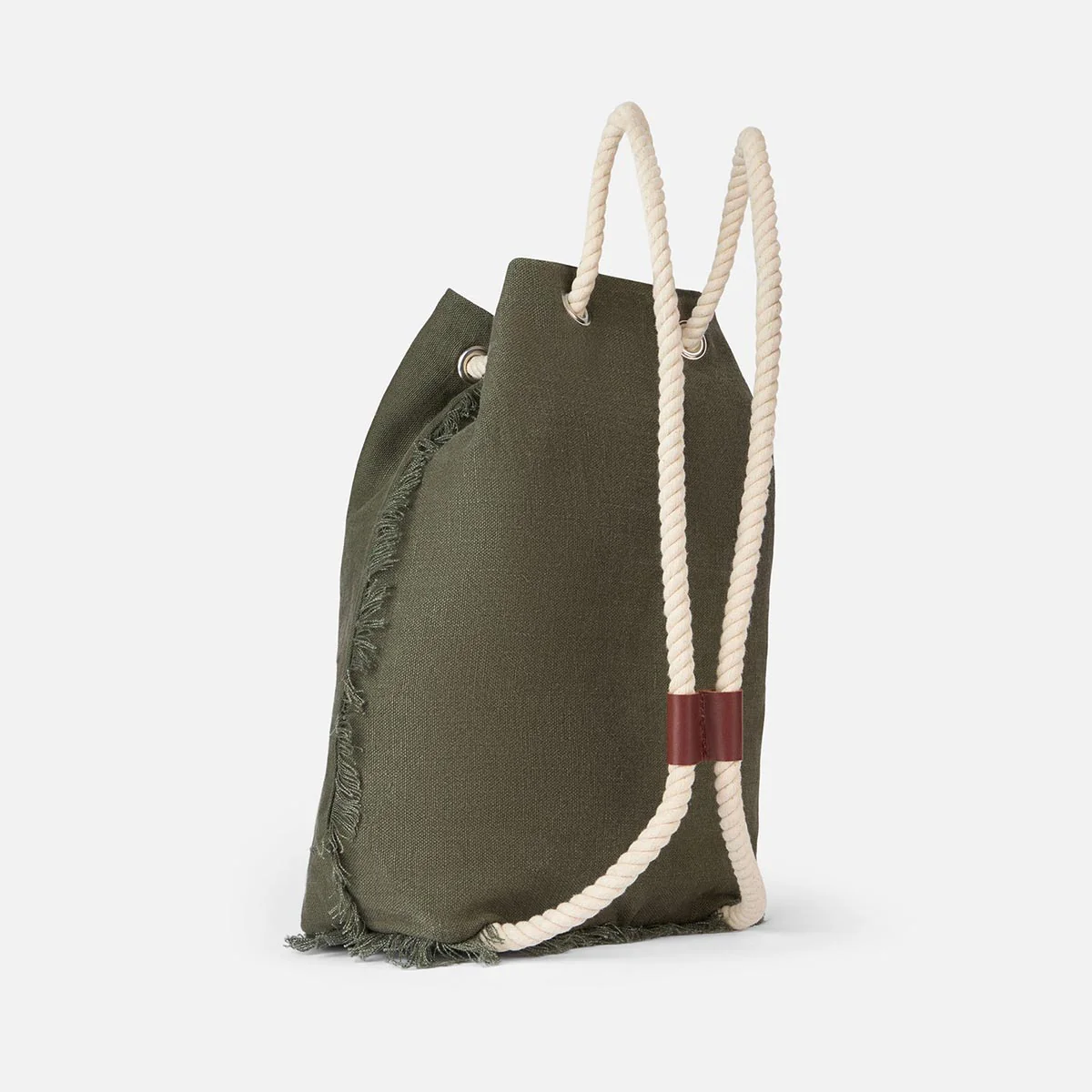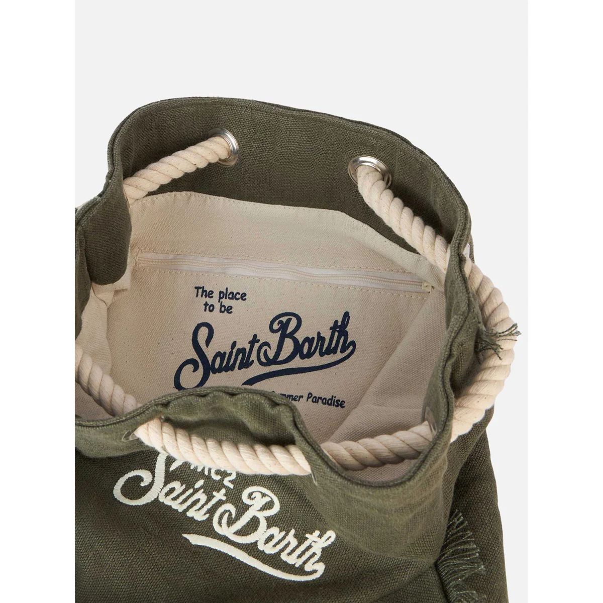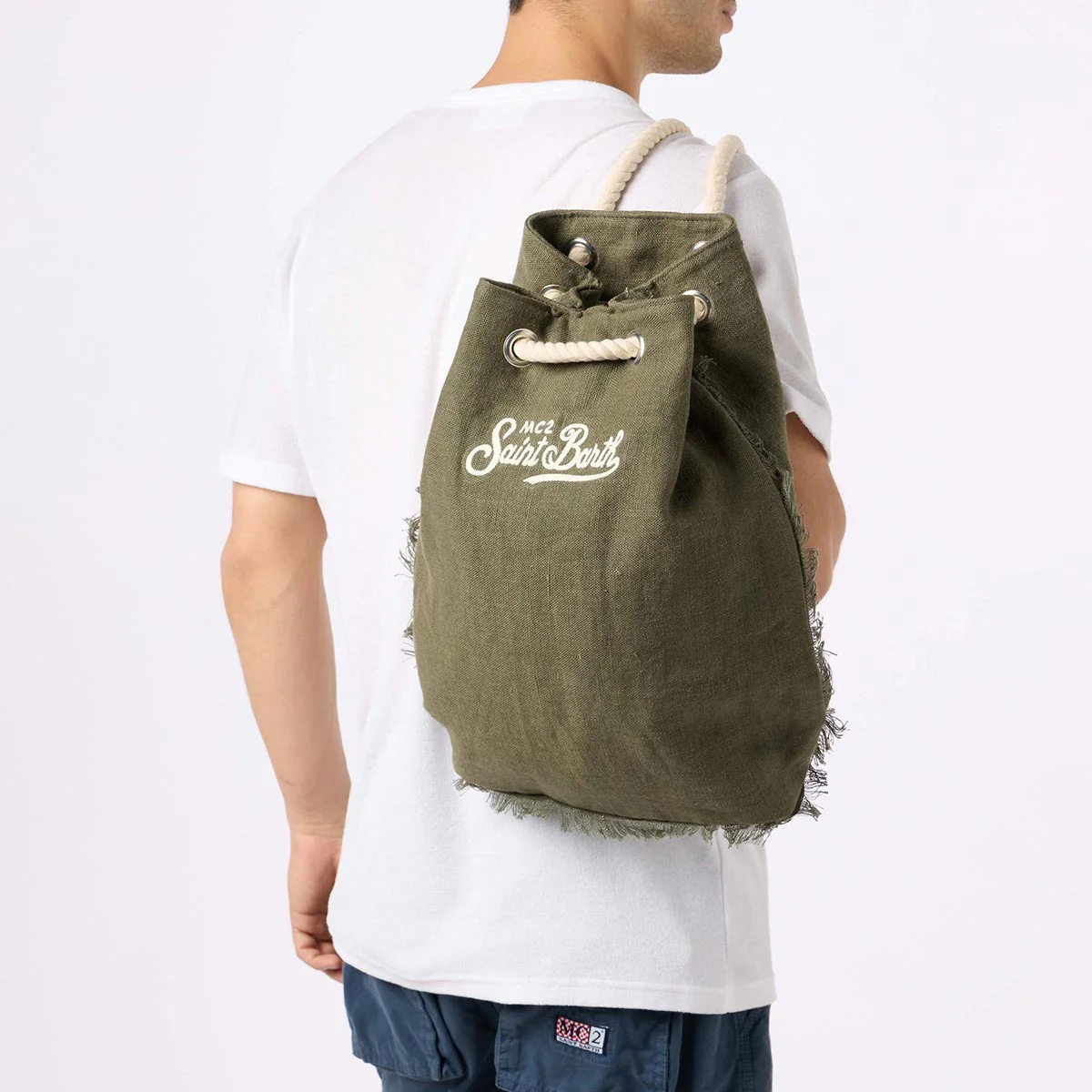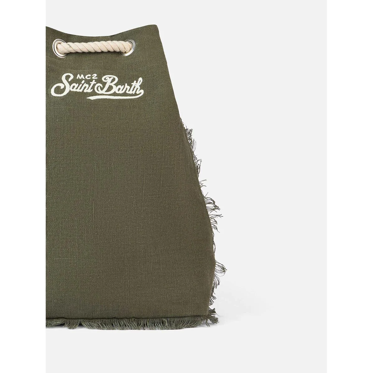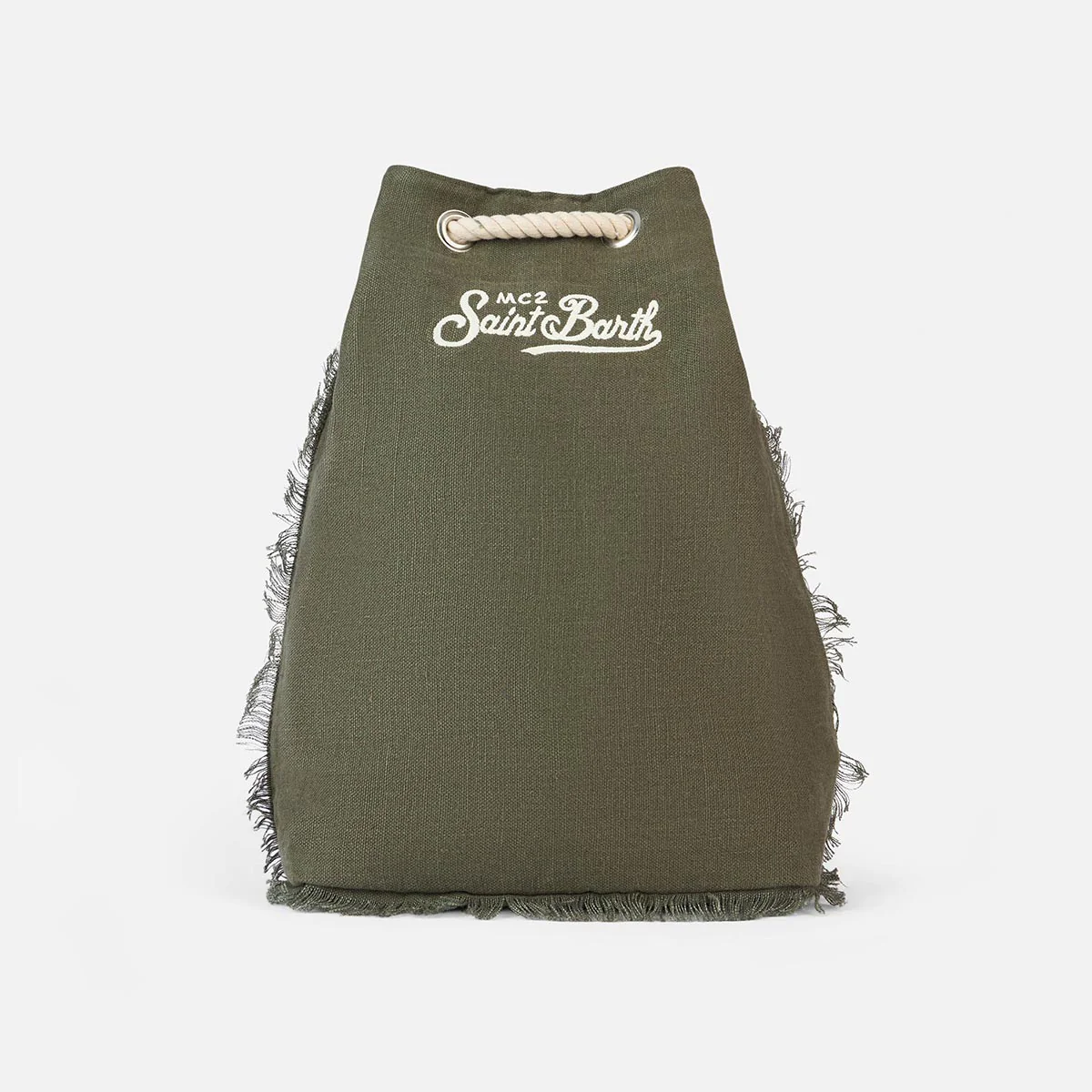 Sacca Zaino Saint Barth realizzato in lino. L’apertura superiore consente un facile accesso. Spallacci fatte con corde in legno e i dettagli in pelle. Logo Saint Barth ricamato sul davanti.
