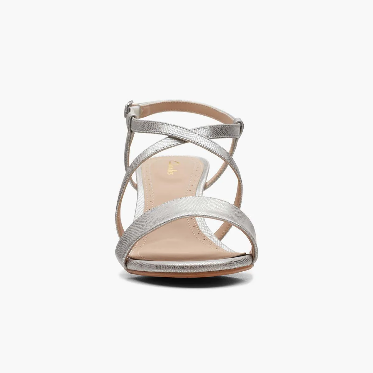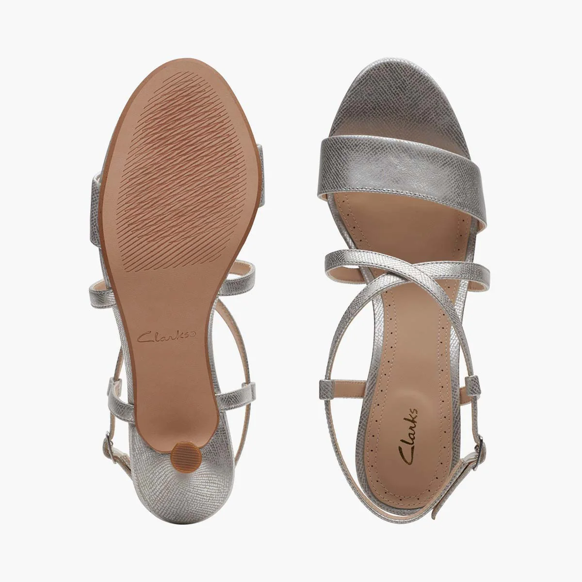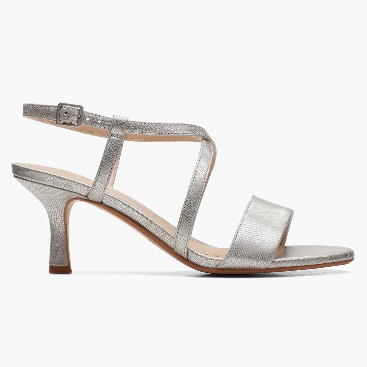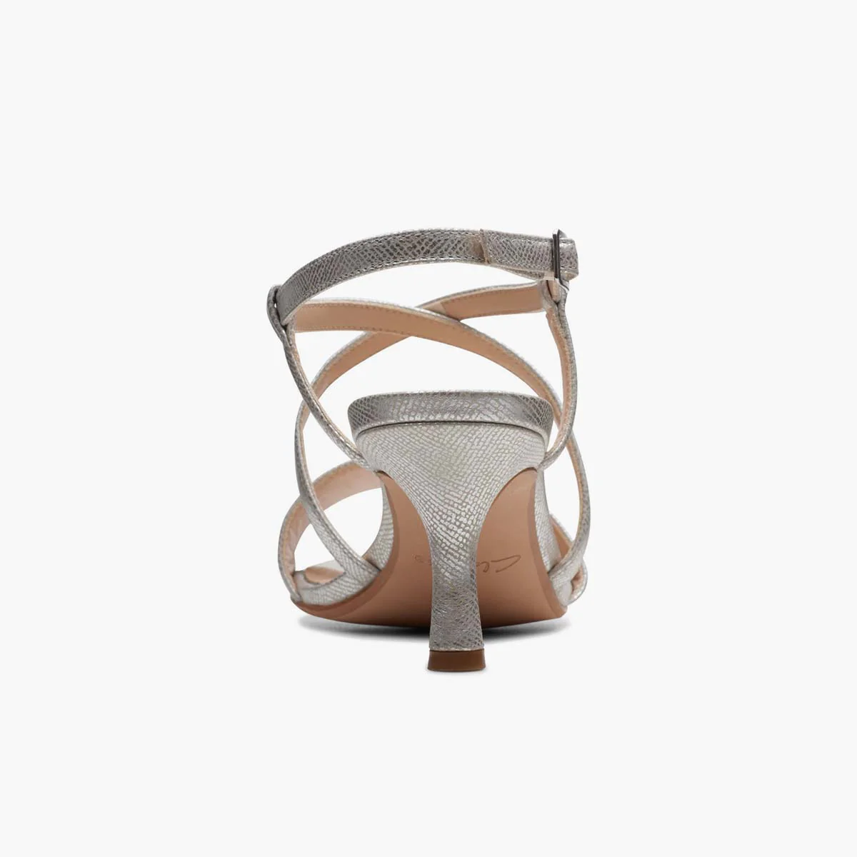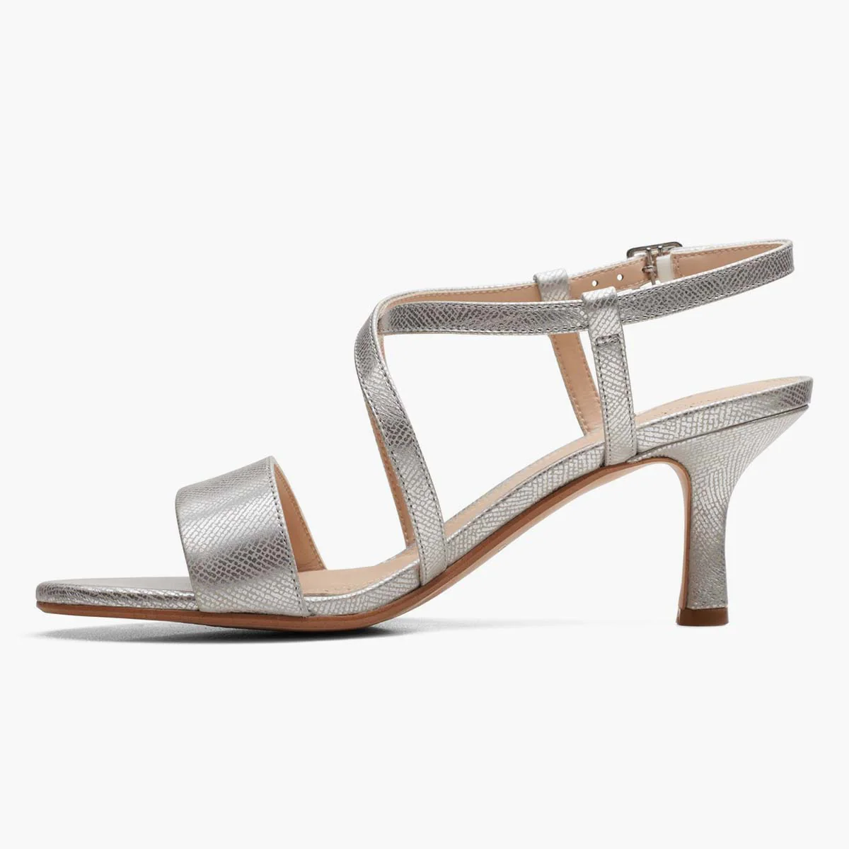 Sandalo strappy con stiletto. Pregiata tomaia in pelle color argento metallizzato. Sottopiede in schiuma parzialmente riciclata Cushion Plus™; per un comfort eco-compatibile. Il cinturino regolabile alla caviglia offre una calzata sicura. Chiusura con fibbia.