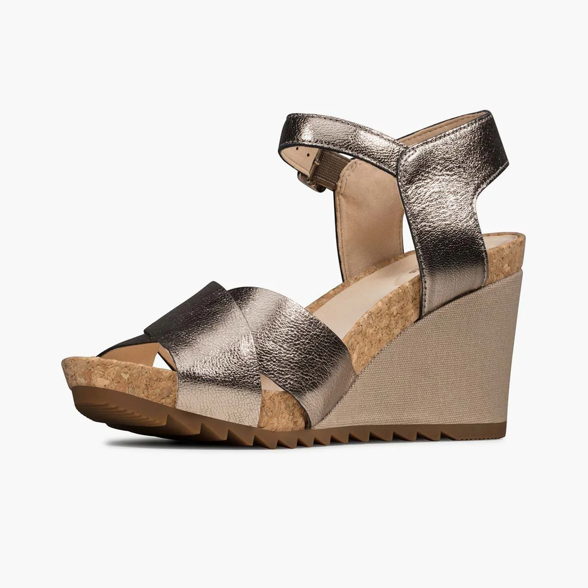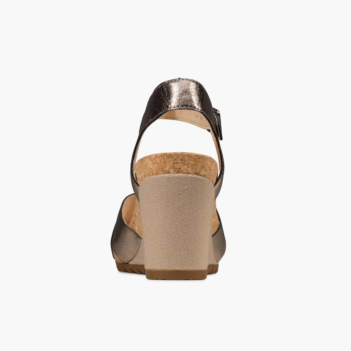 Sandalo con cinturini grigio pietra, una salda chiusura con fibbia e un tacco di 8 cm, una soletta in tessuto su una suola in gomma dentellata e accenti in sughero.