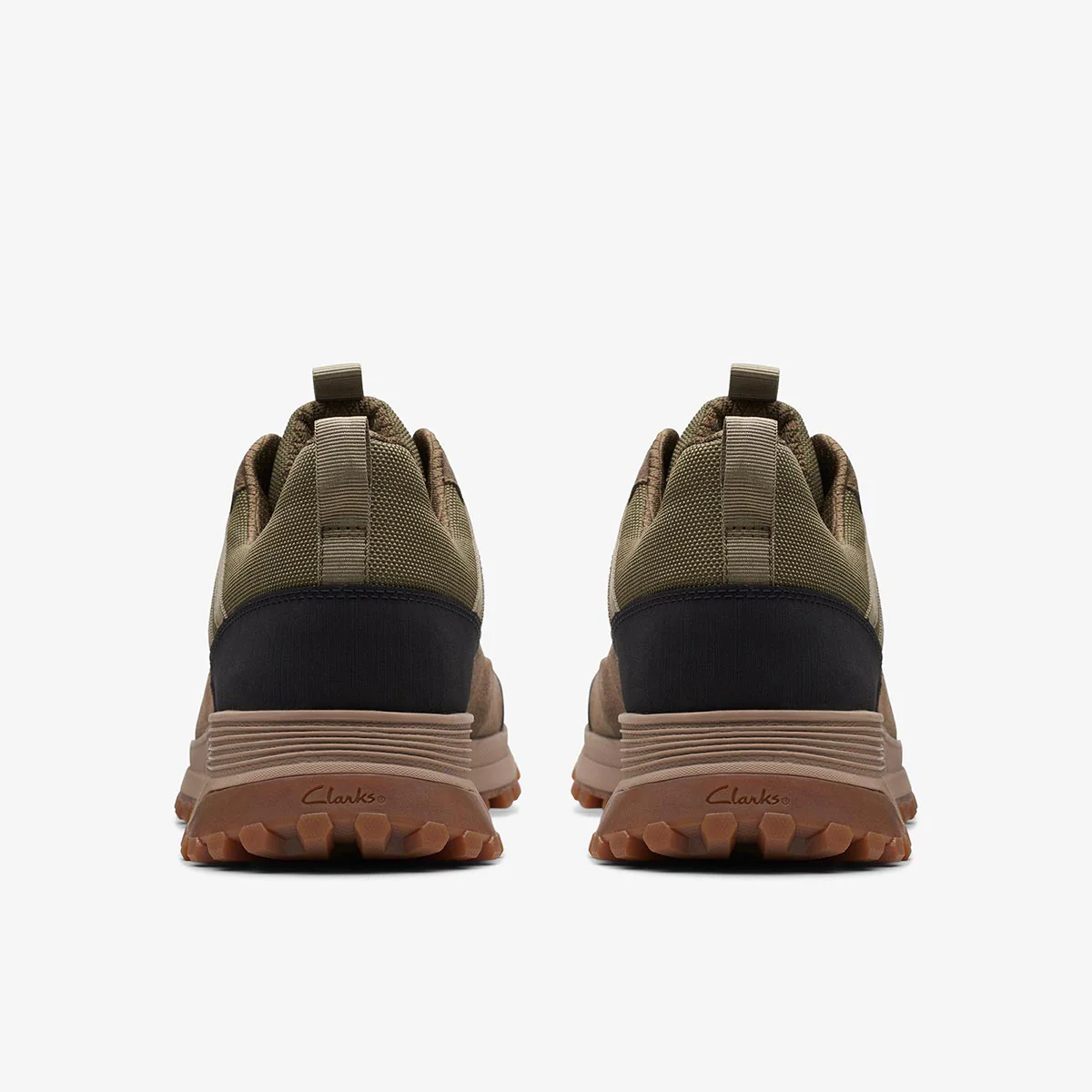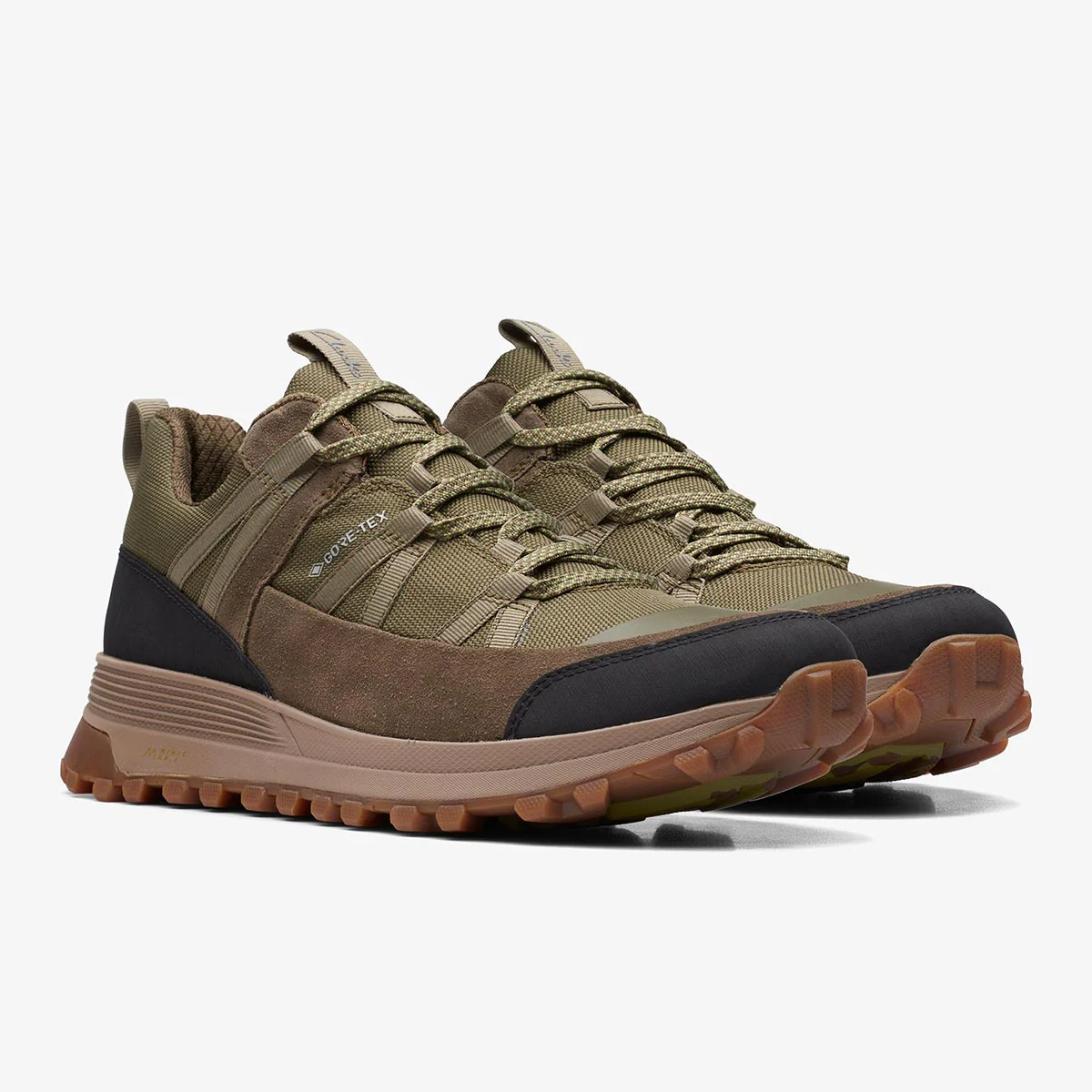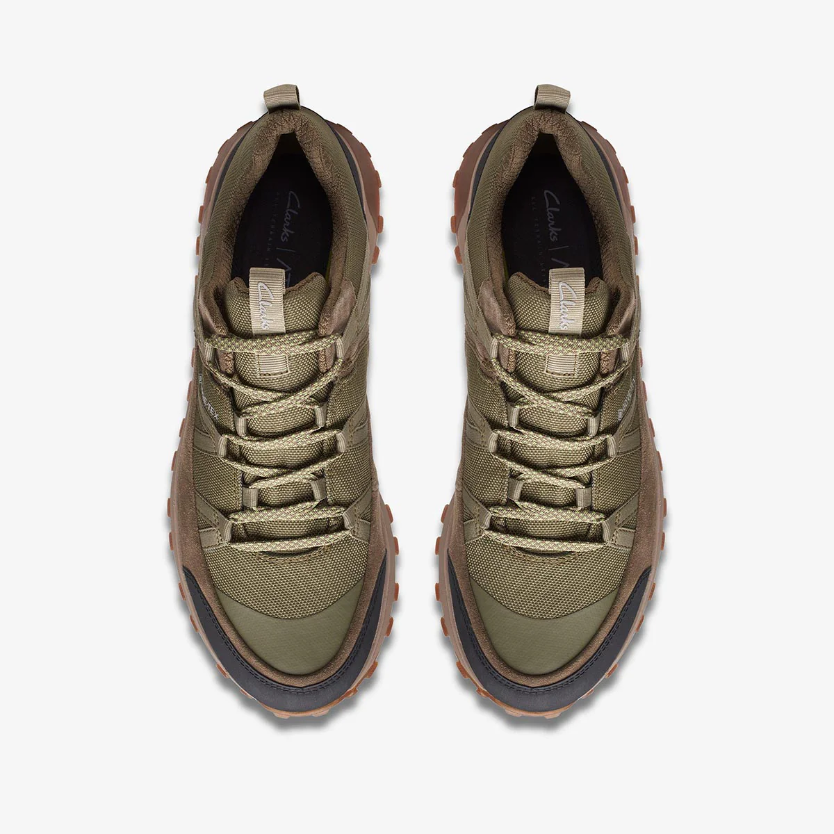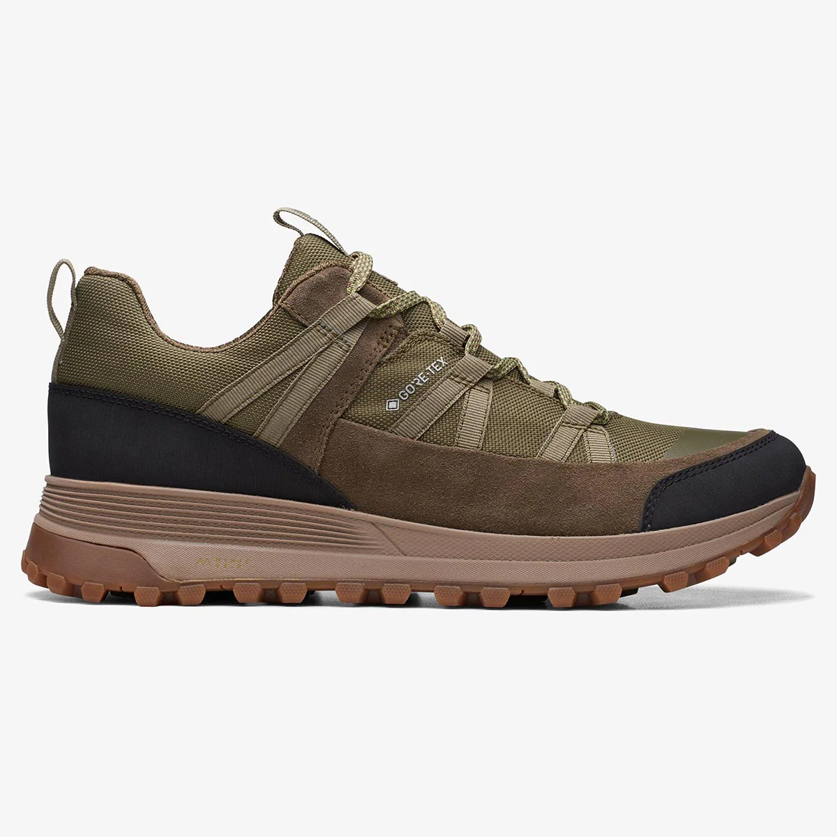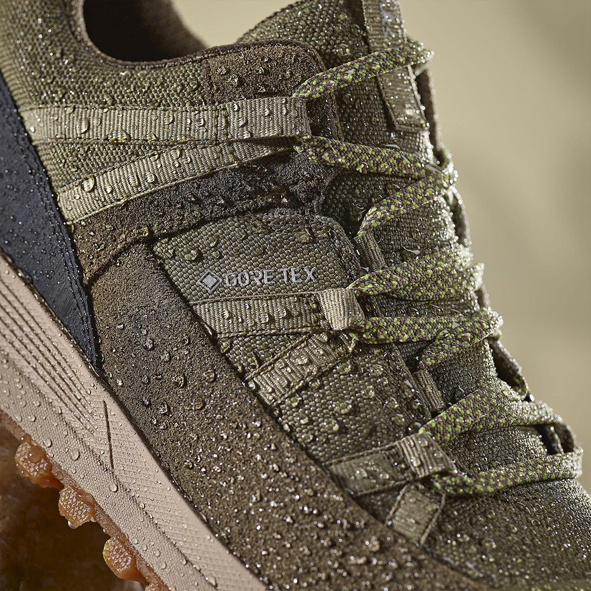 - Tomaia in tessuto oliva scuro traspirante con membrana performante GORE-TEX® Flux che mantiene i piedi asciutti e comodi