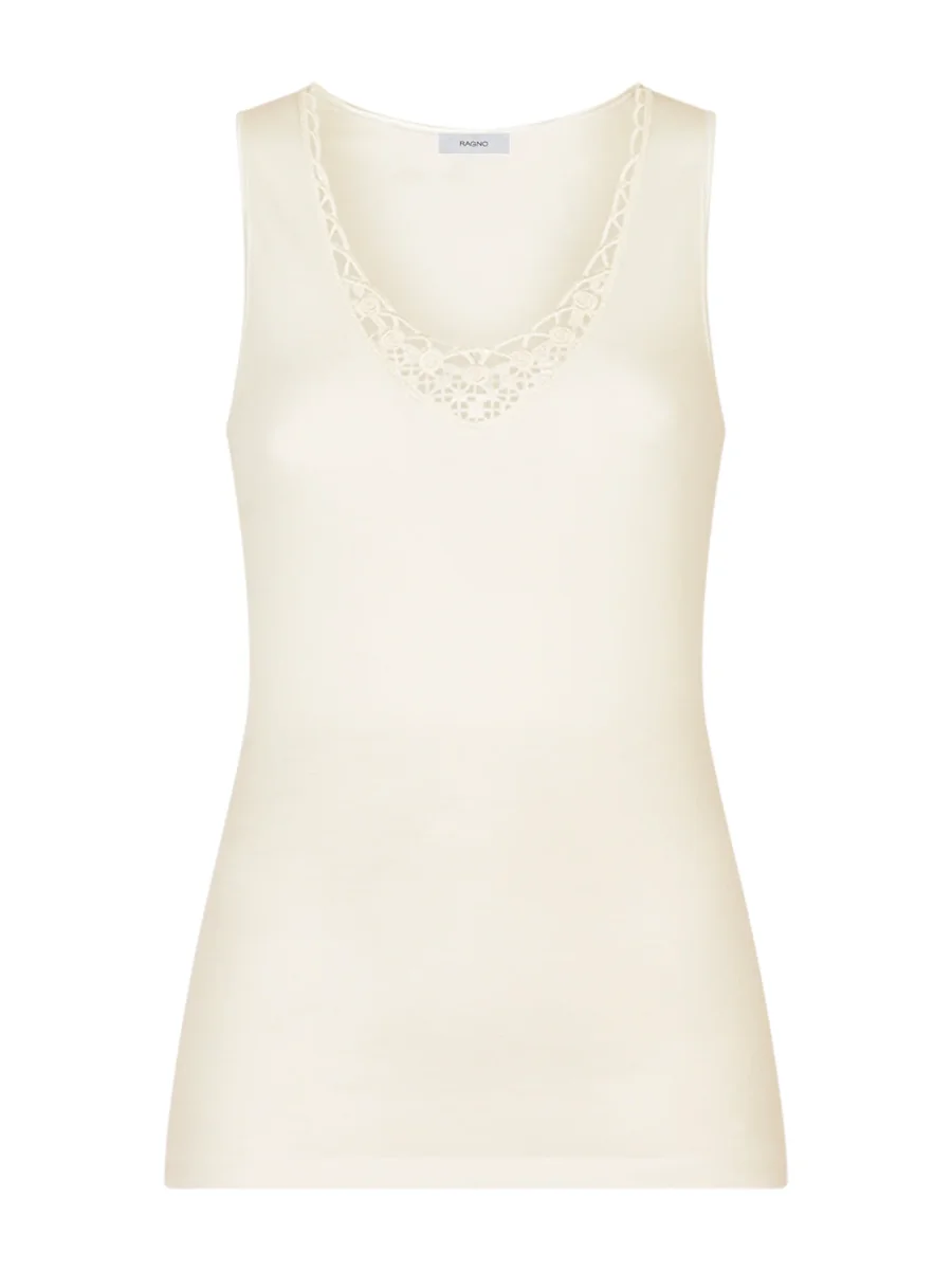 Canottiera a spalla larga in tessuto doubleface realizzato in pura lana fuori e cotone sulla pelle impreziosita dal profilo della scollatura in pizzo.