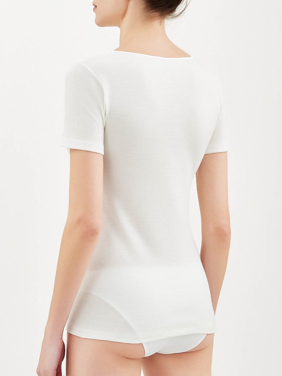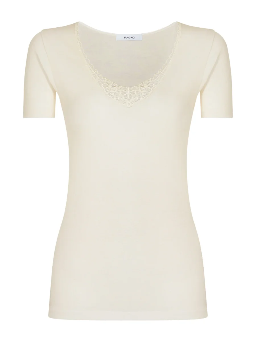 Maglietta a manica corta in tessuto doubleface realizzato in pura lana fuori e cotone sulla pelle impreziosita dal profilo della scollatura in pizzo.