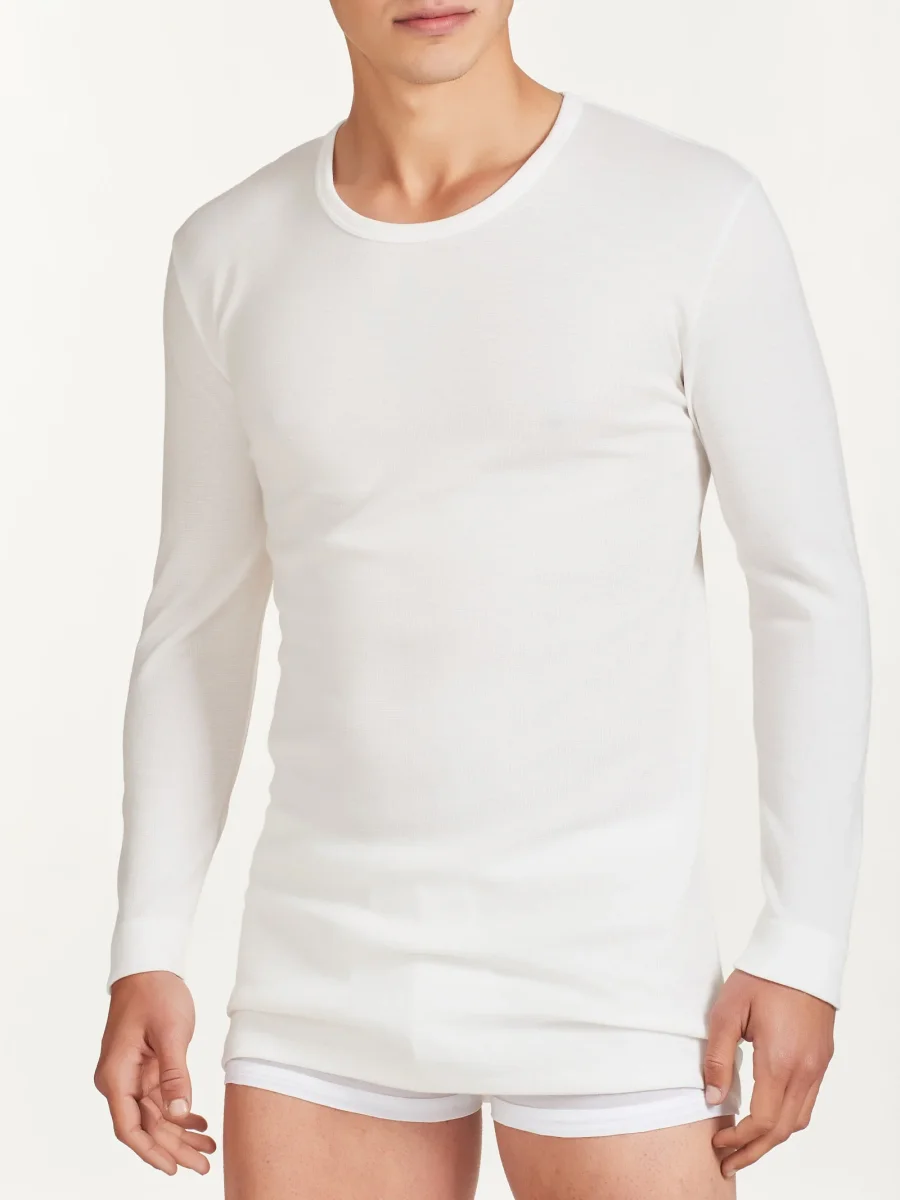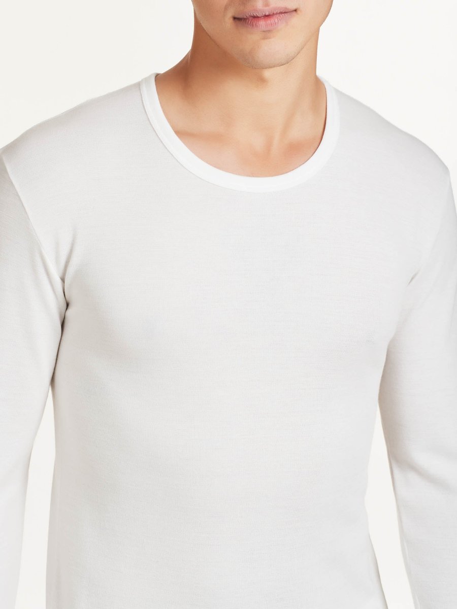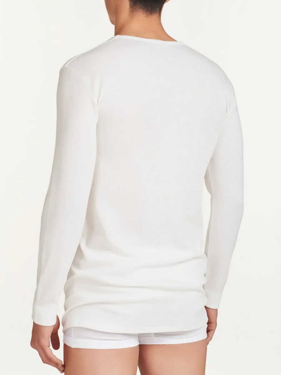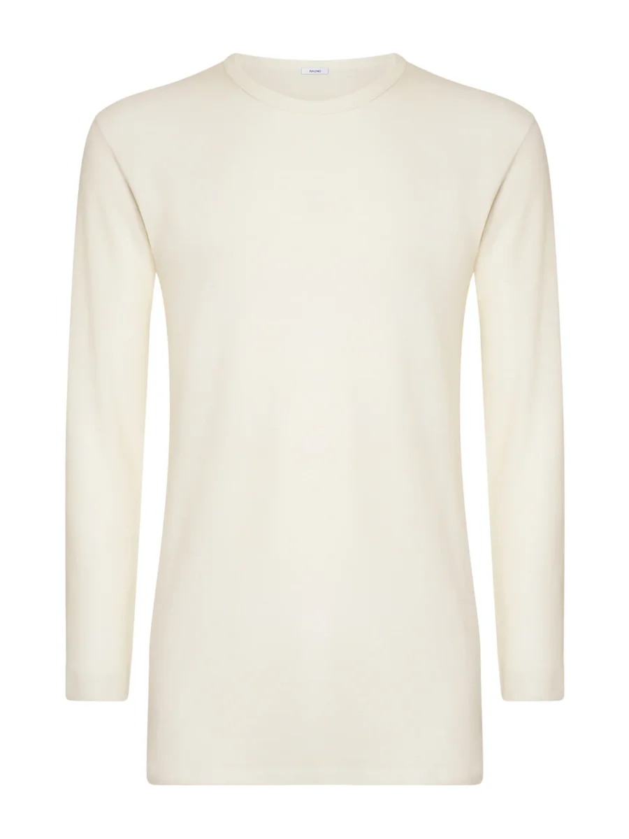 Maglietta girocollo a manica lunga in lana rinforzata fuori e cotone sulla pelle.