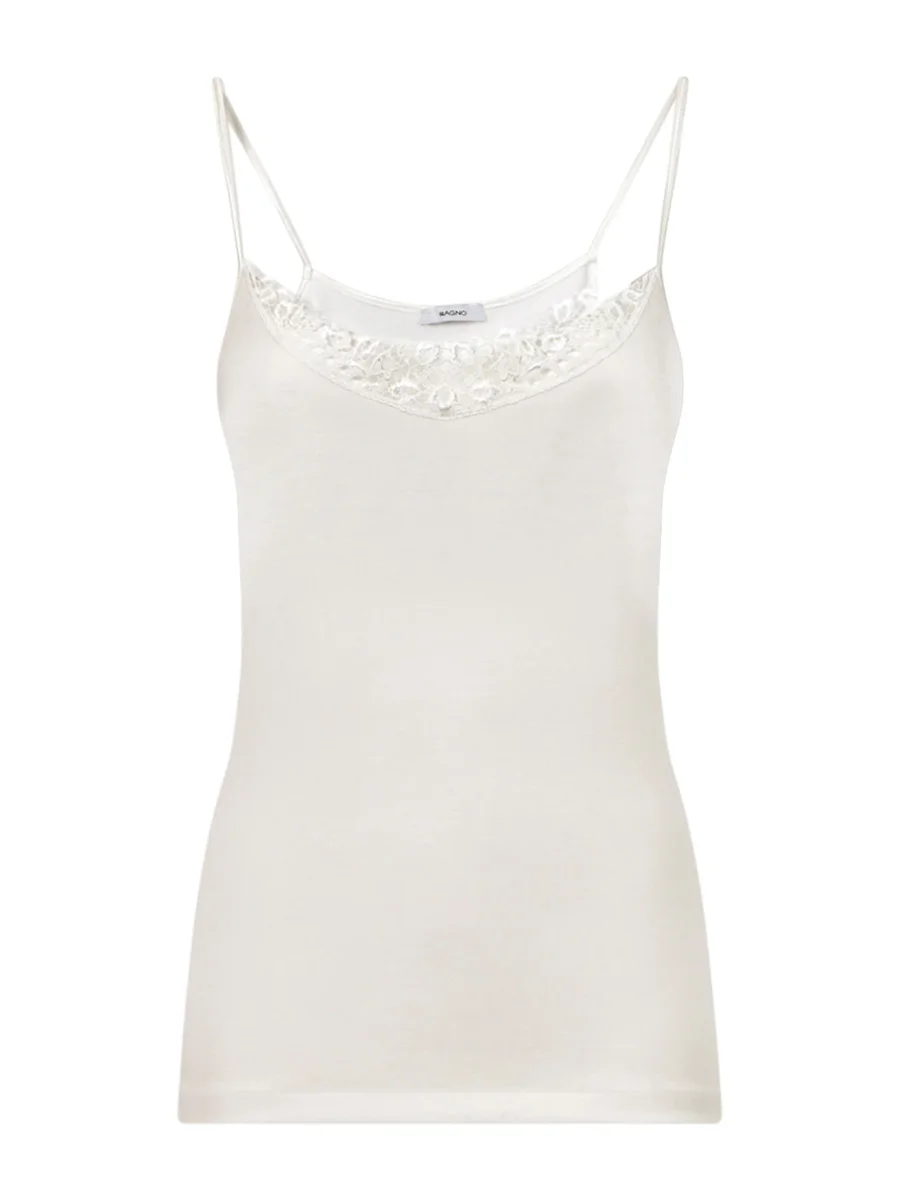 Top in lana rinforzata fuori e cotone sulla pelle con profilo della scollatura in macramè.