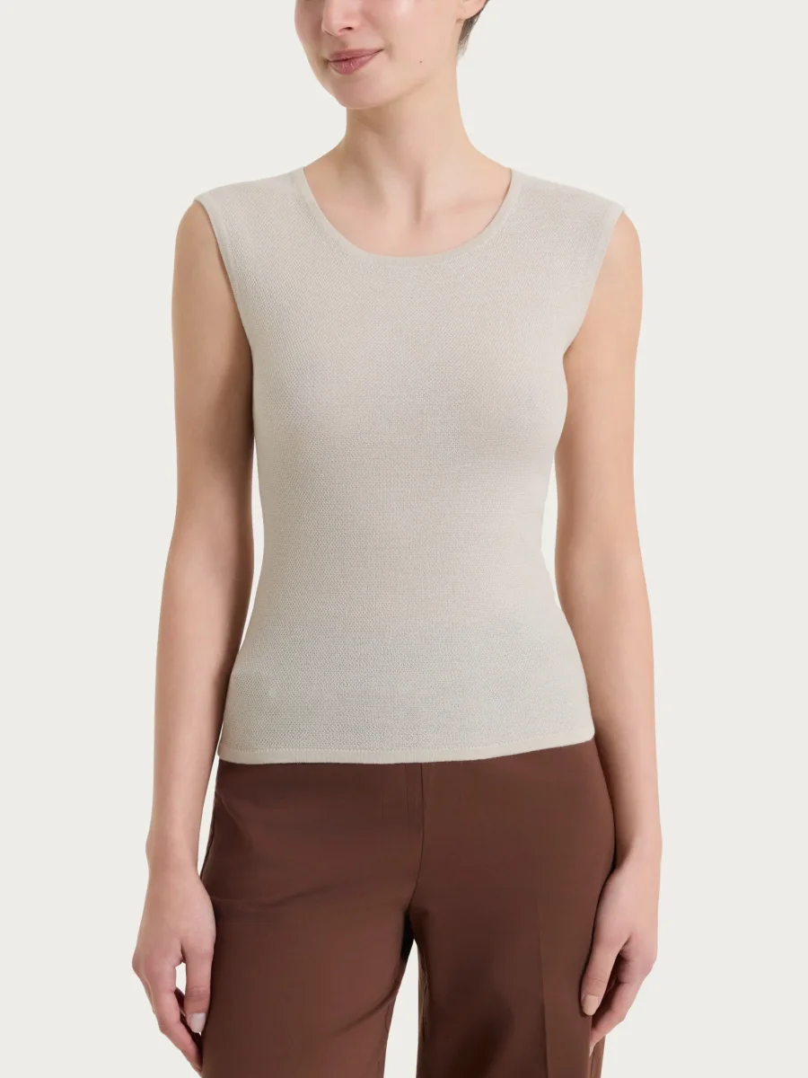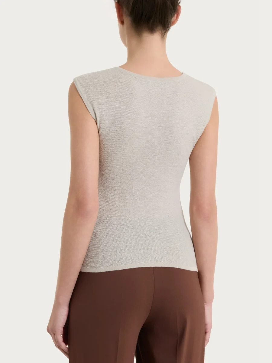 La vestibilità skinny segue le linee del corpo in modo aderente e femminile, definendo la silhouette con un effetto pulito e ordinato. Il girocollo completa il design con una linea essenziale e versatile, perfetta anche per essere indossata sotto giacche o cardigan.