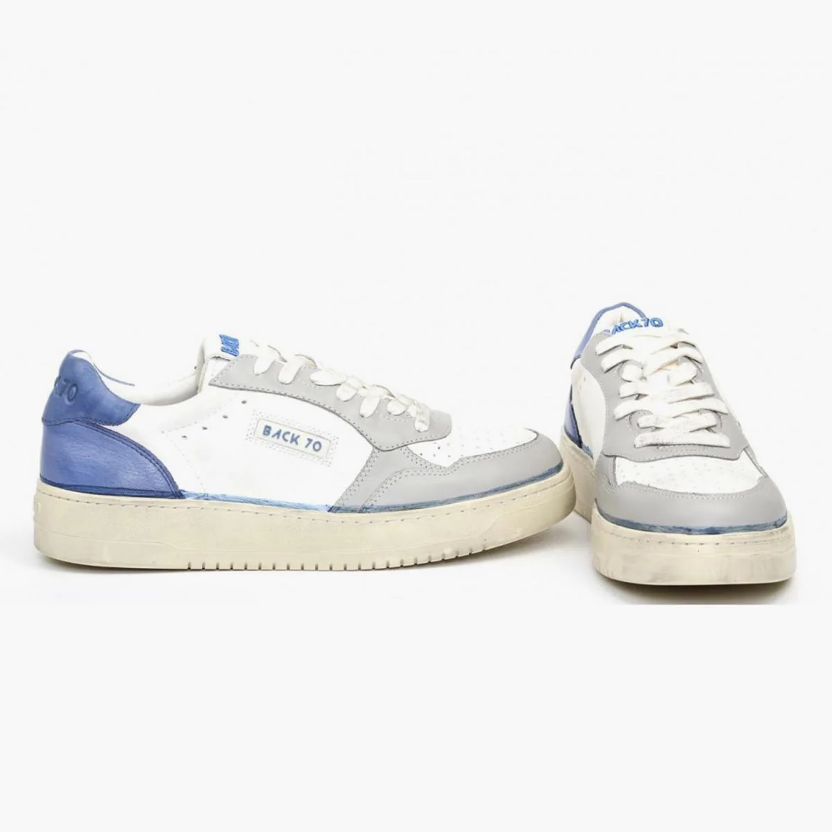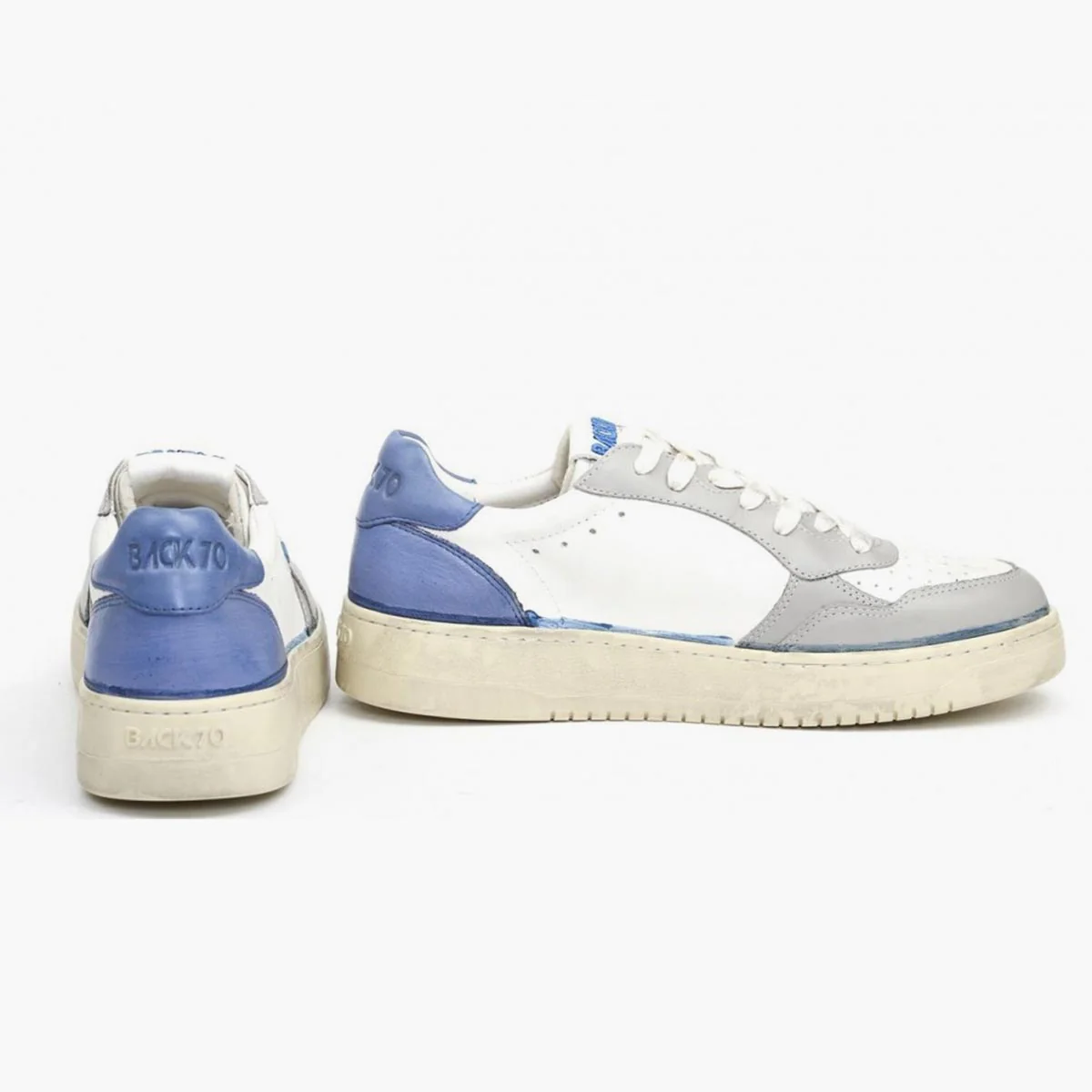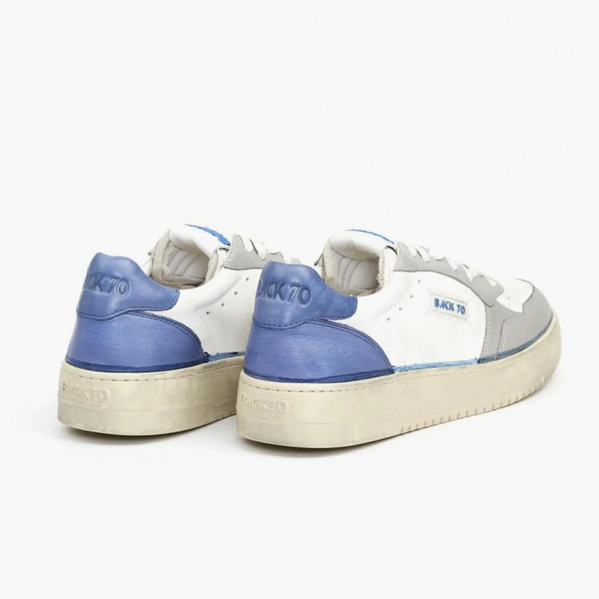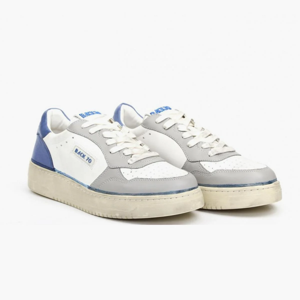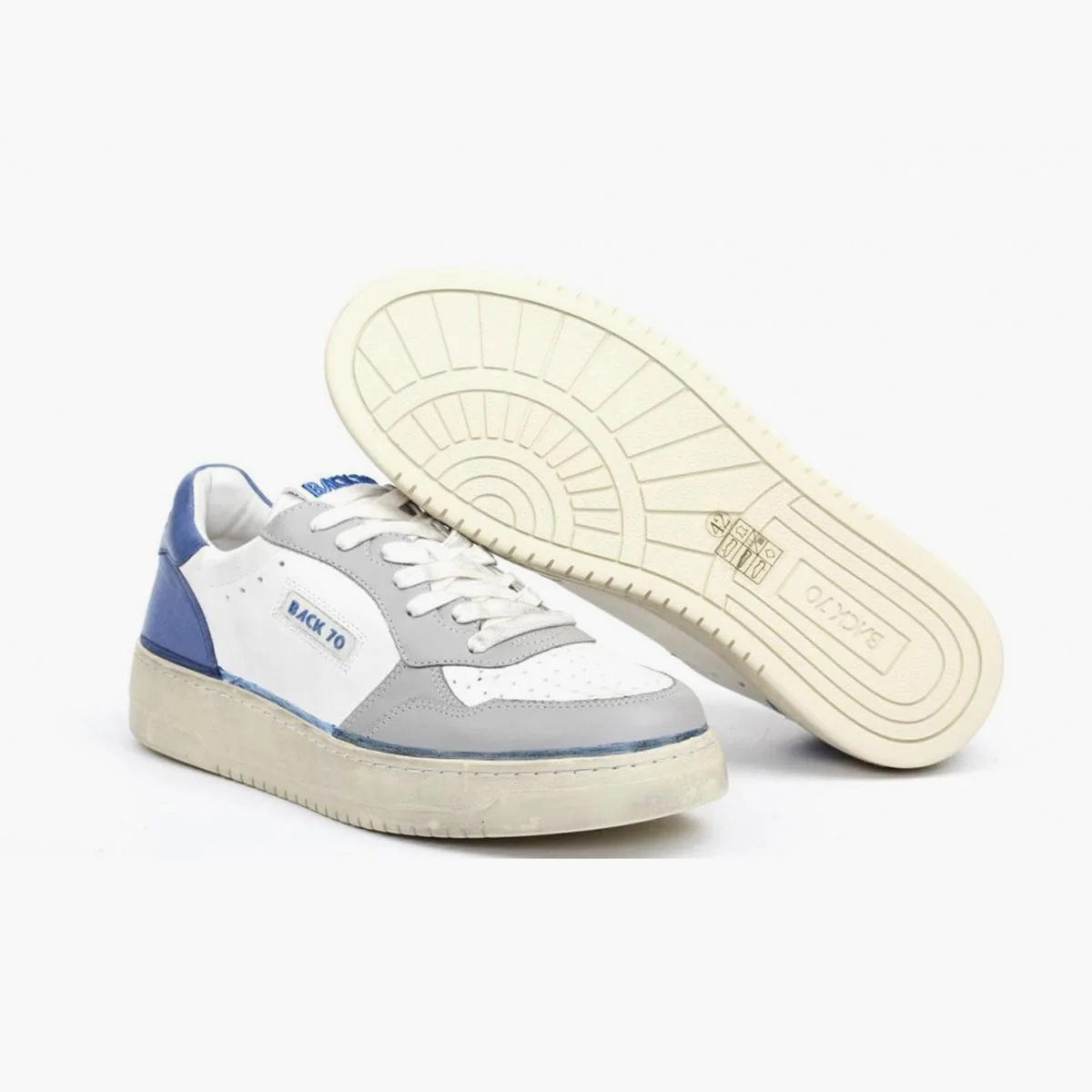 Sneakers Back 70 con tomaia in pelle in colore bianco con rifiniture in contrasto grigie e blu. Punta tonda. Chiusura con lacci. Linguetta con logo. Talloncino in pelle in colore bluette con logo. Suola in gomma. Soletta removibile.