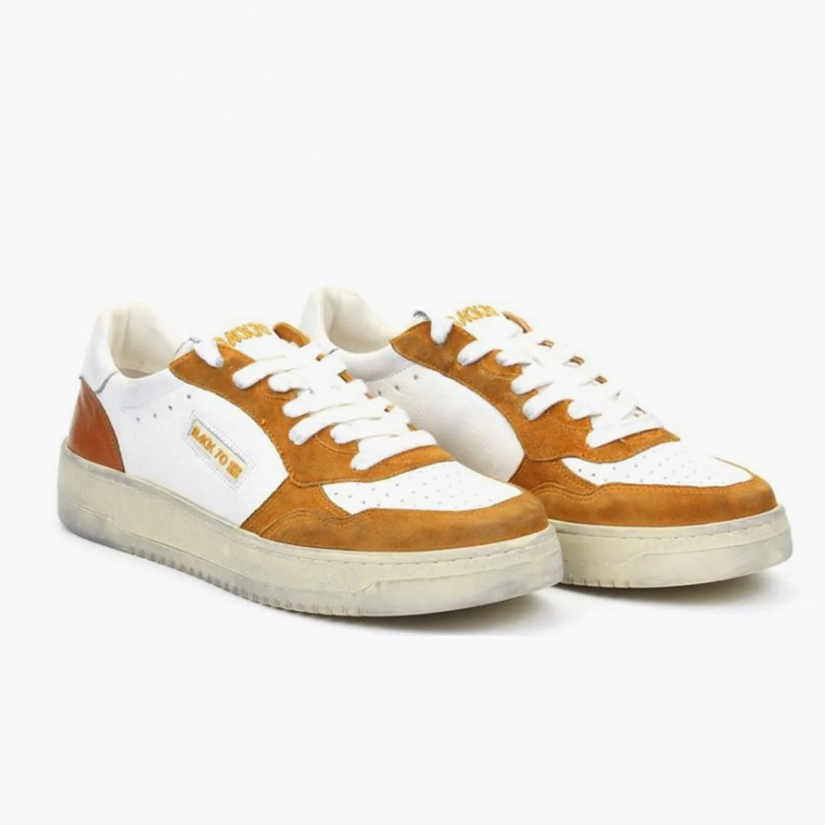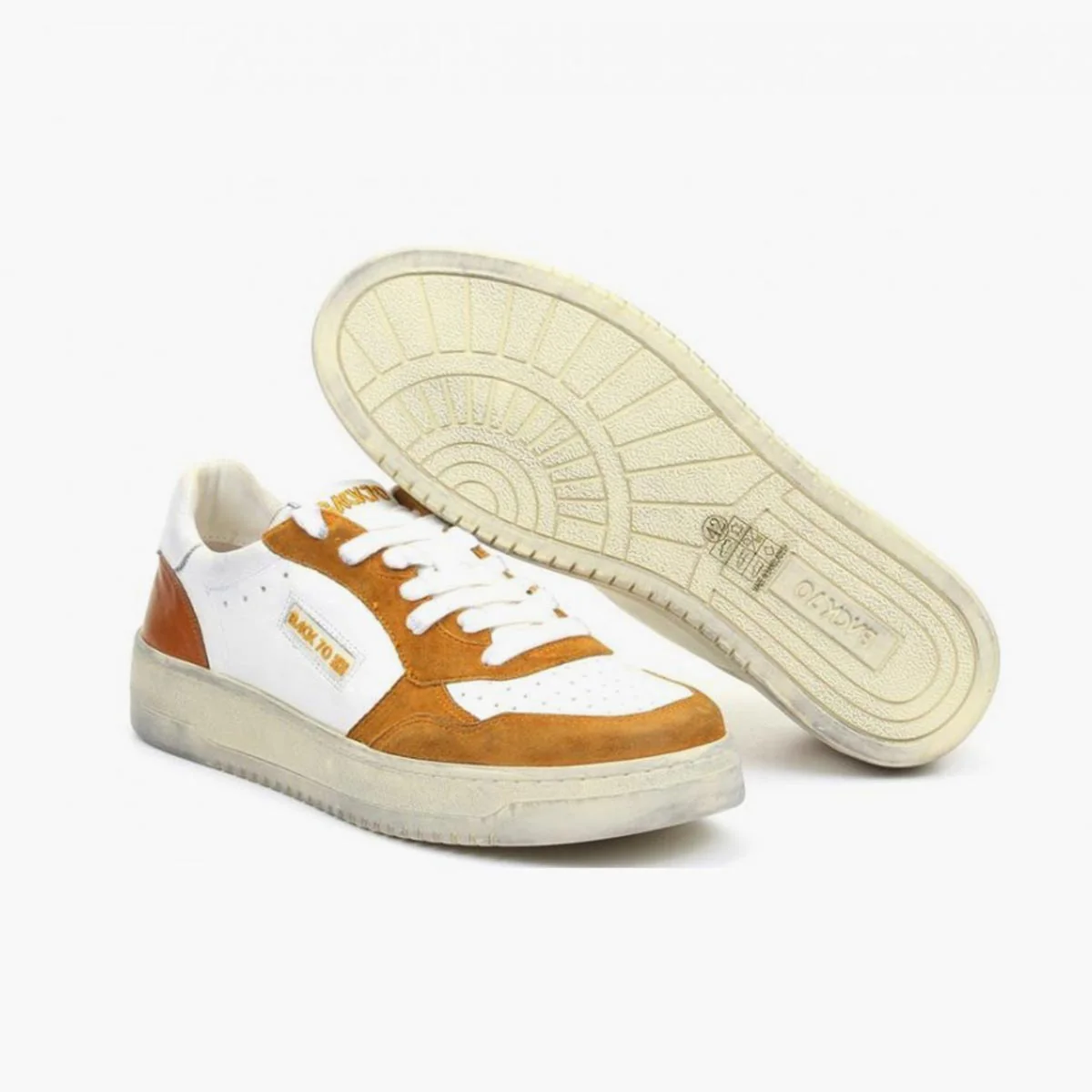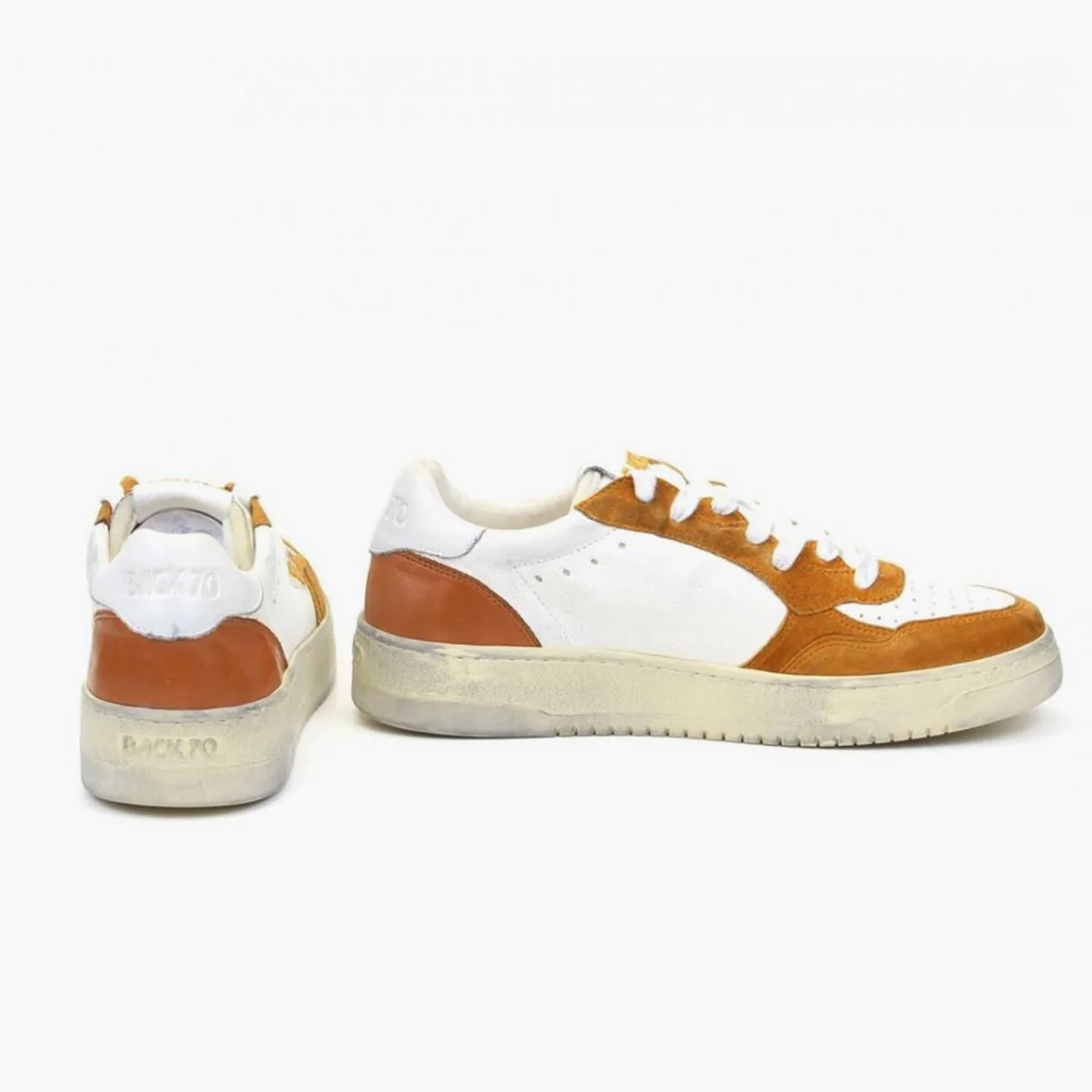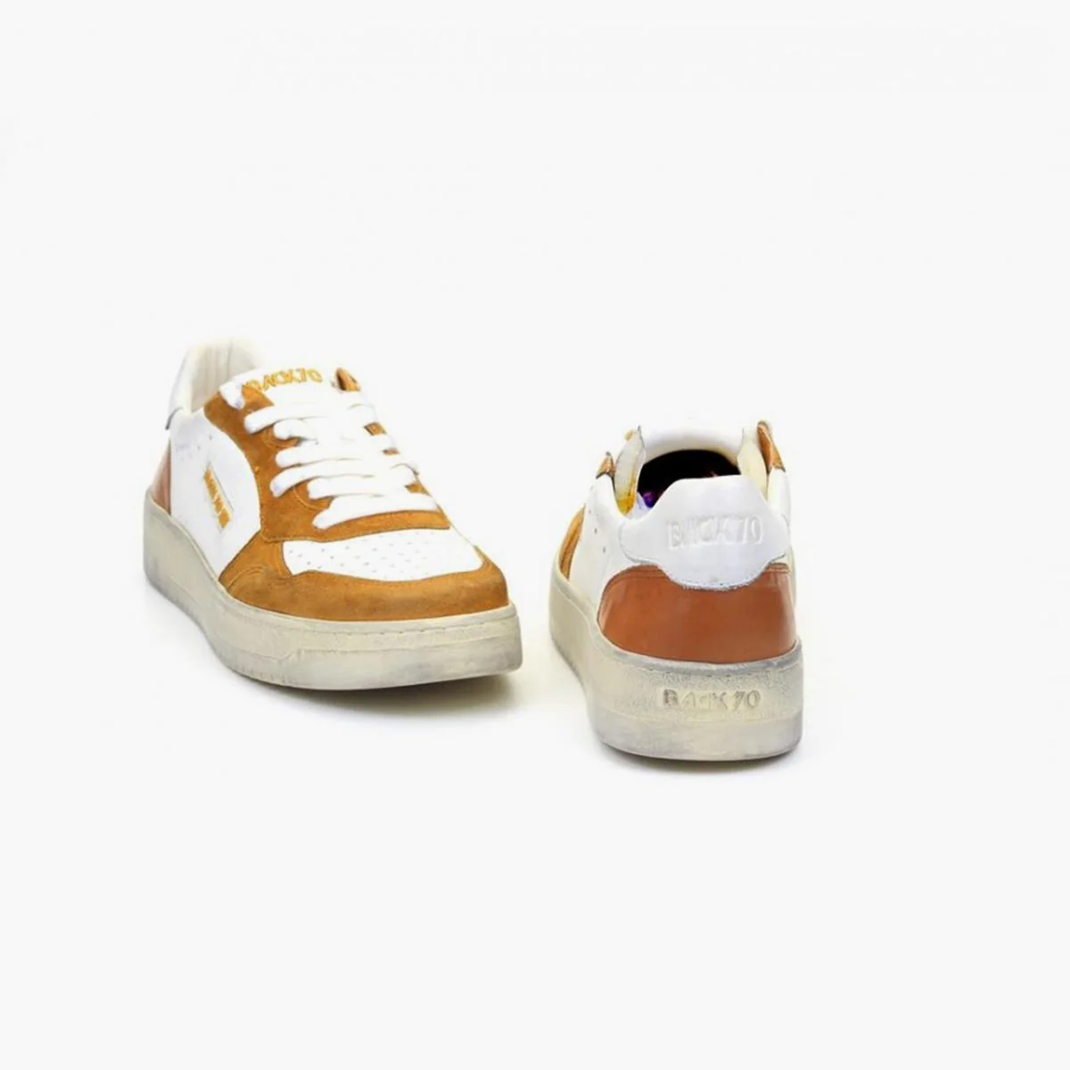 Sneakers Back 70 con tomaia in pelle in colore bianco con rifiniture in camoscio ocra in contrasto colore. Punta tonda. Chiusura con lacci. Linguetta con logo. Talloncino in pelle in colore ocra con logo. Suola in gomma. Soletta removibile.