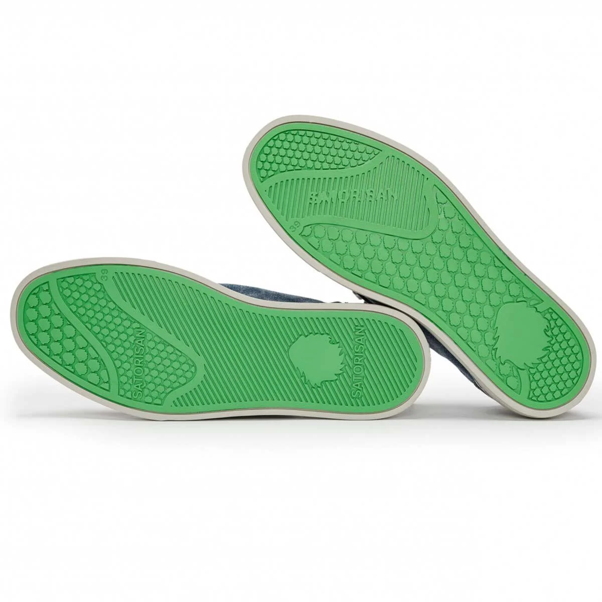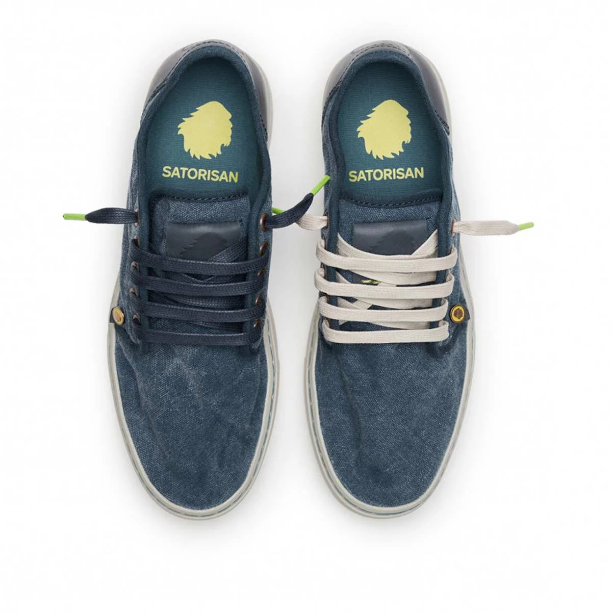 Sneakers con fodera e plantare realizzate in cotone riciclato. Etichetta in nappa cucita a mano sulla linguetta con logo Satorisan impresso a caldo, un paio di lacci extra di colore diverso e solette incluse. Plantare estraibile e suola in gomma.