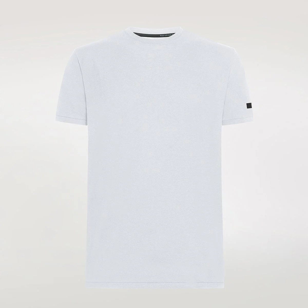 T-shirt effetto fiammato monocroma in cotone crêpe fresco ed elasticizzato. Il comfort è assecondato dal fit regolare, che segue con naturalezza il busto e le spalle agevolandone la scioltezza dei movimenti. Logo nero a microiniezione firma la manica sinistra.