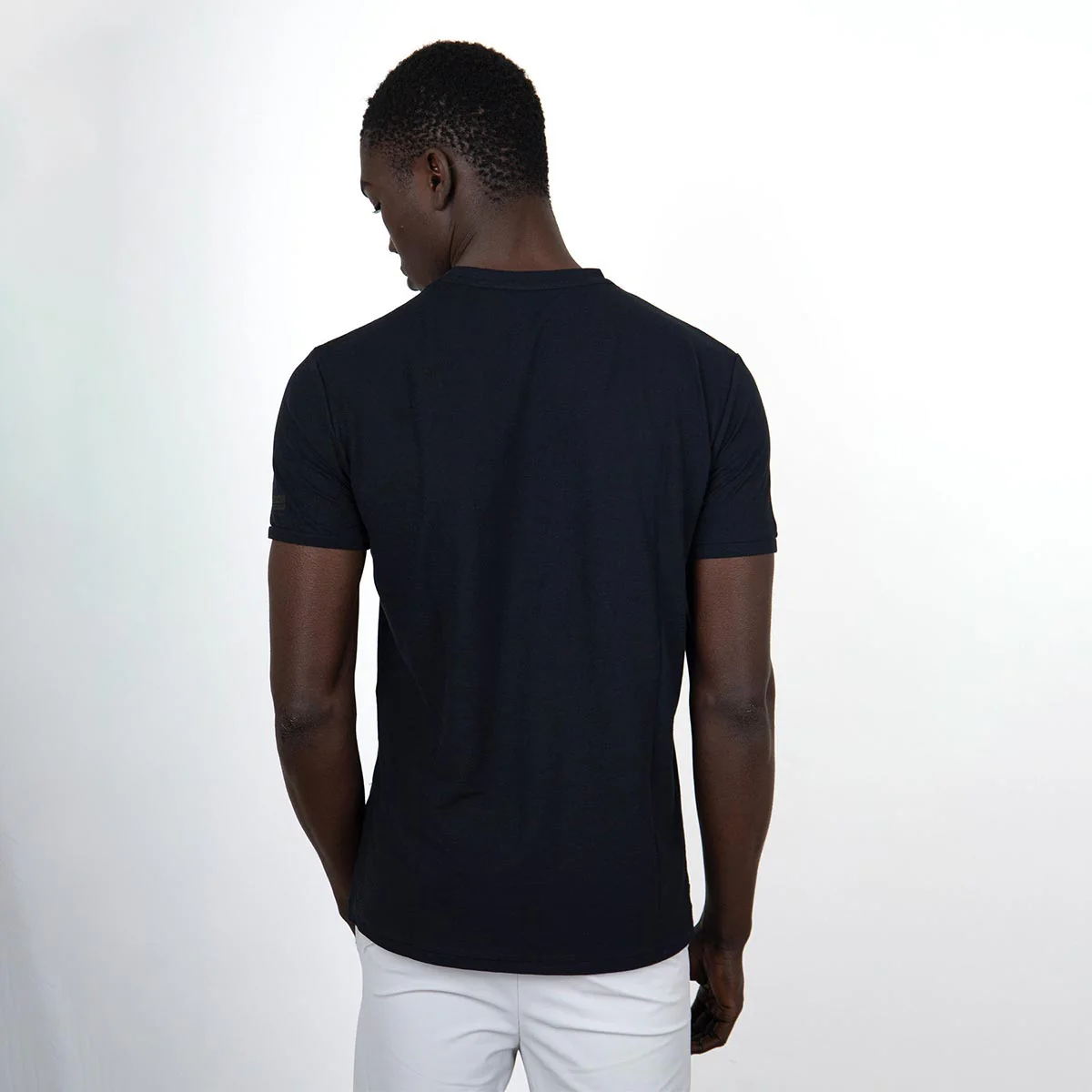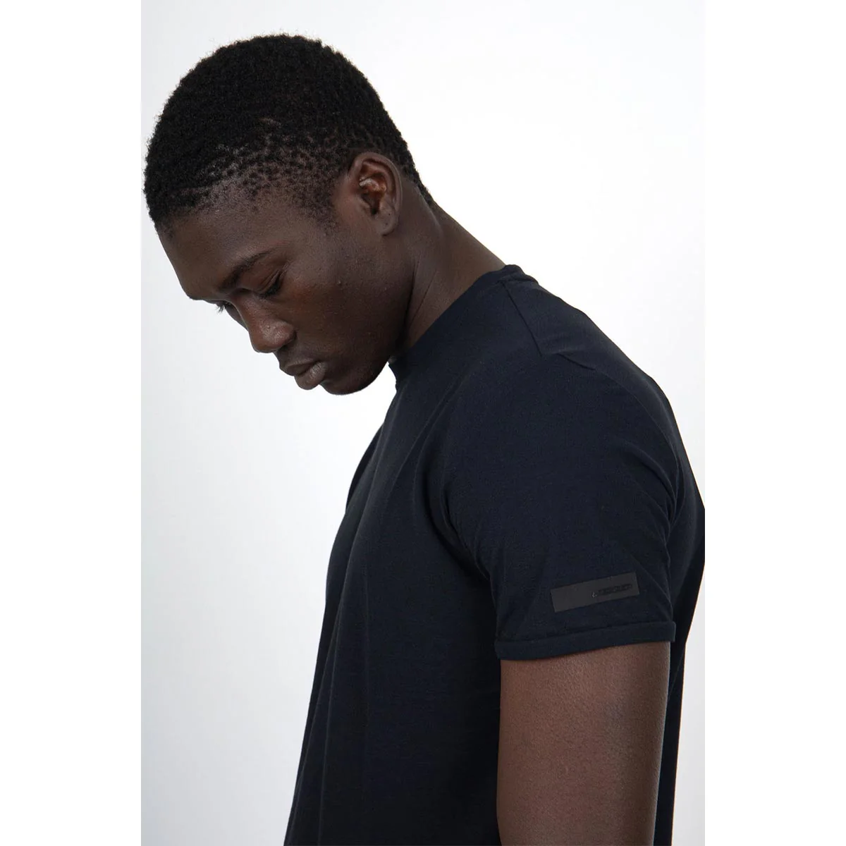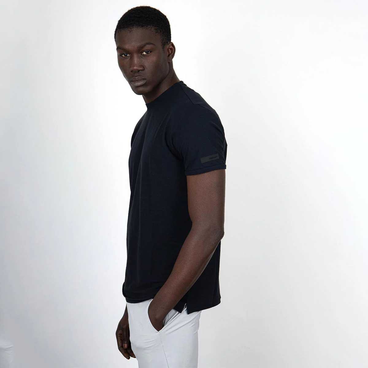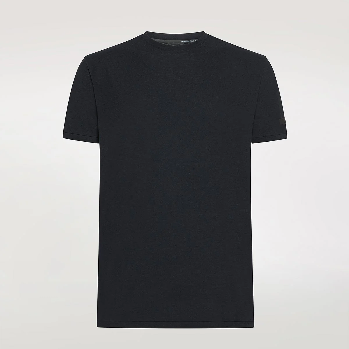 T-shirt effetto fiammato monocroma in cotone crêpe fresco ed elasticizzato. Il comfort è assecondato dal fit regolare, che segue con naturalezza il busto e le spalle agevolandone la scioltezza dei movimenti. Logo nero a microiniezione firma la manica sinistra.