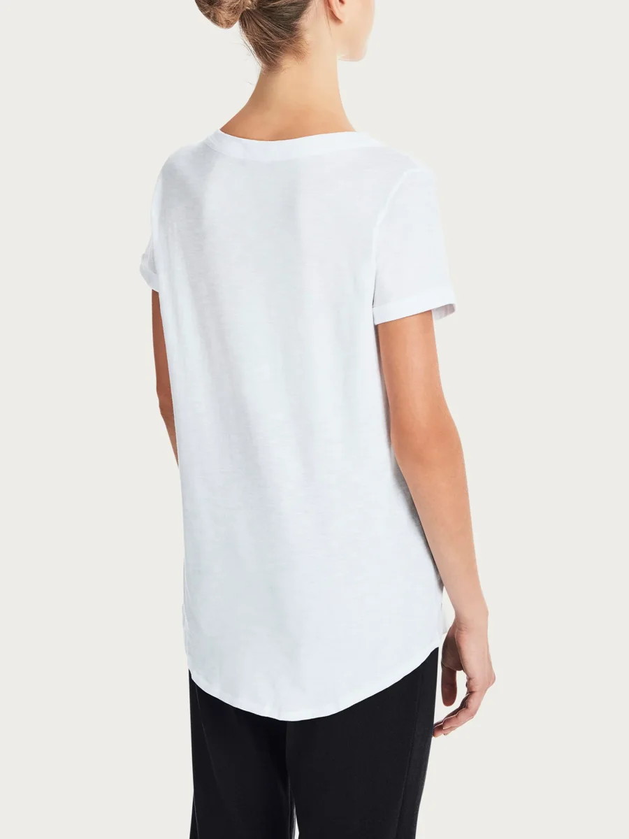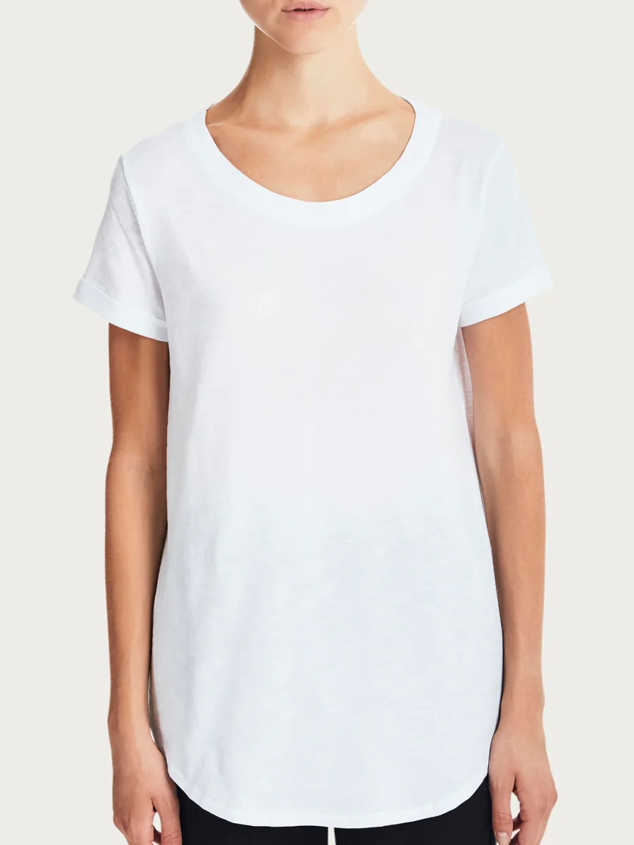 T-shirt girocollo da donna con la manica corta e il fondo svasato.