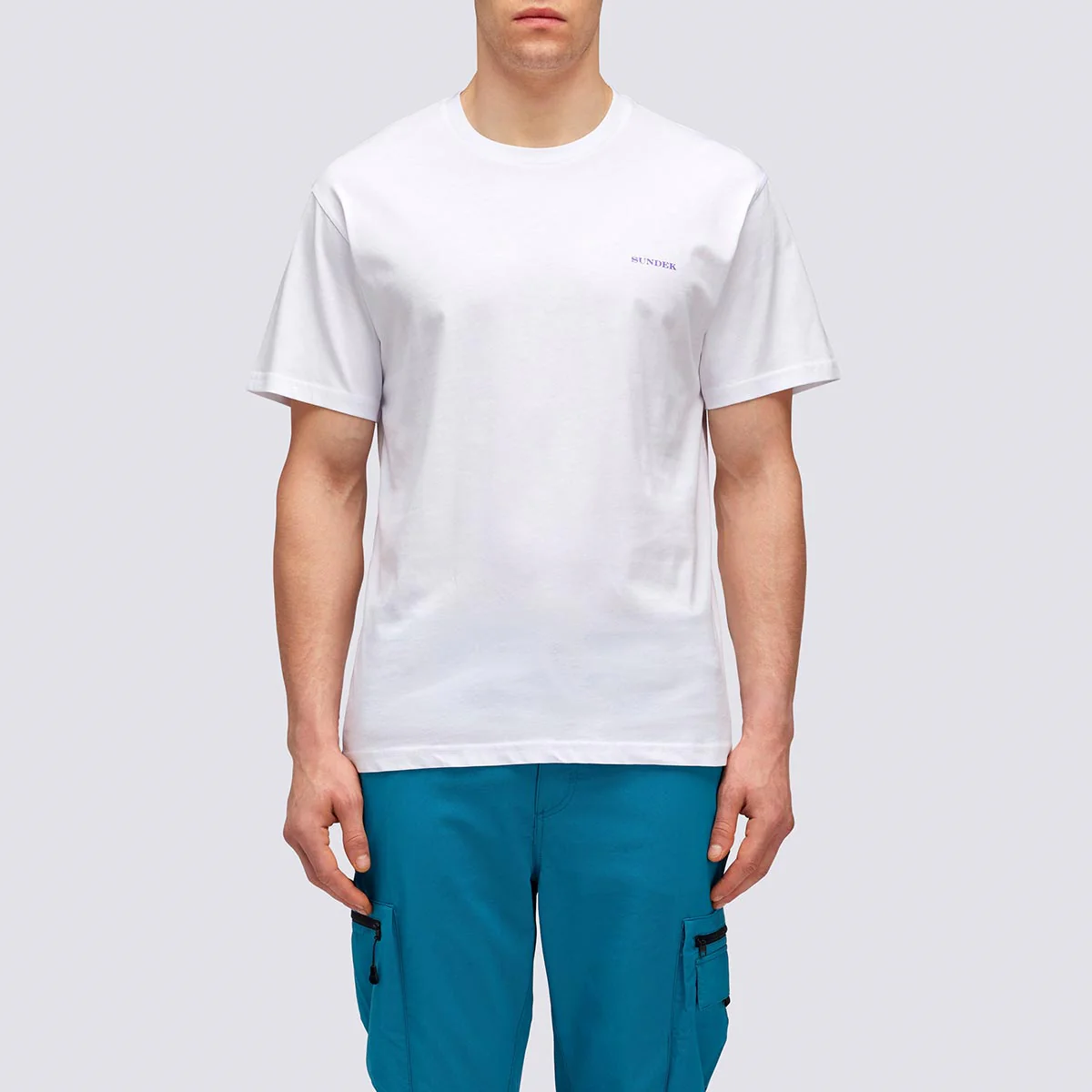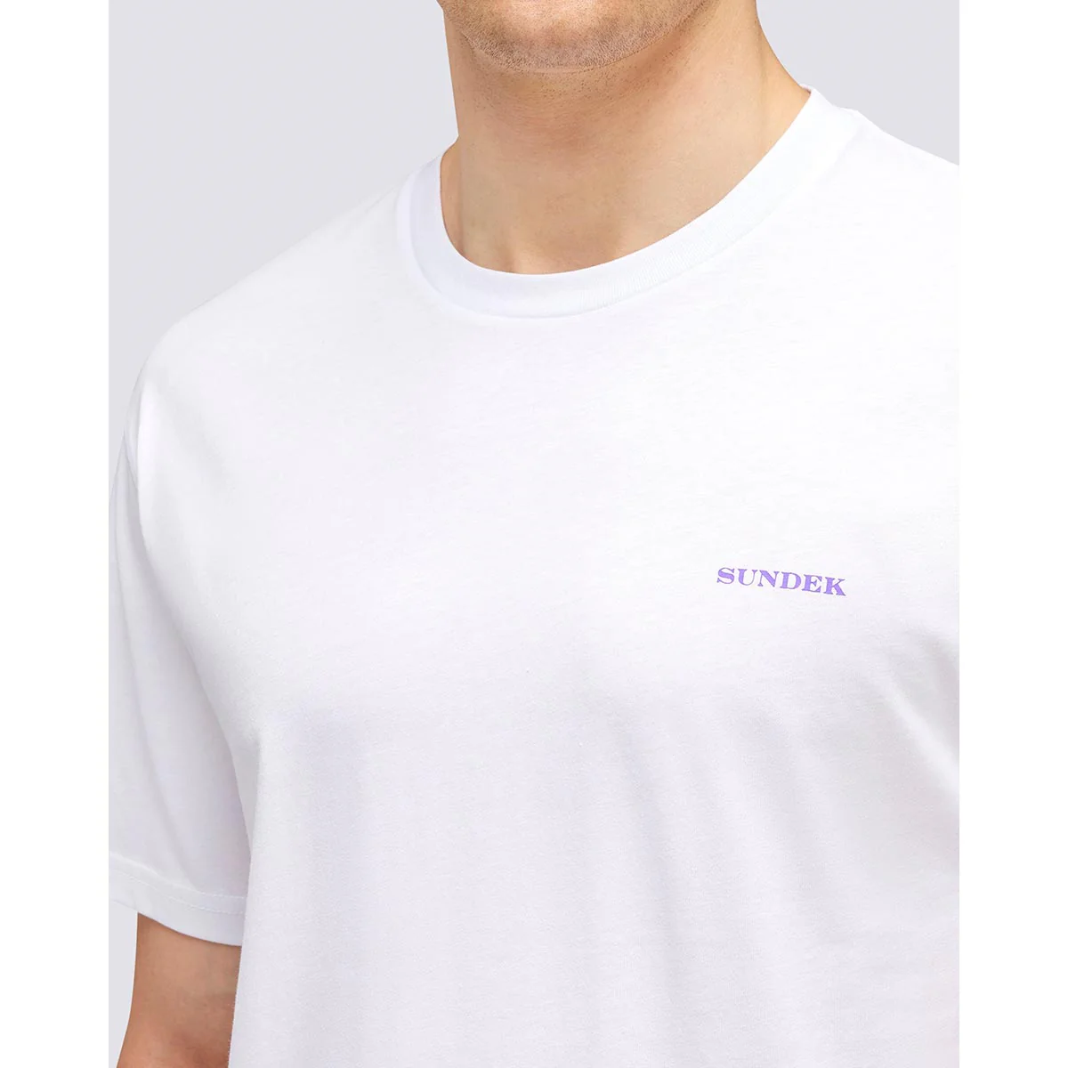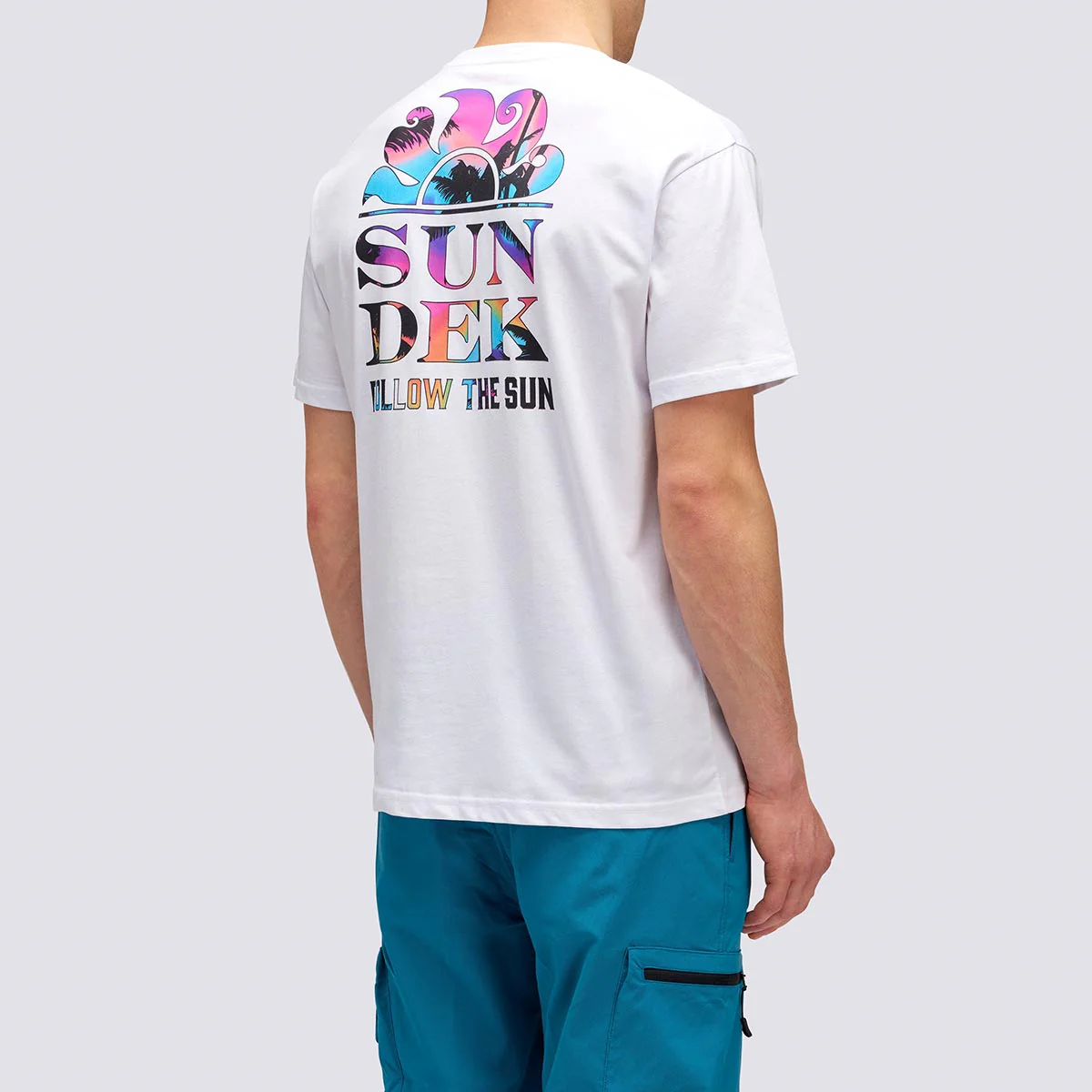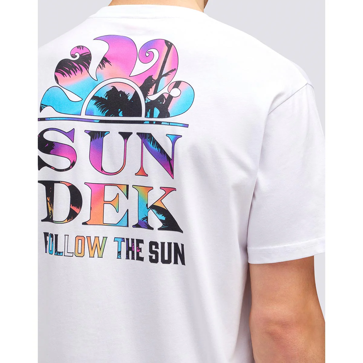 Maglia girocollo con stampa palms trip sul retro. Mini ligo con scritta “Sundek” sul petto in contrasto colore.