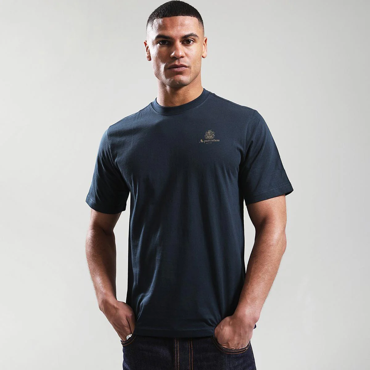 Aquascutum marchio storico britannico. Realizzata in 100% cotone e caratterizzata da un micro logo stampato in plastisol sul petto a sinistra, questa T-shirt ha una comoda vestibilità regolare/larga.