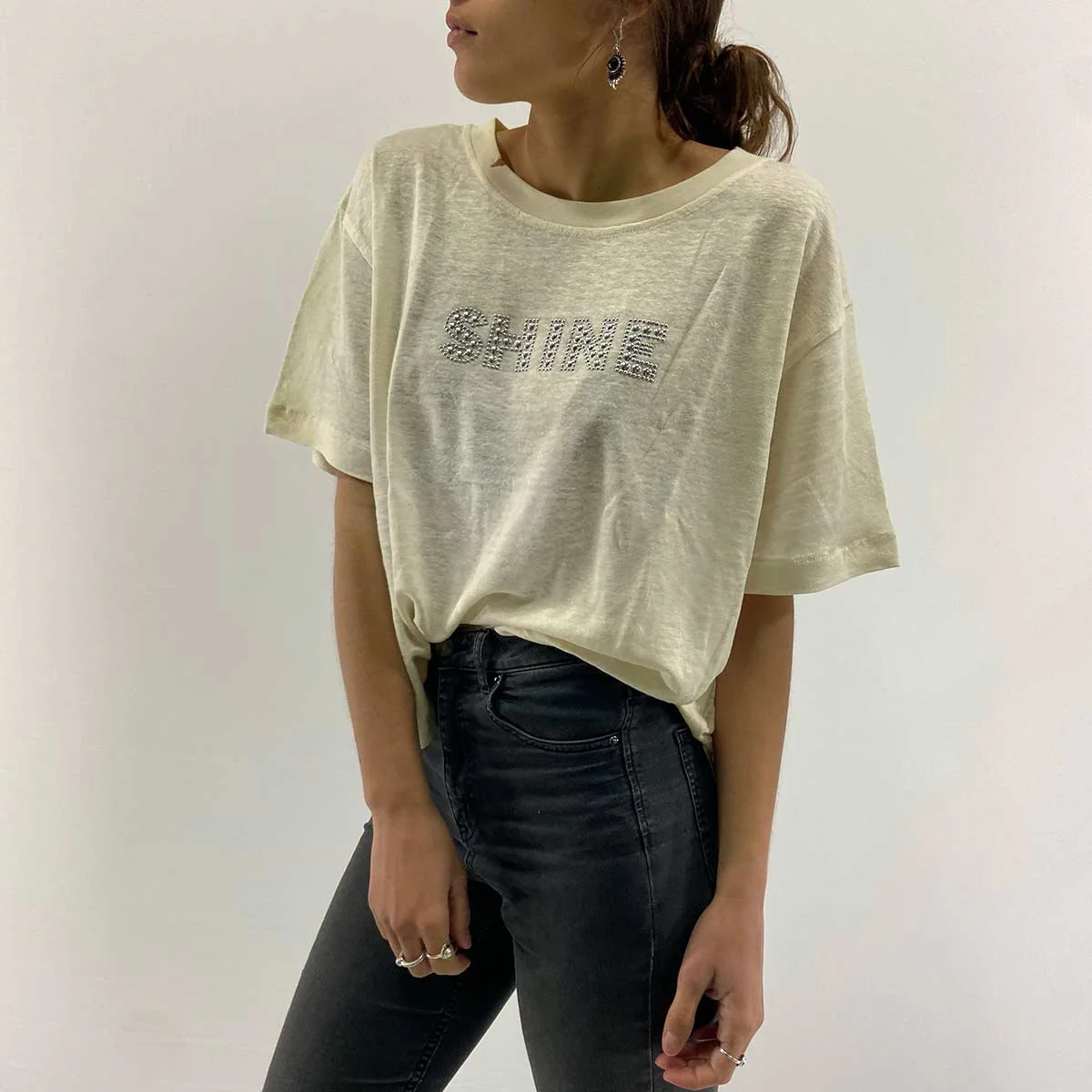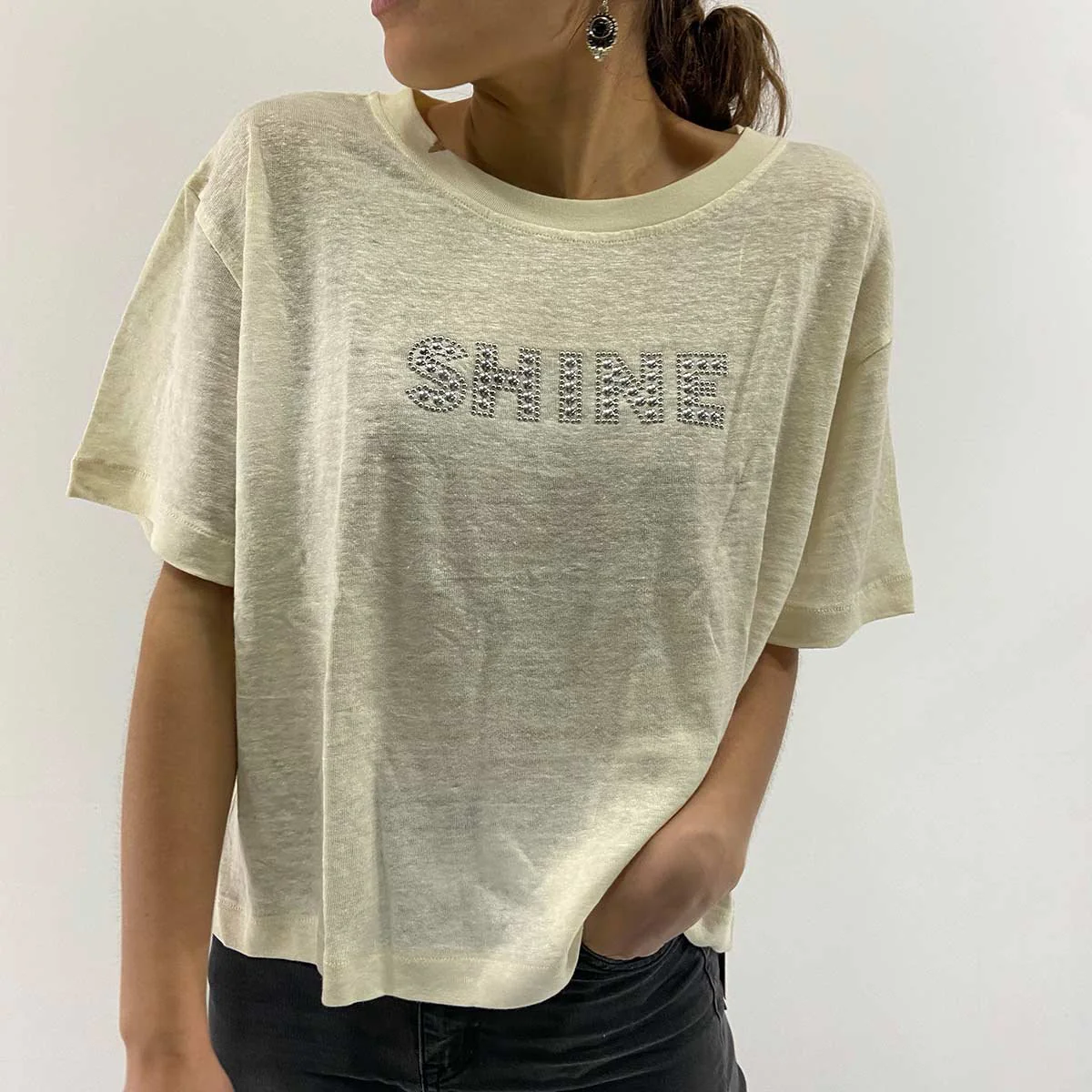 T-shirt in lino panna con borchie